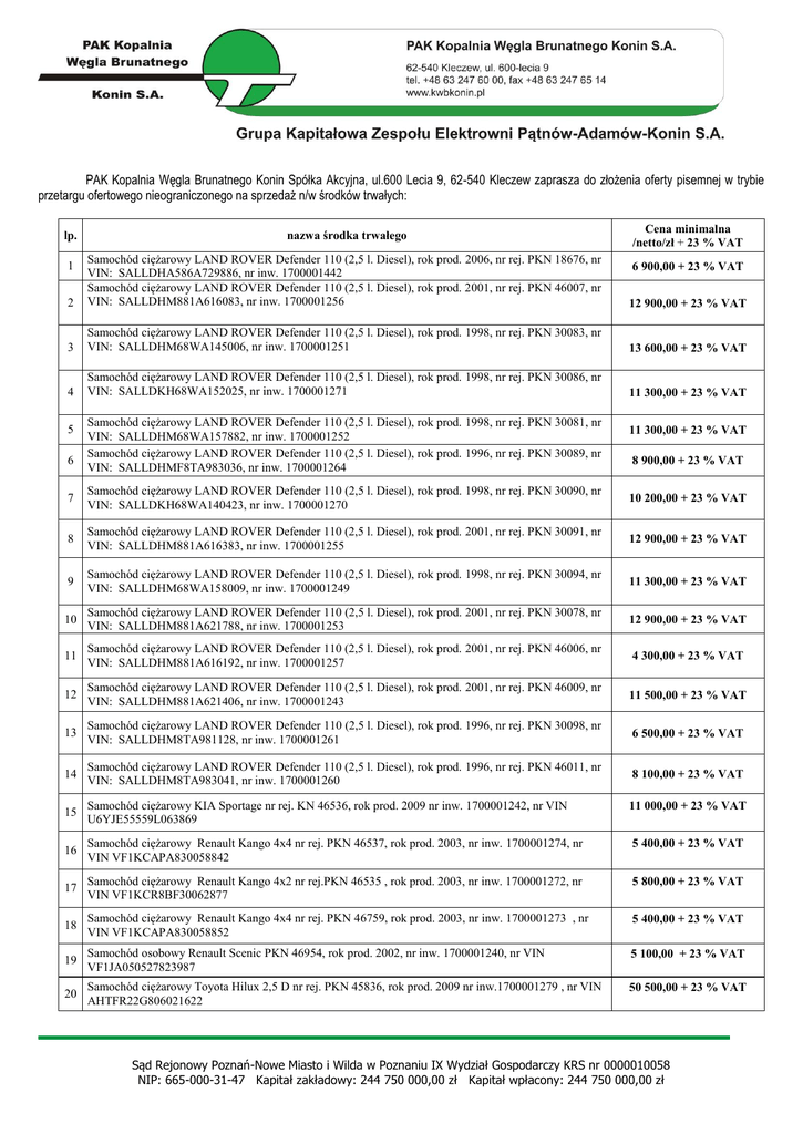 PAK Kopalnia Węgla Brunatnego Konin Spółka Akcyjna, ul.600 Lecia 9, 62-540 Kleczew zaprasza do złożenia oferty pisemnej w trybie przetargu ofertowego nieograniczonego na sprzedaż n/w środków trwałych: lp. nazwa środka trwałego Cena minimalna /netto/zł + 23 % VAT 2 Samochód ciężarowy LAND ROVER Defender 110 (2,5 l. Diesel), rok prod. 2006, nr rej. PKN 18676, nr VIN: SALLDHA586A729886, nr inw. 1700001442 Samochód ciężarowy LAND ROVER Defender 110 (2,5 l. Diesel), rok prod. 2001, nr rej. PKN 46007, nr VIN: SALLDHM881A616083, nr inw. 1700001256 12 900,00 + 23 % VAT 3 Samochód ciężarowy LAND ROVER Defender 110 (2,5 l. Diesel), rok prod. 1998, nr rej. PKN 30083, nr VIN: SALLDHM68WA145006, nr inw. 1700001251 13 600,00 + 23 % VAT 4 Samochód ciężarowy LAND ROVER Defender 110 (2,5 l. Diesel), rok prod. 1998, nr rej. PKN 30086, nr VIN: SALLDKH68WA152025, nr inw. 1700001271 11 300,00 + 23 % VAT 1 5 6 Samochód ciężarowy LAND ROVER Defender 110 (2,5 l. Diesel), rok prod. 1998, nr rej. PKN 30081, nr VIN: SALLDHM68WA157882, nr inw. 1700001252 Samochód ciężarowy LAND ROVER Defender 110 (2,5 l. Diesel), rok prod. 1996, nr rej. PKN 30089, nr VIN: SALLDHMF8TA983036, nr inw. 1700001264 6 900,00 + 23 % VAT 11 300,00 + 23 % VAT 8 900,00 + 23 % VAT 7 Samochód ciężarowy LAND ROVER Defender 110 (2,5 l. Diesel), rok prod. 1998, nr rej. PKN 30090, nr VIN: SALLDKH68WA140423, nr inw. 1700001270 10 200,00 + 23 % VAT 8 Samochód ciężarowy LAND ROVER Defender 110 (2,5 l. Diesel), rok prod. 2001, nr rej. PKN 30091, nr VIN: SALLDHM881A616383, nr inw. 1700001255 12 900,00 + 23 % VAT 9 Samochód ciężarowy LAND ROVER Defender 110 (2,5 l. Diesel), rok prod. 1998, nr rej. PKN 30094, nr VIN: SALLDHM68WA158009, nr inw. 1700001249 11 300,00 + 23 % VAT 10 Samochód ciężarowy LAND ROVER Defender 110 (2,5 l. Diesel), rok prod. 2001, nr rej. PKN 30078, nr VIN: SALLDHM881A621788, nr inw. 1700001253 12 900,00 + 23 % VAT 11 Samochód ciężarowy LAND ROVER Defender 110 (2,5 l. Diesel), rok prod. 2001, nr rej. PKN 46006, nr VIN: SALLDHM881A616192, nr inw. 1700001257 4 300,00 + 23 % VAT 12 Samochód ciężarowy LAND ROVER Defender 110 (2,5 l. Diesel), rok prod. 2001, nr rej. PKN 46009, nr VIN: SALLDHM881A621406, nr inw. 1700001243 11 500,00 + 23 % VAT 13 Samochód ciężarowy LAND ROVER Defender 110 (2,5 l. Diesel), rok prod. 1996, nr rej. PKN 30098, nr VIN: SALLDHM8TA981128, nr inw. 1700001261 6 500,00 + 23 % VAT 14 Samochód ciężarowy LAND ROVER Defender 110 (2,5 l. Diesel), rok prod. 1996, nr rej. PKN 46011, nr VIN: SALLDHM8TA983041, nr inw. 1700001260 8 100,00 + 23 % VAT 15 Samochód ciężarowy KIA Sportage nr rej. KN 46536, rok prod. 2009 nr inw. 1700001242, nr VIN U6YJE55559L063869 11 000,00 + 23 % VAT 16 Samochód ciężarowy Renault Kango 4x4 nr rej. PKN 46537, rok prod. 2003, nr inw. 1700001274, nr VIN VF1KCAPA830058842 5 400,00 + 23 % VAT 17 Samochód ciężarowy Renault Kango 4x2 nr rej.PKN 46535 , rok prod. 2003, nr inw. 1700001272, nr VIN VF1KCR8BF30062877 5 800,00 + 23 % VAT 18 Samochód ciężarowy Renault Kango 4x4 nr rej. PKN 46759, rok prod. 2003, nr inw. 1700001273 , nr VIN VF1KCAPA830058852 5 400,00 + 23 % VAT 19 Samochód osobowy Renault Scenic PKN 46954, rok prod. 2002, nr inw. 1700001240, nr VIN VF1JA050527823987 5 100,00 + 23 % VAT 20 Samochód ciężarowy Toyota Hilux 2,5 D nr rej. PKN 45836, rok prod. 2009 nr inw.1700001279 , nr VIN AHTFR22G806021622 50 500,00 + 23 % VAT Sąd Rejonowy Poznań-Nowe Miasto i Wilda w Poznaniu IX Wydział Gospodarczy KRS nr 0000010058 NIP: 665-000-31-47 Kapitał zakładowy: 244 750 000,00 zł Kapitał wpłacony: 244 750 000,00 zł 21 Samochód osobowy Toyota Corolla, nr rej. PKN 46973, rok prod. 2004, 10 800,00 + 23 % VAT 22 Samochód osobowy Toyota Corolla, nr rej. PKN 46975, rok prod. 2004, 12 000,00 + 23 % VAT 23 Samochód ciężarowy Toyota RAV 4 nr rej. PKN 47953, rok prod. 2004 18 000,00 + 23 % VAT 24 Samochód osobowy Volkswagen Caravelle2,4D, nr rej. PKN 46995, rok prod. 1994, nr inw. 1700001299, nr VIN WVW2ZZZ70ZRH094125 Samochód ciężarowy Volkswagen T4 Mixt 1,9 TD, nr rej. PKN 46758, rok prod. 1997, nr inw. 1700001289, nr VIN WV1ZZZ70ZWX081799 Samochód osobowy Volkswagen Transporter nr rej. PKN46761, rok prod. 1994, nr inw. 1700001300, nr 26 VIN WV2ZZZ70ZSX067367 25 6 500,00+ 23 % VAT 5 400,00 + 23 % VAT 4 700,00 + 23 % VAT Oferty: 1.Oferty będą przyjmowane: do 13.08.2015 r. do godz. 10:00. 2.Oferty należy składać z wykorzystaniem Internetowej Platformy Zakupowej Logintrade lub w zaklejonych kopertach w sekretariacie Działu Zakupów EZ w Kazimierzu Biskupim, pokój nr 15 „z nazwą środka trwałego na kopercie i pozycji”. 3.Oferta będzie wiążąca 30 dni od zakończenia zbierania ofert określonego w niniejszym zaproszeniu. 4.Oferta musi zawierać: - pełne dane Oferenta składającego ofertę, - cenę jednostkową netto w PLN za poszczególny środek trwały, - polecenie przelewu wpłaconego wadium (kopia), - aktualny odpis z właściwego rejestru KRS, bądź wydruk z Centralnej Informacji Krajowego Rejestru Sądowego albo aktualne zaświadczenie o wpisie do ewidencji działalności gospodarczej, bądź wydruk z Centralnej Ewidencji i Informacji o Działalności Gospodarczej, wystawione nie wcześniej niż 6 miesięcy przed upływem terminu składania oferty (dotyczy podmiotów gospodarczych), - zaświadczenie o nadaniu numeru Identyfikacji Podatkowej NIP (dotyczy podmiotów gospodarczych), - zaświadczenie o nadaniu numeru identyfikacyjnego REGON (dotyczy podmiotów gospodarczych), - polecenie przelewu wpłaconego wadium (kopia), - wypełnione „Oświadczenie” wg wzoru w załączniku (poniższy formularz do pobrania w intranecie oraz w Dziale Zakupów EZ pokój nr 17), - podpis Oferenta. 5.W przypadku chęci uczestnictwa w przetargu na kilka środków trwałych Oferent jest zobowiązany do złożenia każdej oferty w osobnej kopercie. 6.Otwarcie ofert nastąpi bez obecności Oferentów. O wynikach przetargu PAK 