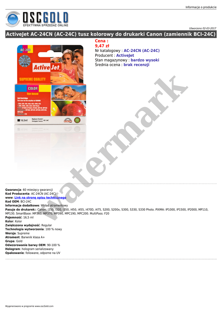 Informacje o produkcie Utworzono 02-03-2017 ActiveJet AC-24CN (AC-24C) tusz kolorowy do drukarki Canon (zamiennik BCI-24C) Cena : 9,47 zł at er m ar k Nr katalogowy : AC-24CN (AC-24C) Producent : ActiveJet Stan magazynowy : bardzo wysoki Średnia ocena : brak recenzji w Gwarancja: 60 miesięcy gwarancji Kod Producenta: AC-24CN (AC-24C) www: Link na stronę opisu technicznego Kod OEM: BCI-24C Informacje dodatkowe: Wkład atramentowy Pasuje do drukarek:: Canon: i250, i320, i350, i450, i455, i470D, i475, S200, S200x, S300, S330, S330 Photo. PIXMA: IP1000, IP1500, IP2000, MP110, MP130. SmartBase: MP360, MP370, MP390, MPC190, MPC200. MultiPass: F20 Pojemność: 16,5 ml Kolor: Kolor Zwiększona wydajność: Regular Technologia wytworzenia: 100 % nowy Wersja: Supreme Atrament: Barwnik klasa A+ Grupa: Gold Odwzorowanie barwy OEM: 90-100 % Hologram: hologram serializowany Opakowanie: foliowane, odporne na UV Wygenerowano w programie www.oscGold.com