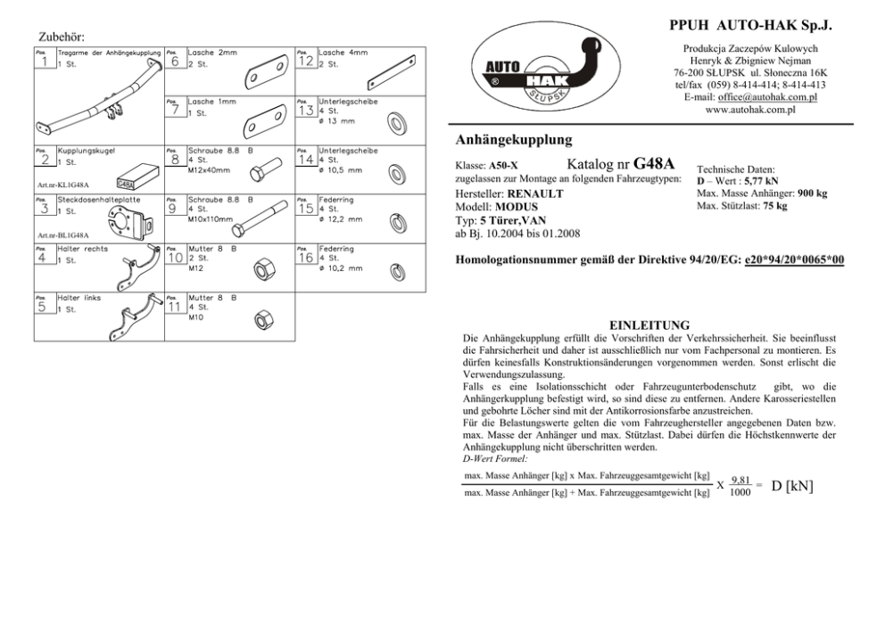 PPUH AUTO-HAK Sp.J. Zubehör: Produkcja Zaczepów Kulowych Henryk & Zbigniew Nejman 76-200 SŁUPSK ul. Słoneczna 16K tel/fax (059) 8-414-414; 8-414-413 E-mail: [email protected] www.autohak.com.pl Anhängekupplung G48A Art.nr-KL1G48A Art.nr-BL1G48A Klasse: A50-X Katalog nr zugelassen zur Montage an folgenden Fahrzeugtypen: Hersteller: RENAULT Modell: MODUS Typ: 5 Türer,VAN ab Bj. 10.2004 bis 01.2008 Technische Daten: D – Wert : 5,77 kN Max. Masse Anhänger: 900 kg Max. Stützlast: 75 kg Homologationsnummer gemäß der Direktive 94/20/EG: e20*94/20*0065*00 EINLEITUNG Die Anhängekupplung erfüllt die Vorschriften der Verkehrssicherheit. Sie beeinflusst die Fahrsicherheit und daher ist ausschließlich nur vom Fachpersonal zu montieren. Es dürfen keinesfalls Konstruktionsänderungen vorgenommen werden. Sonst erlischt die Verwendungszulassung. Falls es eine Isolationsschicht oder Fahrzeugunterbodenschutz gibt, wo die Anhängerkupplung befestigt wird, so sind diese zu entfernen. Andere Karosseriestellen und gebohrte Löcher sind mit der Antikorrosionsfarbe anzustreichen. Für die Belastungswerte gelten die vom Fahrzeughersteller angegebenen Daten bzw. max. Masse der Anhänger und max. Stützlast. Dabei dürfen die Höchstkennwerte der Anhängekupplung nicht überschritten werden. D-Wert Formel: max. Masse Anhänger [kg] x Max. Fahrzeuggesamtgewicht [kg] max. Masse Anhänger [kg] + Max. Fahrzeuggesamtgewicht [kg] X 9,81 = 1000 D [kN] MONTAGE - und BETRIEBSANLEITUNG DER ANHÄNGEKUPPLUNG Anbauanleitung Um die Anhängekupplung zu montieren, muss die Stoßstange nicht demontiert werden. Alle Schrauben der Stoßstange müssen von unten abgeschraubt werden. 2. Einen Teil im unteren Teil der Stoßstange, gemäß der Zeichnung 2, herausschneiden. 3. Das Hitzeschild über dem Nachschalldämpfer demontieren. 4. An den Auβenseiten der Längsträger gibt es originale Montagelöcher, die mit dem einem Aufkleber abgeklebt sind. Man muss den Aufkleber entfernen und die Löcher frei machen. Auf die Löcher die Lasche (Pos.12) legen und die Schrauben M10x110mm (Pos.9) einsetzen. 5. Die Seitenhalter (Pos.4 u. 5) auf die vorstehenden Schrauben setzen und die Muttern leicht festziehen. 6. Die Tragarme der Anhängekupplung (Pos.1) zwischen die montierten Seitenhalter setzen und mit den Schrauben M12x40mm (Pos.8) verschrauben. Dabei die Platten (Pos.6 u.7) zum Distanzausgleich verwenden. 7. Die Schrauben gemäß den Angaben in der Tabelle festdrehen. 8. Das Automatengestell mit den Schrauben M12x25mm und dem Steckdosenhalter (Pos.3) verschrauben. Die Kupplungskugel gemäß der Anbauanleitung der Anhängerkupplung mit dem schnell demontierten Aufsatz anbringen. 9. Die Elektroinstallation gemäß der Bedienungsanleitung des Herstellers anschließen. 10. Falls nötig, den durch die Montage beschädigten Farbanstrich an der Anhängekupplung ausbessern. 1. 4 12 M10x110 7 6 M10x110 12 1 M12x25 5 3 M12x40 2 Zeichnung 2 Die Anhängekupplung (Katalognummer G48A) ist für folgende Fahrzeugtypen zugelassen: RENAULT MODUS, 5 Türer, VAN, ab Bj. 10.2004 bis 01.2008, dient zum ziehen der Anhänger mit der Gesamtlast von 900 kg und der Kugelstützlast von max.75 kg. VON DEM HERSTELLER Die Zuverlässigkeit der Anhängekupplung ist jedoch auch von der ordnungsgemäßen Montage und der richtigen Nutzung abhängig. Daher werden Sie gebeten, sorgfältig die folgende Montageanleitung zu lesen und sich an die entsprechenden Anweisungen zu beachten. Die Anhängekupplung muss an den vom Fahrzeughersteller vorgeschriebenen Befestigungsstellen montiert werden. Drehmomente für Schrauben und Muttern 8.8: M6 - 11 Nm M 8 - 25 Nm M 10 - 50 Nm M 12 - 87 Nm M 14 - 138 Nm M16 - 210 Nm ACHTUNG Nach dem Anbau der Anhängekupplung sind die nationalen Vorschriften zur Anbauabnahme und zur Änderung der Fahrzeugpapiere zu beachten. Das Fahrzeug sollte mit seitlichen Blinkern und Rückspiegeln, deren Abstand mindestens der Anhängerbreite entspricht, ausgestattet werden. Alle Befestigungsschrauben sind nach ca. 1 000 km Anhängerbetrieb zu prüfen und nachzuziehen. Die Kugel der Anhängekupplung ist sauber zu halten und zu fetten. (D) (CZ) (F) (GB) (PL) (SK) Der Freiraum nach Anhang VII, Abbildung 30 der Richtlinie 94/20/EG ist zu gewährleisten. Volný prostor ve smyslu Přílohy VII,obr. 30 Směrnice č. 94/20/EG musí být zaručen. L´espace libre doit être garanti conformément à ľannexe VII, illustracion 30 de la directive 94/20/ CE. The clearance specified in apendix VII, diagram 30 of guideline 94/20/EC must be guaranteed. Zagwarantować swobodną przestrzeń zgodnie z załącznikiem VII, rysunek 30 dyrektywy 94/20/CE. Volný priestor v zmysle Prílohy VII, obr. 30 Smernice 94/20/EC musí byť zaručená. (D) (CZ) (F) (GB) (PL) (SK) * bei zulässigem Gesamtgewicht des Fahrzeuges * při celkové přípustné hmotnosti vozidla * pour poids total en charge autorizé du véhicule * at gross vehicle weight rating * przy dopuszczalnym ciężarze całkowitym pojazdu * pri celkovej prípustnej hmotnosti vozidla FITTING INSTRUCTION Clamp mark in acc. with ISO PN 1 L 2 + 3 31 4 R 5 58R 6 54 7 58L The instruction of the assembly 1. You can install our towing hitch without bumper disassembly, but twist off all fastening bolts underneath. 2. In lower part of the bumper cut out fragment according to figure 2. 3. Disassemble thermal shield over muffler. 4. From outsides of the chassis members are original holes under technical plaster. Remove plaster and uncover original holes. On this holes put fishplates pos. 12 and through holes put bolts M10x110mm (pos. 9) 5. From inside put side brackets (pos. 4 and 5) on protruding bolt and fix loosely. 6. Between mounted brackets put main bar of the towing hitch (pos. 1) and fix using bolts M12x40mm (pos. 8), use distance fish-plates (pos. 6 and 7) 7. Fix body of the automat and the socket plate (pos. 3) using bolts M12x25mm from accessories. Place tow-ball according to supplied instruction. 8. Fix tight all bo