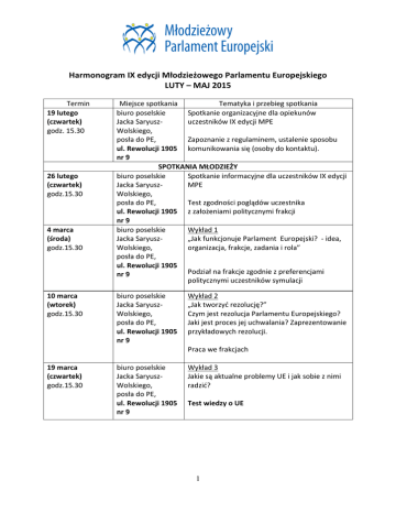 Harmonogram IX edycji Młodzieżowego Parlamentu Europejskiego LUTY – MAJ 2015 Termin 19 lutego (czwartek) godz. 15.30 26 lutego (czwartek) godz.15.30 4 marca (środa) godz.15.30 10 marca (wtorek) godz.15.30 19 marca (czwartek) godz.15.30 Miejsce spotkania Tematyka i przebieg spotkania biuro poselskie Spotkanie organizacyjne dla opiekunów Jacka Saryusz-‐ uczestników IX edycji MPE Wolskiego, posła do PE, Zapoznanie z regulaminem, ustalenie sposobu ul. Rewolucji 1905 komunikowania się (osoby do kontaktu). nr 9 SPOTKANIA MŁODZIEŻY biuro poselskie Spotkanie informacyjne dla uczestników IX edycji Jacka Saryusz-‐ MPE Wolskiego, posła do PE, Test zgodności poglądów uczestnika ul. Rewolucji 1905 z założeniami politycznymi frakcji nr 9 biuro poselskie Wykład 1 Jacka Saryusz-‐ „Jak funkcjonuje Parlament Europejski? -‐ idea, Wolskiego, organizacja, frakcje, zadania i rola” posła do PE, ul. Rewolucji 1905 Podział na frakcje zgodnie z preferencjami nr 9 politycznymi uczestników symulacji biuro poselskie Jacka Saryusz-‐ Wolskiego, posła do PE, ul. Rewolucji 1905 nr 9 Wykład 2 „Jak tworzyć rezolucję?” Czym jest rezolucja Parlamentu Europejskiego? Jaki jest proces jej uchwalania? Zaprezentowanie przykładowych rezolucji. Praca we frakcjach biuro poselskie Wykład 3 Jacka Saryusz-‐ Jakie są aktualne problemy UE i jak sobie z nimi Wolskiego, radzić? posła do PE, ul. Rewolucji 1905 Test wiedzy o UE nr 9 1 24 marca (wtorek) godz.15.30 15 kwietnia (środa) 2013 godz.15.30 29 kwietnia (środa) godz.15:30 8 maj godz.10.00-‐ 14.00 biuro poselskie Jacka Saryusz-‐ Wolskiego, posła do PE, ul. Rewolucji 1905 nr 9 Wykład 4 „Droga Polski do Unii Europejskiej” E-‐spotkanie z europosłem Jackiem Saryusz-‐Wolskim Zadanie: przygotowanie filmu 3 minutowego: „Jak mieszkańcy woj. łódzkiego widzą przyszłość Europy? biuro poselskie Wykład 5 Jacka Saryusz-‐ Jak stworzyć prezentację multimedialną?” Wolskiego, Jak dobrze się zaprezentować?” posła do PE, ul. Rewolucji 1905 Praca we frakcjach nr 9 biuro poselskie Jacka Saryusz-‐ Wolskiego, posła do PE, ul. Rewolucji 1905 nr 9 Próba generalna posiedzenia IX MPE -‐ Przedstawienie projektów multimedialnych zawierających stanowisk projektów rezolucji danej frakcji -‐ Zaprezentowanie filmów nt. Jak mieszkańcy woj. łódzkiego widzą przyszłość UE? Instytut Europejski Sesja plenarna Młodzieżowego Parlamentu ul. Piotrkowska Europejskiego 262/264 Uwaga: W wyjątkowych przypadkach data spotkania może ulec zmianie, o której będziecie Państwo powiadomieni z tygodniowym wyprzedzeniem poprzez wiadomość e-‐mail. 2