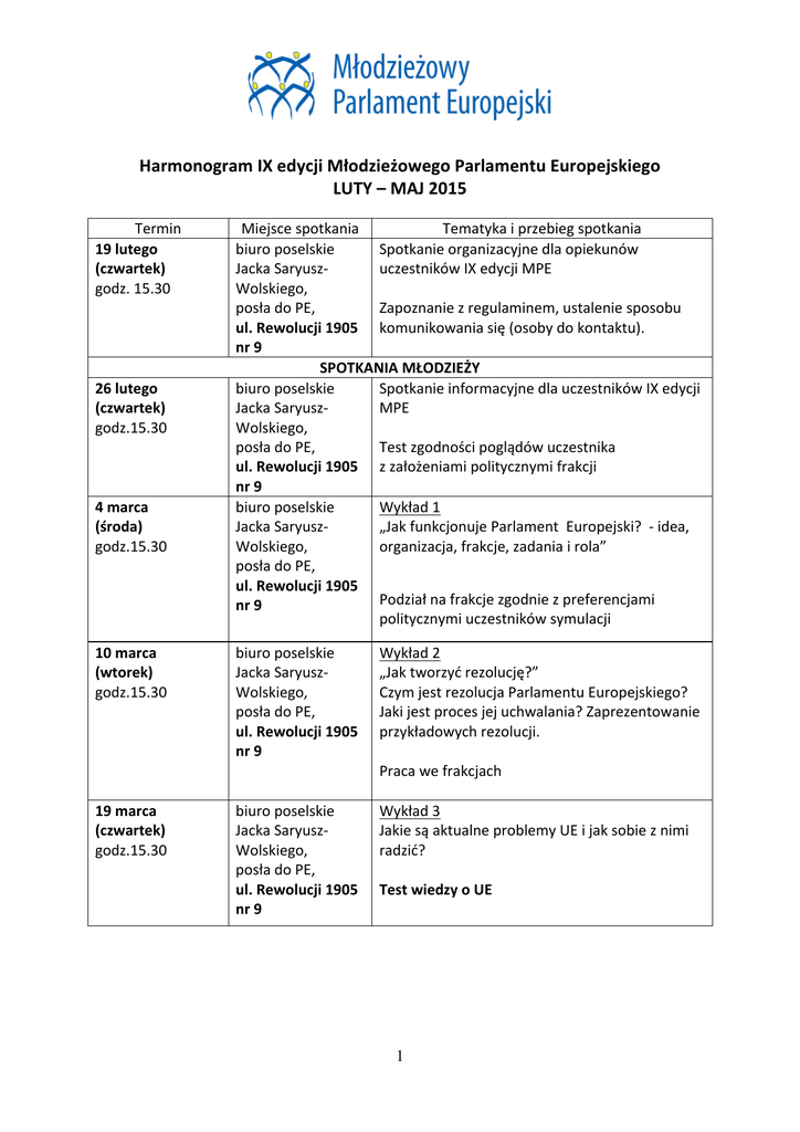 Harmonogram IX edycji Młodzieżowego Parlamentu Europejskiego