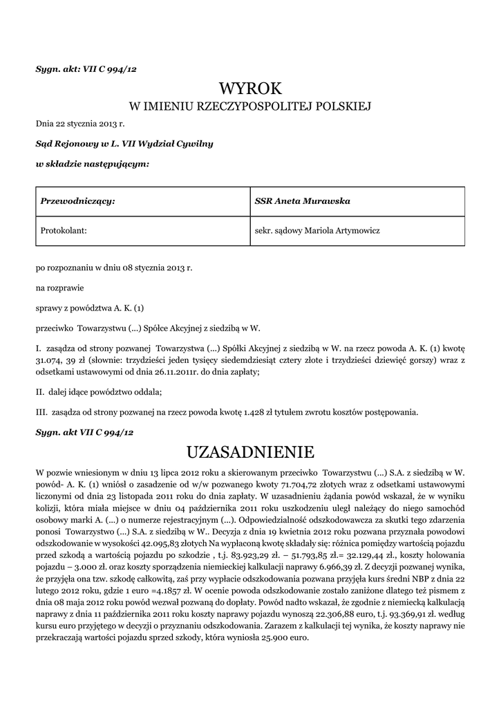 Sygn. akt: VII C 994/12 WYROK W IMIENIU RZECZYPOSPOLITEJ POLSKIEJ Dnia 22 stycznia 2013 r. Sąd Rejonowy w L. VII Wydział Cywilny w składzie następującym: Przewodniczący: SSR Aneta Murawska Protokolant: sekr. sądowy Mariola Artymowicz po rozpoznaniu w dniu 08 stycznia 2013 r. na rozprawie sprawy z powództwa A. K. (1) przeciwko Towarzystwu (...) Spółce Akcyjnej z siedzibą w W. I. zasądza od strony pozwanej Towarzystwa (...) Spółki Akcyjnej z siedzibą w W. na rzecz powoda A. K. (1) kwotę 31.074, 39 zł (słownie: trzydzieści jeden tysięcy siedemdziesiąt cztery złote i trzydzieści dziewięć gorszy) wraz z odsetkami ustawowymi od dnia 26.11.2011r. do dnia zapłaty; II. dalej idące powództwo oddala; III. zasądza od strony pozwanej na rzecz powoda kwotę 1.428 zł tytułem zwrotu kosztów postępowania. Sygn. akt VII C 994/12 UZASADNIENIE W pozwie wniesionym w dniu 13 lipca 2012 roku a skierowanym przeciwko Towarzystwu (...) S.A. z siedzibą w W. powód- A. K. (1) wniósł o zasadzenie od w/w pozwanego kwoty 71.704,72 złotych wraz z odsetkami ustawowymi liczonymi od dnia 23 listopada 2011 roku do dnia zapłaty. W uzasadnieniu żądania powód wskazał, że w wyniku kolizji, która miała miejsce w dniu 04 października 2011 roku uszkodzeniu uległ należący do niego samochód osobowy marki A. (...) o numerze rejestracyjnym (...). Odpowiedzialność odszkodowawcza za skutki tego zdarzenia ponosi Towarzystwo (...) S.A. z siedzibą w W.. Decyzja z dnia 19 kwietnia 2012 roku pozwana przyznała powodowi odszkodowanie w wysokości 42.095,83 złotych Na wypłaconą kwotę składały się: różnica pomiędzy wartością pojazdu przed szkodą a wartością pojazdu po szkodzie , t.j. 83.923,29 zł. – 51.793,85 zł.= 32.129,44 zł., koszty holowania pojazdu – 3.000 zł. oraz koszty sporządzenia niemieckiej kalkulacji naprawy 6.966,39 zł. Z decyzji pozwanej wynika, że przyjęła ona tzw. szkodę całkowitą, zaś przy wypłacie odszkodowania pozwana przyjęła kurs średni NBP z dnia 22 lutego 2012 roku, gdzie 1 euro =4.1857 zł. W ocenie powoda odszkodowanie zostało zaniżone dlatego też pismem z dnia 08 maja 2012 roku powód wezwał pozwaną do dopłaty. Powód nadto wskazał, że zgodnie z niemiecką kalkulacją naprawy z dnia 11 października 2011 roku koszty naprawy pojazdu wynoszą 22.306,88 euro, t.j. 93.369,91 zł. według kursu euro przyjętego w decyzji o przyznaniu odszkodowania. Zarazem z kalkulacji tej wynika, że koszty naprawy nie przekraczają wartości pojazdu sprzed szkody, która wyniosła 25.900 euro. W odpowiedzi na pozew strona pozwana wniosła o oddalenie powództwa oraz o wydanie rozstrzygnięcia w zakresie kosztów procesu obciążających powódkę. W uzasadnieniu tak zaprezentowanego stanowiska pozwana podniosła, że w następstwie zdarzenia szkodowego doszło do tzw. szkody całkowitej, gdyż koszt przywrócenia pojazdu do stanu sprzed szkody przewyższa wartość pojazdu w dacie szkody. W tej sytuacji odpowiedzialność sprawy szkody ogranicza się do wypłacenia odszkodowania stanowiącego różnicę miedzy wartością auta bezpośrednio przed szkodą a wartością uszkodzonego pojazdu. – pozostałości. Z zebranych w sprawie materiałów pozwany ustalił, że wartość auta w dacie szkody wyniosła 20.050 euro. W konsekwencji wysokość należnego odszkodowania stanowi kwota 7.676 euro, która to została wypłacona powodowi. Sąd ustalił następujący stan faktyczny: W dniu 04 października 2011 roku doszło do kolizji drogowej, w następstwie której uległ uszkodzeniu pojazd A. K. (1), t.j. A. (...) o numerze rejestracyjnym (...). Sprawca zdarzenia – A. K. (2), kierujący pojazdem marki M. o numerze rejestracyjnym (...), był ubezpieczony w Towarzystwie (...) S.A. z siedzibą w W. od odpowiedzialności cywilnej za zdarzenia wywołane R. jego pojazdu. dowód: akta szkodowe (...) W dacie zdarzenia wartość pojazdu powoda to kwota 86.931 zł. W następstwie przedmiotowego zdarzenia w pojeździe powoda doszło do uszkodzenia: 1) części do wymiany w postaci zderzaka tylnego, osłony dolnej zderzaka tylnego, prowadnicy zderzaka tylnego- lewa i prawa, wspornika zderzaka tylnego, absorbera zderzaka tylnego, zestawu mocowań zderzaka tylnego( śruby i nakrętki), tablicy rejestracyjnej tylnej ze wzmocnieniem, ściany tylnej, wzmocnienia blachy zamykającej , ramy dachu składanego, pokrywy bagażnika wraz z uszczelką, zamka pokrywy tylnej z płyta zamykającą, emblematu tylnego , napis (...), napis : (...), lampy tylne, lampy tylne tablicy rejestracyjnej, rama dachu tylna, podłoga bagażnika, wykładzina podłogi bagażnika, tablica wskaźników, konsola środkowa z przednią osłoną , kondensator, wypełnienie podłogi tylnej – lewe i prawe , system nawigacji, zmieniarka CD, chłodnica wody, tłumik końcowy z blachą osłony termicznej; 2) części do naprawy: szkieletu drzwi lewych, szkieletu drzwi prawych, ściany bocznej tylnej lewej, ściany bocznej tylnej prawej, przedłużnica tylna lewa, przedłużnica tylna prawa, wzmocnienie wewnętrzne ściany tylnej lewej, wzmocnienie wewnętrznej ściany tylnej prawej; 3) części do lakierowania: pokrywa bagażnika, zderzak tylny, próg- lewy i prawy, słupek zawiasowy, ściana tylna- lewa i prawa, ściana tylna- lakierowanie wierzchnie, podłoga bagażnika- lakierowanie wierzchnie, przedłuż nice tylne- lewa i prawa , lakierowanie wierzchnie, poprzeczka ściany tylnej- lakierowanie wierzchnie. Całkowity koszt naprawy samochodu powoda brutto wynosi60.303,83 złotych i odpowiada ona kosztom naprawy brutto tego samochodu. Wyliczenie kosztów naprawy dokonano w oparciu o kalkulację w eksperckim systemie A. według stanu na miesiąc powstania szkody- październik 2011 roku . W kalkulacji tej koszty naprawy pojazdu obejmującej wyżej wskazany zakres i kwalifikacje uszkodzeń zostały obliczone przy zastosowaniu cen nowych, oryginalnych części zamiennych i materiałów oraz ustalony