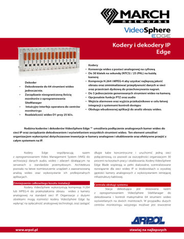 Rodzina koderów i dekoderów VideoSphere Edge ™ umożliwia podłączenie analogowych kamer wideo do sieci IP oraz zarządzanie dekodowaniem i wyświetlaniem wszystkich strumieni wideo. Ten element umożliwi organizacjom wykorzystać dotychczasowe inwestycje w kamery analogowe i okablowanie oraz efektywne przejść z całym systemem na IP. Kodery Edge współpracują razem z oprogramowaniem Video Management System (VMS) do archiwizacji danych audio, wideo i zdarzeń działającym na serwerach o standardzie przemysłowym. Architektura pozwala na łatwe rozmieszczenie urządzeń z zaawansowaną analizą wideo oraz wykorzystanie ich profesjonalnych aplikacjach. Zmniejszenie całkowitego kosztu instalacji Kodery VideoSphere wykorzystują kompresję H.264 lub MPEG-4 do przekształcenia obrazu wideo z kamery analogowej na standard sieci IP. Organizacje z dużymi obiektami mogą rozmieści kodery VideoSphere Edge by wpłynąć na opłacalność analogowej technologii, oraz zastąpić długie kabe koncentryczne i uruchomić jedną sieci połączeniową, co pozwoli za oszczędności organizacjom 30 procent na kosztach pracy i okablowania. Kodery VideoSphere Edge Blade wspierają w pełni skalowalne, scentralizowane rozwiązanie dla sieci wideo IP w środowiskach o wysokiej gęstości kamery analogowych z wykorzystaniem istniejącej infrastruktury kablowej. Centrala obsługi systemu Stacja dekodująca jest stosowana razem z oprogramowaniem VideoSphere SiteManager do dekodowania i kontroli maksymalnie 64 strumieni wideo wyświetlanych na dwóch monitorach. W przypadku dużych centrów monitoringu wizyjnego możliwe jest stworzenie ściany monitorów obsługiwanych przez nielimitowaną liczbę stacji dekodujących. Dekoder automatycznie wybiera odpowiedni strumień wideo bezpośrednio z kodera VideoSphere lub serwera VMS w zależności od wielkości okna wyświetlanego na ekranie monitora. Stacja dekodująca zapewnia automatyczny rozruch po zaniku zasilania przez zapamiętanie ustawień konfiguracji. Model Edge 1 koder / dekoder Edge 4 koder – szafa rack Stacja dekodująca Ilość klatek 30 kl/s (NTSC) 25 kl/s (PAL) dla D1 120 kl/s (NTSC) 100 kl/s (PAL) dla D1 64 jednoczesne strumienie wideo Obudowa Stacjonarna Stacjonarna / Karta Stacjonarna Wyjście wideo BNC Audio wejście /wyjście 1.01.2010 4.01.2010 1 mic / 1 stereo Alarmy 1 4 - Przekaźniki 1 4 1 Kompresja 3 jednoczesne strumienie H.264, MPEG-4 3 jednoczesne strumienie H.264, MPEG-4 H.264, MPEG-4, JPEG Obsługiwana rozdzielczość CIF, 2CIF, D1 CIF, 2CIF, D1 W zależności od monitora Kontrola PTZ 1x RS485, 1x RS422 - 1x RS485 DVI, VGA Port USB 4 Ethernet 10/100 Mb/s 10/100 Mb/s Gigabit Pamięć wewnętrzna Karta SD Karta SD HC - Zasilanie poprzez Ethernet Tak Tak - Zasilanie 12VDC zaciski /PoE 12VDC zaciski /PoE 100-240VAC Moc pobierana 4W 5W 90W Opcje montażu Ścienny lub Rack 1U na 4 urządzenia Ścienny lub Rack 1U na 2 urządzenia, Rack z kartami 4U 14 urządzeń Rack 1U na 2 urządzenia Zakres temperaturowy 5 do 55°C 5 do 55°C 10 do 35°C Waga paczki 0.5 kg 0.6 kg Stacjonarny 0.1 kg Kakra 1.5 kg Pusty Rack 1.5 kg Wymiary 3.5x11.4x12cm Stacjonarny 3.5x19.7x12.7cm, Rack 17.7x44.4x18cm 5x16.5x16.5cm Certyfikaty UL60950;CE EN55022; RoHS 2000/95/EC UL60950;CE EN55022; RoHS 2000/95/EC UL60950;CE EN55022; RoHS 2000/95/E