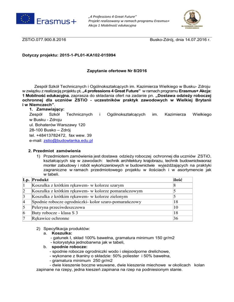 „4 Professions 4 Great Future” Projekt realizowany w ramach programu Erasmus+ Akcja 1 Mobilność edukacyjna ZSTiO.077.900.8.2016 Busko-Zdrój, dnia 14.07.2016 r. Dotyczy projektu: 2015-1-PL01-KA102-015994 Zapytanie ofertowe Nr 8/2016 Zespół Szkół Technicznych i Ogólnokształcących im. Kazimierza Wielkiego w Busku- Zdroju w związku z realizacją projektu pt. „4 professions 4 Great Future” w ramach programu Erasmus+ Akcja: 1 Mobilność edukacyjna. zaprasza do składania ofert na zadanie pn. „Dostawa odzieży roboczej ochronnej dla uczniów ZSTiO - uczestników praktyk zawodowych w Wielkiej Brytanii i w Niemczech”. 1. Zamawiający: Zespół Szkół Technicznych i Ogólnokształcących im. Kazimierza Wielkiego w Busku - Zdroju ul. Bohaterów Warszawy 120 28-100 Busko – Zdrój tel. +48413782472, fax wew. 39 e-mail: [email protected] 2. Przedmiot zamówienia 1) Przedmiotem zamówienia jest dostawa odzieży roboczej ochronnej dla uczniów ZSTiO, kształcących się w zawodach: technik architektury krajobrazu, technik budownictwaoraz monter zabudowy i robót wykończeniowych w budownictwie wyjeżdżających na praktyki zagraniczne w ramach przedmiotowego projektu w ilościach i w asortymencie jak w tabeli. Lp. 1 2 3 4 5 6 7 Produkt Koszulka z krótkim rękawem- w kolorze szarym Koszulka z krótkim rękawem- w kolorze pomarańczowym Koszulka z krótkim rękawem- w kolorze zielonym Spodnie robocze ogrodniczki- kolor szaro-pomarańczowy Peleryna przeciwdeszczowa Buty robocze - klasa S 3 Rękawice ochronne ilość 8 5 5 18 10 18 36 2) Specyfikacja produktów: a. Koszulka: - gatunek I, skład 100% bawełna, gramatura minimum 150 gr/m2 - kolorystyka jednobarwna jak w tabeli, b. spodnie robocze: - spodnie robocze ogrodniczki wodo i olejoodporne drelichowe, - wykonane z tkaniny o składzie: 50% poliester i 50% bawełna, - gramatura minimum 250 gr/m2 - dwie kieszenie boczne wsuwane, dwie kieszenie miechowe w okolicach kolan zapinane na rzepy, jedna kieszeń zapinana na rzep na podniesionym stanie. „4 Professions 4 Great Future” Projekt realizowany w ramach programu Erasmus+ Akcja 1 Mobilność edukacyjna - regulacja po bokach w pasie na guziki, - na nogawkach ściągacze w postaci rzepów, - kolor: szary z wstawkami pomarańczowymi, c. buty robocze – klasa S3, np. model 102 S3 lub model o parametrach równoważnych, d. rękawice robocze - typu np. RECODRAK lub o parametrach równoważnych, 3) Rozmiary w/w artykułów Zamawiający przekaże nie później niż w dniu podpisania umowy. 4) Z uwagi na to, iż przedmiotowa odzież ochronna jest przeznaczona dla młodocianych (dziewczęta i chłopcy) Zamawiający wymaga, aby w przypadku rażącego niedopasowania odzieży, zwłaszcza spodni do sylwetki młodocianego, Wykonawca dojechał do Szkoły, pobrał miarę i dokonał odpowiednich poprawek. 5) Zamawiana odzież robocza musi spełniać wszystkie wymogi określone przepisami dotyczącymi odzieży ochronnej (w tym BHP). 3. Termin wykonania zamówienia: wymagany termin dostawy do 24.08. 2016 r. 4. Płatności. 1) Płatność będzie dokonana po wykonaniu usługi w terminie do 21 dni od dnia otrzymania prawidłowo wystawionej faktury, w złotych polskich na rachunek bankowy Wykonawcy, wskazany w fakturze/rachunku, 2) Za dzień zapłaty wynagrodzenia uważa się dzień obciążenia rachunku Zamawiającego. 3) Wynagrodzenie na rzecz Wykonawcy może zostać pomniejszone o naliczone kary umowne, jeżeli taka forma zapłaty kary umownej zostanie wybrana przez Zamawiającego, zgodnie z postanowieniami umowy. 5. Opis sposobu przygotowania oferty Oferta powinna zawierać: 1) Dane teleadresowe Wykonawcy wraz ze wskazaną osobą do kontaktu w sprawie oferty (numer telefonu i e-mail osoby do kontaktu, numer NIP oraz REGON firmy). 2) Kopię aktualnego dokumentu rejestrowego (dotyczy wyłącznie podmiotu, którego danych rejestrowych nie można ustalić na podstawie wydruku aktualnych informacji o podmiotach wpisanych do Rejestrów udostępnionych przez Centralną Informację Krajowego Rejestru Sądowego na stronie internetowej https://ems.ms.gov.pl lub na podstawie zaświadczenia o wpisie do Centralnej Ewidencji i Informacji o Działalności Gospodarczej). 3) Propozycję całkowitej ceny ryczałtowej za kompletną usługę wraz z wykazem kosztów szczegółowych zgodnie ze wzorem formularza oferty. 4) Opis doświadczenia Wykonawcy, zawierający informację o należytej realizacji co najmniej trzech usług tożsamych z zamówieniem w ciągu ostatnich trzech lat, a jeżeli okres prowadzenia działalności jest krótszy- w tym okresie wg zał. Nr 3. 5) Oświadczenie o braku powiązań osobowych i kapitałowych z Zamawiającym. 6. Miejsce oraz termin składania ofert. 1) Wypełniony w całości formularz ofertowy wg. Zał. Nr 1 wraz z załącznikami (dokumenty podpisane przez osoby uprawnione do składania oświadczeń woli) należy złożyć w sekretariacie Zespołu Szkół Technicznych i Ogólnokształcących w Busku – Zdroju, ul. Boh. Warszawy 120, 28-100 Busko- Zdrój lub przesłać pocztą w terminie do 22.07.2016 r. do godz. 11:00. Oferty w zamkniętych kopertach należy opisać „ZSTiO - Odpowiedź na zapytanie ofertowe Nr 8/2016 „„Dostawa odzieży roboczej ochronnej dla uczniów ZSTiO - uczestników praktyk zawodowych w Wielkiej Brytanii i w Niemczech”. „4 Professions 4 Great Future” Projekt realizowany w ramach programu Erasmus+ Akcja 1 Mobilność edukacyjna Zamawiający dopuszcza złożenie oferty (skanów dokumentów) drogą e-mailową na adres: [email protected], wpisując w temacie wiadomości : ZSTiO - Odpowiedź na zapytanie ofertowe Nr 8/2016 „Dostawa odzieży roboczej ochronnej” 3) Oferty złożone po terminie nie będą rozpatrywane. 7. Ocena ofert. 1) Oferta musi być zgodna z warunkami Zamawiającego. Po sprawdzeniu wymogów opisanych powyżej, Zamawiający dokona oceny ważnych ofert na podstawie następujących kryteriów: cena – 100% ważności. 2) Informa