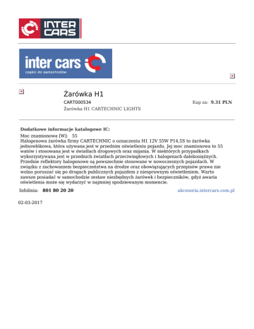 Żarówka H1 CART000534 Kup za: 9.31 PLN Żarówka H1 CARTECHNIC LIGHTS Dodatkowe informacje katalogowe IC: Moc znamionowa [W]: 55 Halogenowa żarówka firmy CARTECHNIC o oznaczeniu H1 12V 55W P14,5S to żarówka jednowłókowa, która używana jest w przednim oświetleniu pojazdu. Jej moc znamionowa to 55 watów i stosowana jest w światłach drogowych oraz mijania. W niektórych przypadkach wykorzystywana jest w przednich światłach przeciwmgłowych i halogenach dalekosiężnych. Przednie reflektory halogenowe są powszechnie stosowane w nowoczesnych pojazdach. W związku z zachowaniem bezpieczeństwa na drodze oraz obowiązujących przepisów prawa nie wolno poruszać się po drogach publicznych pojazdem z niesprawnym oświetleniem. Warto zawsze posiadać w samochodzie zestaw niezbędnych żarówek i bezpieczników, gdyż awaria oświetlenia może się wydarzyć w najmniej spodziewanym momencie. Infolinia: 801 80 20 20 02-03-2017 akcesoria.intercars.com.pl