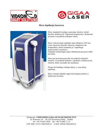 Hera depilacja laserowa Złoty standard trwałego usuwania włosów wśród laserów diodowych. Zapewnia bezpieczne i skuteczne leczenie wszystkich rodzajów skóry Hera wykorzystuje unikalny laser diodowy 810 nm. Laser ogrzewa mieszki włosowe stopniowo do temperatury, która uszkadza je i zapobiega ponownemu wzrostowi. Unikalna technologia super chłodzenia przynosi efekt bez bólu. Hera jest przeznaczona dla wszystkich rodzajów włosów, wszystkich kolorów i grubości zwłaszcza do włosów, które są trudne do usunięcia. Pasuje do każdego rodzaju skóry, w tym skóry opalonej. Duży rozmiar plamki zapewnia bezpieczeństwo i skuteczne leczenie. Producent: VIDEOMED ZAKŁAD ELEKTRONICZNY ul. Klonowa 18 58-310 Szczawno-Zdrój Polska tel. +48 74 843 2829 fax +48 74 840 17 33 web: http://www.videomed.eu e-mail: [email protected]
