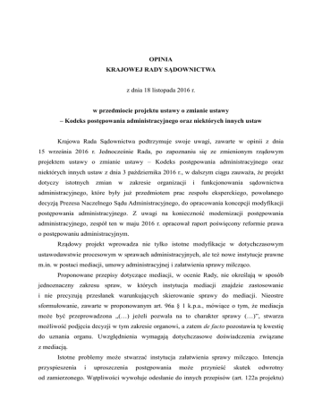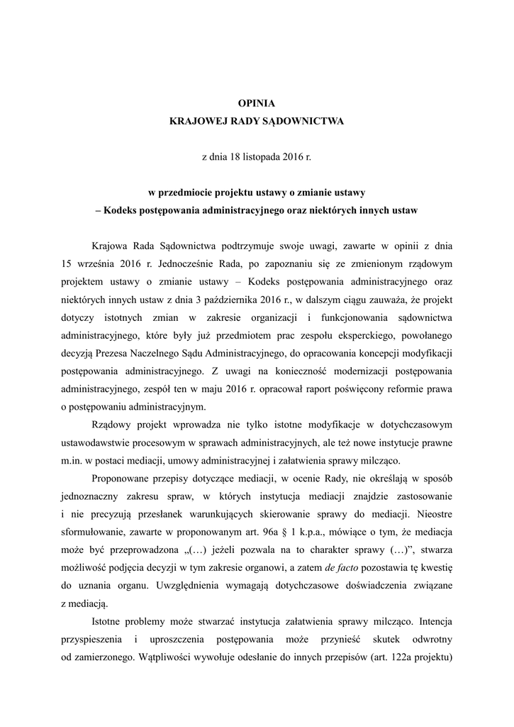 OPINIA KRAJOWEJ RADY SĄDOWNICTWA z dnia 18 listopada 2016 r. w przedmiocie projektu ustawy o zmianie ustawy – Kodeks postępowania administracyjnego oraz niektórych innych ustaw Krajowa Rada Sądownictwa podtrzymuje swoje uwagi, zawarte w opinii z dnia 15 września 2016 r. Jednocześnie Rada, po zapoznaniu się ze zmienionym rządowym projektem ustawy o zmianie ustawy – Kodeks postępowania administracyjnego oraz niektórych innych ustaw z dnia 3 października 2016 r., w dalszym ciągu zauważa, że projekt dotyczy istotnych zmian w zakresie organizacji i funkcjonowania sądownictwa administracyjnego, które były już przedmiotem prac zespołu eksperckiego, powołanego decyzją Prezesa Naczelnego Sądu Administracyjnego, do opracowania koncepcji modyfikacji postępowania administracyjnego. Z uwagi na konieczność modernizacji postępowania administracyjnego, zespół ten w maju 2016 r. opracował raport poświęcony reformie prawa o postępowaniu administracyjnym. Rządowy projekt wprowadza nie tylko istotne modyfikacje w dotychczasowym ustawodawstwie procesowym w sprawach administracyjnych, ale też nowe instytucje prawne m.in. w postaci mediacji, umowy administracyjnej i załatwienia sprawy milcząco. Proponowane przepisy dotyczące mediacji, w ocenie Rady, nie określają w sposób jednoznaczny zakresu spraw, w których instytucja mediacji znajdzie zastosowanie i nie precyzują przesłanek warunkujących skierowanie sprawy do mediacji. Nieostre sformułowanie, zawarte w proponowanym art. 96a § 1 k.p.a., mówiące o tym, że mediacja może być przeprowadzona „(…) jeżeli pozwala na to charakter sprawy (…)”, stwarza możliwość podjęcia decyzji w tym zakresie organowi, a zatem de facto pozostawia tę kwestię do uznania organu. Uwzględnienia wymagają dotychczasowe doświadczenia związane z mediacją. Istotne problemy może stwarzać instytucja załatwienia sprawy milcząco. Intencja przyspieszenia i uproszczenia postępowania może przynieść skutek odwrotny od zamierzonego. Wątpliwości wywołuje odesłanie do innych przepisów (art. 122a projektu) oraz treść tak podjętej decyzji i gwarancji procesowych dla osób trzecich, w tym odniesienie się milcząco do daty decyzji i jej prawomocności. Wydawanie zaświadczenia – postanowieniem – nie skraca postępowania (art. 122f). Ponadto istnieje ryzyko wydania decyzji sprzecznej z prawem lub niedopuszczalnej w danym stanie faktycznym i związanej z tym odpowiedzialności organu. Krajowa Rada Sądownictwa ponownie zwraca uwagę, że Trybunał Konstytucyjny w wyroku z dnia 12 maja 2015 r. w sprawie o sygn. P 46/13 uznał, że art. 156 § 2 k.p.a. w zakresie, w jakim nie wyłącza dopuszczalności stwierdzenia nieważności decyzji wydanej z rażącym naruszeniem prawa, gdy od wydania decyzji nastąpił znaczny upływ czasu, a decyzja była podstawą nabycia prawa lub ekspektatywy, jest niezgodny z art. 2 Konstytucji Rzeczypospolitej Polskiej. Trybunał Konstytucyjny nie wypowiedział się co do terminu określającego upływ czasu. Krajowa Rada Sądownictwa podkreśla, że proponowane nowe rozwiązania, mimo że zmierzają do uproszczenia i usprawnienia postępowania, zbyt daleko ingerują w ukształtowany już system prawny, prowadząc do jego niejasności. Zdaniem Rady, należy ocenić je jako dyskusyjne i wymagające rozważenia w ramach całościowych prac przeprowadzonych przez Komisję Kodyfikacyjną, powołaną do zbadania skutków i konsekwencji wprowadzenia rozwiązań legislacyjnych w kwestiach objętych przedmiotowym projektem. 2