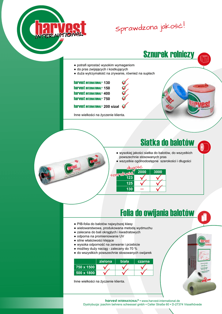 ść ! Sprawdzona jako Sznurek rolniczy ●potrafi sprostać wysokim wymaganiom ●do pras zwijających i kostkujących ●duża wytrzymałość na zrywanie, również na supłach harvest INTERNATIONAL® 130 harvest INTERNATIONAL® 150 harvest INTERNATIONAL® 400 harvest INTERNATIONAL® 750 harvest INTERNATIONAL® 200 sizal Inne wielkości na życzenie klienta. Siatka do balotów ●wysokiej jakości siatka do balotów, do wszystkich powszechnie stosowanych pras ●wszystkie ogólnodostępne szerokości i długości długość 2000 szerokość 123 3000 125 130 Folia do owijania balotów ●PIB-folia do balotów najwyższej klasy ●wielowarstwowa, produkowana metodą wydmuchu ●zalecana do bali okrągłych i kwadratowych ●odporna na promieniowanie UV ●silne właściwości klejące ●wysoka odporność na zerwanie i przebicie ●możliwy duży naciąg - zalecany do 70 % ●do wszystkich powszechnie stosowanych owijarek zielona biała czarna 750 x 1500 500 x 1800 Inne wielkości na życzenie klienta. harvest INTERNATIONAL® • www.harvest-international.de Dystrybucja: joachim behrens scheessel gmbh • Celler Straße 60 • D-27374 Visselhövede Ochrona balotów harvest INTERNATIONAL® folienklebeband - taśma klejąca do folii Taśma klejąca do naprawy uszkodzonej folii balotowej oraz folii pryzmowej. ●biała ●jasnozielona ●czarna harvest INTERNATIONAL® vlies - włóknina ochronna Do okrywania balotów ze słomy, kopców (ziemniaki, buraki cukrowe), kompostu ●wysoka odporność na obciążenia ●wytrzymuje silne wiatry ●stabilna na promieniowanie UV przez min. 5 lat ●chroni przed zabrudzeniami, takimi jak np. ptasie odchody ●z załączoną instrukcją okrywania pryzmy/stogu Rozmiary dostępne w magazynie szerokość 10,4 m długość 12,5 m 13,0 m 15,6 m 25,0 m Opakowanie Włóknina pakowana jest pojedynczo w przezroczyste worki. Worki ułożone są w kartonie na europalecie - łatwy transport i przechowywanie. harvest INTERNATIONAL® • www.harvest-international.de Dystrybucja: joachim behrens scheessel gmbh • Celler Straße 60 • D-27374 Visselhövede