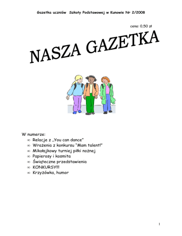 Gazetka uczniów Szkoły Podstawowej w Kunowie Nr 2/2008 cena: 0,50 zł W numerze: • Relacje z „You can dance” • WraŜenia z konkursu “Mam talent!” • Mikołajkowy turniej piłki noŜnej • Papierosy i kosmita • Świąteczne przedstawienia • KONKURSY!!! • KrzyŜówka, humor 1 Gazetka uczniów Szkoły Podstawowej w Kunowie Nr 2/2008 W listopadzie i grudniu Ŝycie naszej szkoły zostało zdominowane przez konkursy i imprezy! Odbyły się eliminacje szkolne i międzyszkolne do konkursów: • z matematyki i przyrody • z języka polskiego i historii • z religii Oto zdjęcie z Międzyszkolnego Konkursu Biblijnego 20008 Cykl listopadowych i grudniowych imprez rozpoczął uroczysty apel z okazji Święta Niepodległości. To przedstawienie przygotowaliśmy jak zwykle z panią M. Budzyńską. 2 Gazetka uczniów Szkoły Podstawowej w Kunowie Nr 2/2008 Następne dwie imprezy przygotowaliśmy sami – bez pomocy nauczycieli. Na pomysł zorganizowania w naszej szkole You can dance wpadła Kinga Kowalewska. Ona była organizatorką tego konkursu i jedną z jurorek. Wśród oceniających była teŜ Martyna Dolańska. Oto jej relacja: Tańczyło czworo uczestników i z nich wybieraliśmy najlepszego. Podobało mi się to, Ŝe chłopcy tańczyli śmieszne. My – jurorki bardzo się kłóciłyśmy, ale ostatecznie wygrał Michał Kowalewski. Wśród oceniających były teŜ Paulina Sokołowska i Karolina Kubicka, a ostatnią edycję prowadziła Patrycja Siwiec. Nie był to program idealny i najlepiej przygotowany, ale zaprosiliśmy nauczycieli. Niektórzy przyszli. Martyna Dolańska W listopadzie zorganizowaliśmy teŜ konkurs „Mam talent” Oto relacja Kamilii Rolewicz: Organizatorkami tej imprezy były: Daria Gontarz, Patrycja Przychodzka, Karolina Kubicka i ja. W początkowych eliminacjach wzięło udział 24 uczestników. Jurorzy kolejno oceniali występ kaŜdego. Niestety, musieliśmy wybrać najpierw dwanaścioro uczestników, a później do półfinału tylko sześcioro najlepszych. Byli to: Paulina Sokołowska, Łukasz Romciw, Natalia Brzoza, Marcel Sucholas, Kinga Kowalewska oraz Patrycja Siwiec. Finał konkursu juŜ niedługo!!! 3 Gazetka uczniów Szkoły Podstawowej w Kunowie Nr 2/2008 Wielu uczniów naszej szkoły było na anrzejkach w Skalinie. Była tam równieŜ Daria Gontarz, która krótko napisała o tej imprezce: 29 listopada, w sobotę nie mogłam się doczekać godziny 18.00. Widziałam, Ŝe tego dnia w klubie Oaza w Skalinie będzie zabawa andrzejkowa, Ŝe będziemy sobie wróŜyć i tańczyć. Wszystko zorganizowała pani E. Serba. Mógł przyjść kaŜdy, kto miał ochotę. Najpierw były wróŜby, potem tańce. Podobała mi się ta zabawa, mile ją wspominam. 11 grudnia w naszej szkole odbyły się zajęcia profilaktyczne na temat szkodliwości palenia papierosów i AIDS. Z tej okazji uczniowie z klasy IV pokazali przedstawienie pt. „Papierosy i kosmita”. W tej scence przybysz z kosmosu zastanawia się dlaczego ludzie palą. „MoŜe to jakaś dodatkowa wentylacja, a moŜe im się styki przegrzały”myśli kosmita, a później wysyła taką relację na swoją planetę: „Ziemianie siedzą i dymią. To się nazywa palenie papierosów. Tak się u nich nawiązuje przyjazny kontakt. To chyba jakiś powszechny rytuał.” Z tego przedstawienia i z całych zajęć wypływa wniosek, Ŝe palenie nie ma sensu! 4 Gazetka uczniów Szkoły Podstawowej w Kunowie Nr 2/2008 Wielkim, wzbudzający wiele emocji wydarzeniem był I GMINNY MIKOŁAJKOWY TURNIEJ HALOWEJ PIŁKI NOśNEJ, który odbył się 4 grudnia w naszej szkole. Relację z tego turnieju do naszej gazetki napisał Przemek Sadowski. Do tego meczu przygotowywaliśmy się dwa tygodnie. Pani powiedziała, Ŝe musimy wygrać! I udało się! Na Turnieju nie przegraliśmy Ŝadnego meczu i nasz bramkarz nie wpuścił Ŝadnej bramki! Mecze sędziował nauczyciel wychowania fizycznego ze Szkoły Podstawowej w Kobylance. Moim zdaniem (pisze Przemek) sędzia niesprawiedliwie uznał gola, gdy piłka trafiła w poprzeczkę. Z tego powodu była kłótnia, zarządzono dogrywkę, ale i tak wygraliśmy!!! Dostaliśmy złoty puchar! W czasie przerw moŜna było iść do klasy, gdzie był przygotowany poczęstunek: napoje i słodycze. Turniej był naprawdę świetny i nie mogę się doczekać następnego. 5 Gazetka uczniów Szkoły Podstawowej w Kunowie Nr 2/2008 17 grudnia lekcje były skrócone. Po zwykłych zajęciach mogliśmy obejrzeć mikołajkowe przedstawienia. Wystąpił zespół Sweet dools, teatrzyk „Kurtynka”, uczniowie z klas O – III, a następnie aktorzy z Torunia. Podobał mi się występ dziewcząt przebranych z ŚnieŜynki oraz pani Zimy, którą była Beata Zawadzka. ŚnieŜynki tańczyły m. in. do utworów Vivaldiego i to było bardzo piękne. W przerwie między przedstawieniami kupowaliśmy losy loterii fantowej. Było sporo emocji, bo główną wygraną miała być mp3. Wylosował ją Artur Wrzeszcz. Szczęściarz! Występ i zabawy z aktorami rozśmieszyły nas do łez. Najsłodszą niespodzianką były paczki, które pod koniec przedstawienia rozdawał Mikołaj i skrzat. Dobrze się bawiłam tego dnia. Chciałaby, Ŝeby tak było częściej... Kinga Kowalewska Na długie, zimowe wieczory najlepsza jest ksiąŜka! Właśnie. Oto kilka konkursów związanych z ksiąŜkami: 1. RozwiąŜ krzyŜówkę : 1. 2. 3. 4. 5. 6. 7. Stoi na stacji ...... Miasto, w którym mieszkał pan Tralaliński Spadło z pieca Rozindyczył się w wierszu pt. „Figielek” Chłop wiózł z lasu w czasie mrozu Synek słonia Trąbalskiego nazywa się Biały ............... Sypał się za Grzesiem 6 Gazetka uczniów Szkoły Podstawowej w Kunowie Nr 2/2008 2. Połącz tytuły ksiąŜek z ich autorami. Dynastia Miziołków PippiPończoszanka Tomek w Krainie Kangurów Harry Potter i komnata tajemnic Pan Samochodzik i złota rękawica AlfredSzklarski Joanne Rowling Joanna Olech Zbigniew Nienacki Astrid Lindgren 3. Zgadnij, z j