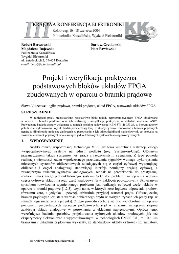 Robert Berezowski Magdalena Rajewska Dariusz Gretkowski Piotr Pawłowski Politechnika Koszalińska Wydział Elektroniki ul. Śniadeckich 2, 75-453 Koszalin email: [email protected] Projekt i weryfikacja praktyczna podstawowych bloków układów FPGA zbudowanych w oparciu o bramki prądowe Słowa kluczowe: logika prądowa, bramki prądowe, układ FPGA, testowanie układów FPGA STRESZCZENIE W niniejszej pracy przedstawiono podstawowe bloki układu reprogramowalnego FPGA zbudowane w oparciu o bramki prądowe, oraz ich realizację i weryfikację praktyczną w układzie scalonym ASIC. Prowadzone badania zostały wykonane w ramach projektu badawczego KBN 3T11B 059 26, w którym autorzy pełnili role wykonawców. Wyniki badań potwierdzają tezę, iż układy cyfrowe zbudowane z bramek prądowych generują kilkukrotnie mniejsze zakłócenia w porównaniu z ich odpowiednikami napięciowymi, co pozwała na stosowanie bramek prądowych w mieszanych jednoukładowych systemach analogowo-cyfrowych. 1. WPROWADZENIE Szybki rozwój współczesnej technologii VLSI już teraz umożliwia realizację całego wyspecjalizowanego systemu na jednym podłożu (ang. System-on-Chip). Głównym przeznaczeniem takich systemów jest praca z rzeczywistymi sygnałami. Z tego powodu realizacja większości zadań współczesnego przetwarzania sygnałów wymaga wykorzystania mieszanych systemów obliczeniowych składających się z części cyfrowej wykonującej obliczenia i części analogowej stanowiącej interfejs pomiędzy częścią cyfrową, a zewnętrznym światem sygnałów analogowych. Jednak na przeszkodzie do praktycznej realizacji mieszanego jednoukładowego systemu SoC stoi problem zmniejszenia wpływu części cyfrowej układu na jego część analogową (tzw. zakłóceń podłożowych). Skutecznym sposobem rozwiązania wymienionego problemu jest realizacja cyfrowej części układu w oparciu o bramki prądowe [1,2,3], czyli takie, w których zero logiczne odpowiada prądowi równemu zero, a jedynka – pewnej, arbitralnie przyjętej wartości prądu. Główną cechą bramek prądowych jest stała wartość pobieranego prądu w różnych trybach ich pracy (np. w stanach logicznego zera i jedynki). Z tego powodu cechują się one wielokrotnie mniejszym poziomem pasożytniczych sprzężeń podłożowych, stąd w znacznie mniejszym stopniu zakłócają układy analogowe w porównaniu z układami napięciowymi. Oprócz tego, wcześniejsze badania sposobów projektowania cyfrowych układów prądowych, jak też eksperymenty elektroniczne z wyprodukowanymi w technologiach CMOS 0,8 μm i 0,6 μm bramkami i układami prądowymi wykazały, że standardowe układy cyfrowe (np. sumatory, III Krajowa Konferencja Elektroniki —1— bloki operacyjne ALU itd.) zbudowane w oparciu o bramki prądowe są prostszymi logicznie (pod względem liczby wykorzystanych bramek do 50%) od ich prototypów zbudowanych w oparciu o klasyczne bramki napięciowe. Stwarza to podstawę do opracowania mieszanych analogowo-cyfrowych układów na wspólnym podłożu, w tym układów reprogramowalnych, w których część analogowa jest zbudowana w oparciu o standardowe analogowe układy reprogramowalne FPAA, natomiast cyfrowa część przedstawia sobą układ FPGA zbudowany w oparciu o bramki prądowe. W wyniku przeprowadzonej analizy istniejących rodzin układów FPGA różnych firm, jako prototyp funkcjonalny układu prądowego FPGA wybrany został blok SLICE układu FPGA Spartan II firmy Xilinx. Wybór rzeczywistego układu FPGA jako wzorca miał na celu sprawdzenie tezy, iż stosując bramki prądowe, możliwe jest zbudowanie dowolnie złożonego systemu cyfrowego, a opracowane reguły algebry prądowej i sposoby minimalizacji funkcji logicznych, umożliwiają otrzymanie układów prądowych o parametrach porównywalnych z ich prototypami napięciowymi. W związku z tym, w niniejszej pracy przedstawiono podstawowe bloki układu reprogramowalnego funkcjonalnie zgodne z odpowiednimi blokami układu Spartan II, lecz zbudowane w oparciu o bramki prądowe, oraz ich realizację i weryfikację praktyczną w układzie scalonym ASIC. Wyniki badań potwierdzają tezę, iż układy cyfrowe zbudowane z bramek prądowych generują kilkukrotnie mniejsze zakłócenia w porównaniu z ich odpowiednikami napięciowymi (przykładowo, fluktuacje wartości natężenia prądu w linii zasilania układów prądowych mieszczą się w zakresie około 10% wartości natężenia prądu przypisanej jedynce logicznej), co pozwala na stosowanie bramek prądowych w mieszanych systemach analogowo-cyfrowych. OPIS UKŁADU SCALONEGO 5 4 3 2 1 12 84 83 82 81 80 UmemCLK1 GND UmemCLK2 UmemIN YmemA YmemT1 YmemT2 YmemT3 VDD YmemOUT 2. 12 13 14 15 16 17 18 19 20 21 22 23 24 25 26 27 28 29 30 31 UKŁAD ASIC ULFIFO YLFIFO ULFRAM YLFRAM ULGFIFO YLGFIFO ULGRAM YLGRAM ULROM YLROM 39 40 41 42 43 44 45 46 47 48 Ibias WBX WBY WCE WCIN WCLK WF1 WF2 WF3 WF5 WG1 WG2 WG3 WGSR WLgtest11 WLgtest13 WLgtest16 WSR Wtest08 Wtest09 Rys. 1. Opis wyprowadzeń układu ASIC 74 73 72 71 70 69 68 67 66 65 64 63 62 61 60 59 58 57 56 55 ZCOUT ZF5 ZLgtest10 ZLgtest12 ZLgtest14 ZLgtest15 ZLgtest17 Ztest01 Ztest02 Ztest03 Ztest04 Ztest05 Ztest06 Ztest07 ZX ZXB ZXQ ZY ZYB ZYQ W obrębie prac nad weryfikacją praktyczną opracowanych układów prądowych opracowano projekt układu ASIC do testowania prototypów prądowych bloków SLICE układu FPGA SPARTAN II, którego wyprowadzenia przedstawiono na Rys. 1. Projekt wykonano kierując się regułami procesu technologicznego CMOS AMS 0.6μ firmy Austria Mikro Systeme, o minimalnej długości kanału tranzystora MOS 0,6 μm. Zaprojektowany układ ASIC zawiera jeden blok SLICE z odpowiednim fragmentem pamięci konfiguracyjnej. Wyprowadzenia układu scalonego umożliwiają dostęp do wszystkich zewnętrznych wejść i wyjść bloku SLICE i pamięci konfiguracyjnej. Ponadto, układ zawiera 17 dodatkowych wyprowadzeń ułatwiających testowanie bloku SLICE. Układ SLIC