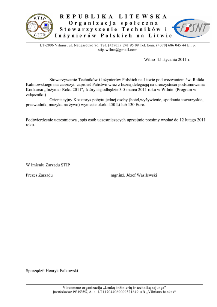REPUBLIKA LITEWSKA Organizacja społeczna Stowarzyszenie Techników i Inżynierów Polskich na Litwie LT-2006 Vilnius, ul. Naugarduko 76. Tel. (+3705) 241 95 09 Tel. kom. (+370) 686 045 44 El. p. [email protected] Wilno 15 stycznia 2011 r. Stowarzyszenie Techników i Inżynierów Polskich na Litwie pod wezwaniem św. Rafała Kalinowskiego ma zaszczyt zaprosić Państwo wraz z liczną delegacją na uroczystości podsumowania Konkursu ,,Inżynier Roku 2011'', który się odbędzie 3-5 marca 2011 roku w Wilnie (Program w załączniku) Orientacyjny Kosztorys pobytu jednej osoby (hotel,wyżywienie, spotkania towarzyskie, przewodnik, muzyka na żywo) wyniesie około 450 Lt lub 130 Euro. Podtwierdzenie uczestnictwa , spis osób uczestniczących uprzejmie prosimy wysłać do 12 lutego 2011 roku. W imieniu Zarządu STIP Prezes Zarządu mgr.inż. Józef Wasilewski Sporządził Henryk Falkowski Visuomenė organizacija „Lenkų inžinierių ir technikų sąjunga” Įmonės kodas: 193153557, A. s. LT117044060000321649 AB „Vilniaus bankas“ REPUBLIKA LITEWSKA Organizacja społeczna Stowarzyszenie Techników i Inżynierów Polskich na Litwie LT-2006 Vilnius, ul. Naugarduko 76. Tel. (+3705) 241 95 09 Tel. kom. (+370) 686 045 44 El. p. [email protected] Program Finału Konkursu ,,Inżynier Roku 2011'' w dniach 3-5 marca 2011 roku w Wilnie . Organizator Stowarzyszenie Techników i Inżynierów Polskich na Litwie Dzień 1 czwartek 3 marca 11.00-12.00 12.00-13.30 13.30-18.00 Przyjazd do DKP w Wilnie (ul Naugarduko 76) Obiad Zwiedzanie zabytków Wilna, w tym mauzoleum marszałka J. Piłsudskiego na Rossie,.Pałac Wielkich Książąt Litewskich w Wilnie- przeszłość otwarta dla przyszłości. Zwiedzanie miejsc urodzin, studiów, więzienia Wilnianina Inżyniera św. Rafała Kalinowskiego. Czas wolny Kolacja , biesiada towarzyska ,wymiana doświadczeń 18.00-19.00 19.00-21.30 Dzień 2 piątek 4 marca 8.00-9.00 9.00-13.30 śniadanie w hotelu Zwiedzanie zabytków Wilna Uniwersytet Stefana Batorego, Kościoł Dominikański w Wilnie, Podziemia Katedry. Obiad. Dania kuchni Litewskiej Czas wolny, pobyt w hotelu Uroczystości Finału Konkursu ,,Inżynier Roku 2011'' w dużej sali DKP Koncert Poczęstunek zaproszonych gości 13.30-14.30 14.30-16.00 16.00-18.30 18.30-19.30 19.30-21.00 Dzień 3 sobota 5 marca 8.00-9.00 9.00-13.00 13.00-14.00 14.00-14.00 14.00-18.00 18.00-21.00 śniadanie w hotelu Zwiedzanie Targów Kaziuk Wileński Obiad Czas wolny, pobyt w hotelu Zwiedzanie Targów Kaziuk Wileński, dla osób chętnych Muzeum Kolacja pożegnalna Dzień 4 niedziela 6 marca 8.00-9.00 9.00-10.00 10.00-12.00 12.00 śniadanie w hotelu Msza św. w Kościele św. Teresy , kaplica M:B. Ostrobramskiej Czas wolny, spacer po starówce, Zwiedzanie Targów Kaziuk Wileński, zakupy odjazd do Kraju. Na życzenie gości program może być urozmaicony. Koordynator programu członek Zarządu STIP do kontaktów z za granicą Henryk Falkowski kom. +37065537219 E mail [email protected] Visuomenė organizacija „Lenkų inžinierių ir technikų sąjunga” Įmonės kodas: 193153557, A. s. LT117044060000321649 AB „Vilniaus bankas“