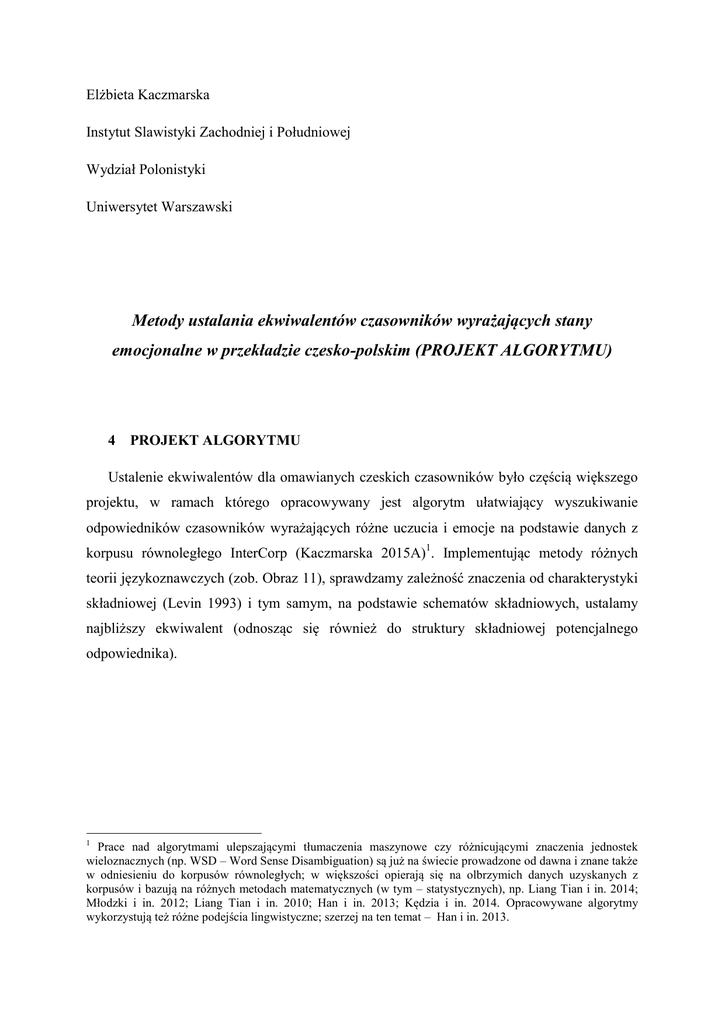 Elżbieta Kaczmarska Instytut Slawistyki Zachodniej i Południowej Wydział Polonistyki Uniwersytet Warszawski Metody ustalania ekwiwalentów czasowników wyrażających stany emocjonalne w przekładzie czesko-polskim (PROJEKT ALGORYTMU) 4 PROJEKT ALGORYTMU Ustalenie ekwiwalentów dla omawianych czeskich czasowników było częścią większego projektu, w ramach którego opracowywany jest algorytm ułatwiający wyszukiwanie odpowiedników czasowników wyrażających różne uczucia i emocje na podstawie danych z korpusu równoległego InterCorp (Kaczmarska 2015A)1. Implementując metody różnych teorii językoznawczych (zob. Obraz 11), sprawdzamy zależność znaczenia od charakterystyki składniowej (Levin 1993) i tym samym, na podstawie schematów składniowych, ustalamy najbliższy ekwiwalent (odnosząc się również do struktury składniowej potencjalnego odpowiednika). 1 Prace nad algorytmami ulepszającymi tłumaczenia maszynowe czy różnicującymi znaczenia jednostek wieloznacznych (np. WSD – Word Sense Disambiguation) są już na świecie prowadzone od dawna i znane także w odniesieniu do korpusów równoległych; w większości opierają się na olbrzymich danych uzyskanych z korpusów i bazują na różnych metodach matematycznych (w tym – statystycznych), np. Liang Tian i in. 2014; Młodzki i in. 2012; Liang Tian i in. 2010; Han i in. 2013; Kędzia i in. 2014. Opracowywane algorytmy wykorzystują też różne podejścia lingwistyczne; szerzej na ten temat – Han i in. 2013. Obraz 7: Schemat wypracowywanego algorytmu wspomagającego ustalanie ekwiwalentów. Jak zostało to przedstawione, cały algorytm składa się z kilku etapów analizy. Czasownik poddawany takiemu badaniu nie musi przechodzić przez wszystkie etapy; optymalny ekwiwalent może być odnaleziony na każdym poziomie analizy. Pierwszym krokiem jest automatyczna ekstrakcja par ekwiwalentów. Badania pilotażowe ukazały, iż wiele czasowników już na tym etapie odnajduje trafne ekwiwalenty; co ciekawe – są to na ogół czasowniki wyrażające negatywne odczucia (Kaczmarska 2013). Drugim krokiem jest ustalenie wymagań walencyjnych. Zakładamy, iż zbieżność struktur składniowych i podobieństwo semantyczne obiektów łączących się z danymi czasownikami może być kluczem do wskazania ekwiwalentu na tym etapie. Niektóre z czasowników odnajdą trafne ekwiwalenty tylko dla niektórych swoich znaczeń. Tak się dzieje w przypadku czasownika toužit.2 Czasowniki, które nie odnalazły swoich ekwiwalentów na tym etapie przechodzą do następnego. 2 Na podstawie wyników analizy walencyjnej i łączliwości udało się nam ustalić, iż ekwiwalentem czasownika toužit łączącego się z bezokolicznikiem jest polski czasownik pragnąć łączący się również z bezokolicznikiem (Kaczmarska i Rosen 2013). Trzecim krokiem, nieprzynoszącym jak do tej pory oczekiwanych rezultatów, jest identyfikowanie przypadków głębokich – roli, jakie pełnią elementy wiążące się z danym czasownikiem.3 Czwarty krok to wykorzystanie metod teorii Pattern Grammar (Ebeling i Ebeling 2013) (Hunston i Francis 2000). Ten etap ma w założeniu sprawdzić, czy istnieje zależność pomiędzy znaczeniem wyrazu a otoczeniem, w jakim występuje. Hunston i Francis twierdzą, że jeżeli jakieś słowo jest wieloznaczne, a jednocześnie pojawia się w kilku wzorcach, to każdy wzorzec pojawi się z jednym z jego znaczeń częściej niż z pozostałymi, czyli dany wzorzec wskaże najbardziej prawdopodobne znaczenie słowa. Sprawdziło się to m.in. w przypadku frazy být lito. Jeżeli jednostka být líto łączy się z dwoma frazami nominalnymi (w celowniku i dopełniaczu), wówczas taki jej wzorzec odpowiada polskiemu ekwiwalentowi żal. Jeżeli natomiast být líto łączy się tylko z celownikową frazą nominalną (oraz ewentualnie z elementem to), wzorzec ten odpowiada znaczeniu polskiej jednostki (być) przykro (Kaczmarska 2015A). Kolejnym krokiem jest etap wykorzystania założeń gramatyki kognitywnej. Na tym poziomie próbujemy odkodować znaczenie słowa w kontekście konceptualizacji zjawiska nim nazwanego. W badaniach pilotażowych analizowaliśmy jednostki mít rád i milovat. O ile poradziliśmy sobie z czasownikiem milovat, o tyle identyfikacja znaczenia jednostki mít rád i jej przekład na polski wciąż pozostaje problematyczne. Metody kognitywne jednak bardzo trudno implementować do algorytmu, ponieważ przeprowadzane są w większości manualnie.4 Ostatnie okienko to miejsce na rozwiązania przyszłościowe takie, jak np. wykorzystanie narzędzia WordSketch dla obu języków na tym samym korpusie, czy zaawansowane badania stochastyczne. Wierzymy, że dzięki nim, na podstawie badania kontekstu i rozróżnienia łączliwości z różnymi obiektami, uda nam się dopasować ekwiwalenty do wszystkich znaczeń czasownika toužit (Kaczmarska, Rosen i Hana i inni 2015), a także wszystkich innych, które nie znajdą swoich ekwiwalentów na wcześniejszych poziomach algorytmu. 3 Etap ten nie zostanie jednak usunięty z finalnej wersji algorytmu. Badane przez nas jednostki (wyrażające różne emocje i uczucia) są jednolite pod względem łączliwości z argumentami o pewnych wartościach – zawsze znajdziemy tu przeżywającego, czy źródło i na ten podstawie nie dokonamy zróżnicowania znaczenia. Algorytm może być jednak wykorzystany w badaniu innych grup czasowników, gdzie rola semantyczna oryginału i ekwiwalentu może być istotna przy różnicowaniu znaczenia. 4 W przypadkach problemowych możemy odnieść się także do eksplikacji i naturalnego metajęzyka semantycznego (Wierzbicka 1980, 2001) lub skonstruować skalę intensywności właściwości wyrażanej przez dany czasownik (Mikołajczuk 1997, 1999; Bratman 1987). 4.1. Walencja Celem analizy na tym poziomie badania jest odpowiedź, czy wymogi walencyjne 5 mogą ułatwić identyfikację polskiego ekwiwalentu danego czeskiego czasowni