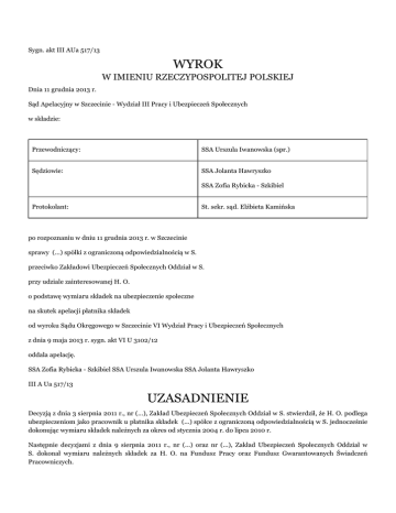 Sygn. akt III AUa 517/13 WYROK W IMIENIU RZECZYPOSPOLITEJ POLSKIEJ Dnia 11 grudnia 2013 r. Sąd Apelacyjny w Szczecinie - Wydział III Pracy i Ubezpieczeń Społecznych w składzie: Przewodniczący: SSA Urszula Iwanowska (spr.) Sędziowie: SSA Jolanta Hawryszko SSA Zofia Rybicka - Szkibiel Protokolant: St. sekr. sąd. Elżbieta Kamińska po rozpoznaniu w dniu 11 grudnia 2013 r. w Szczecinie sprawy (...) spółki z ograniczoną odpowiedzialnością w S. przeciwko Zakładowi Ubezpieczeń Społecznych Oddział w S. przy udziale zainteresowanej H. O. o podstawę wymiaru składek na ubezpieczenie społeczne na skutek apelacji płatnika składek od wyroku Sądu Okręgowego w Szczecinie VI Wydział Pracy i Ubezpieczeń Społecznych z dnia 9 maja 2013 r. sygn. akt VI U 3102/12 oddala apelację. SSA Zofia Rybicka - Szkibiel SSA Urszula Iwanowska SSA Jolanta Hawryszko III A Ua 517/13 UZASADNIENIE Decyzją z dnia 3 sierpnia 2011 r., nr (...), Zakład Ubezpieczeń Społecznych Oddział w S. stwierdził, że H. O. podlega ubezpieczeniom jako pracownik u płatnika składek (...) spółce z ograniczoną odpowiedzialnością w S. jednocześnie dokonując wymiaru składek należnych za okres od stycznia 2004 r. do lipca 2010 r. Następnie decyzjami z dnia 9 sierpnia 2011 r., nr (...) oraz nr (...), Zakład Ubezpieczeń Społecznych Oddział w S. dokonał wymiaru należnych składek za H. O. na Fundusz Pracy oraz Fundusz Gwarantowanych Świadczeń Pracowniczych. Podstawą wydania takich decyzji stanowiły ustalenia postępowania kontrolnego przeprowadzonego u płatnika, na podstawie którego ZUS stwierdził, że na okres od 2 stycznia 2004 r. do 31 grudnia 2012 r. płatnik zawarł z H. O. umowę o dzieło, której przedmiotem było przygotowanie danych i sporządzenie listy płac, przygotowanie i przekaz elektroniczny do ZUS, archiwizacja dokumentów kadrowych. Jednocześnie ustalono, że H. O. została zgłoszona do ubezpieczeń społecznych przez płatnika składek (...) spółkę z ograniczoną odpowiedzialnością jako pracownik. W konsekwencji organ rentowy uznał, że w świetle art. 8 ust 2a oraz art. 18 ust. 1 a ustawy o systemie ubezpieczeń społecznych H. O. z tytułu zawartej umowy o dzieło z pracodawcą, z którym pozostaje w stosunku pracy, jest uważana za pracownika, wobec czego zarówno przychód uzyskany ze stosunku pracy jak i z umowy o dzieło, stanowi podstawę wymiaru składek na ubezpieczenie społeczne i ubezpieczenie zdrowotne. W odwołaniach od wymienionych decyzji płatnik (...) spółka z ograniczoną odpowiedzialnością w S. wniosła o ich zmianę poprzez orzeczenie, że H. O. nie podlega ubezpieczeniom jako pracownik u płatnika składek, a podstawa wymiaru jej składek na ubezpieczenia nie jest ustalana według zasad obowiązujących pracownika, oraz domagając się zasądzenia na rzecz płatnika składek kosztów niniejszego postępowania, w tym kosztów zastępstwa procesowego według norm przepisanych. Odwołujący zarzucił zaskarżonym decyzjom: - naruszenie art. 8 ust. 2a, art. 18 ust. 1a, art. 20 ust. 1, art. 22 ust. 1 i art. 46 w związku z art. 6 ust. 1 pkt 4 w związku z art. 9 ust. 4a i ust. 4b ustawy z dnia 13 października 1998 r. o systemie ubezpieczeń społecznych w brzmieniu obowiązującym przed nowelizacją dokonaną art. 10 ustawy z dnia 20 kwietnia 2004 r. o zmianie ustawy o emeryturach i rentach z Funduszu Ubezpieczeń Społecznych oraz niektórych innych ustaw (Dz. U. nr 121, poz. 1264), w sytuacji, gdy H. O. miała w dniu zawarcia umowy ustalone prawo do emerytury, a sporna w sprawie umowa o dzieło została zawarta w dniu 2 stycznia 2004 r., tj. przed nowelizacją ustawy o systemie ubezpieczeń dokonanej ustawą z dnia 20 kwietnia 2004 r., która dopiero wprowadziła obowiązek oskładkowania umowy o dzieło zawartej przez osobę mającą ustalone prawo do emerytury za swoim pracodawcą po tej dacie, - naruszenie art. 29 ust. 1 ustawy z dnia 13 lipca 2006 r. o ochronie roszczeń pracowniczych w razie niewypłacalności pracodawcy (Dz. U. nr 158, poz. 1121) w związku z art. 9b ust. 2 cytowanej ustawy z dnia 13 lipca 2006 r. o ochronie roszczeń pracowniczych w razie niewypłacalności pracodawcy, który wszedł w życie z dniem 1 lipca 2009 r., poprzez uznanie, że spółka obowiązana jest do opłacenia składek na Fundusz Gwarantowanych Świadczeń Pracowniczych za H. O. po dniu 1 lipca 2009 r., w sytuacji gdy w chwili wejścia w życie tego przepisu H. O. ukończyła już 55 lat, zatem obowiązek odprowadzania składek na FGŚP nie istniał. W odpowiedzi na odwołania organ rentowy wniósł o ich oddalenie w całości, podtrzymując argumentację, jak w zaskarżonych decyzjach. Wyrokiem z dnia 9 maja 2013 r. Sąd Okręgowy w Szczecinie VI Wydział Pracy i Ubezpieczeń Społecznych zmienił zaskarżoną decyzję z dnia 3 sierpnia 2011 r., nr (...), i ustalił, że w podstawie wymianu składek za okres od 2 stycznia 2004 r. do 30 czerwca 2004 r. nie uwzględnia się przychodu H. O. uzyskanego z tytułu umowy o dzieło z dnia 2 stycznia 2004 r. (punkt I), zmienił zaskarżoną decyzję z dnia 9 sierpnia 2011 r. i ustalił, że od 1 lipca 2009 r. płatnik składek (...) spółka z ograniczoną odpowiedzialnością w S. nie ma obowiązku odprowadzania składek za H. O. na Fundusz Gwarantowanych Świadczeń Pracowniczych (punkt II), w pozostałym zakresie oddalił odwołania (punkt III) oraz zniósł wzajemnie między stronami koszty zastępstwa procesowego (punkt IV). Powyższe orzeczenie Sąd Okręgowy oparł o następujące ustalenia faktyczne i rozważania prawne: (...) spółka z ograniczoną odpowiedzialnością z siedzibą w S. prowadzi działalność gospodarczą, której przedmiotem jest produkcja narzędzi. W okresie od 17 lutego 2003 r. do 31 grudnia 2011 r. H. O. była zatrudniona w odpowiedzialnością na stanowisku specjalisty ds. kadrowo-płacowych. (...) spółka z ograniczoną Na mocy decyzji Zakładu Ubezpieczeń Społecznych Oddzia