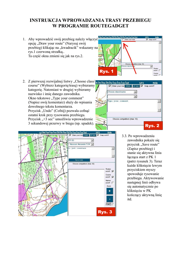 INSTRUKCJA WPROWADZANIA TRASY PRZEBIEGU W PROGRAMIE ROUTEGADGET 1. Aby wprowadzić swój przebieg należy włączyć opcję „Draw your route” (Narysuj swój przebieg) klikając na „kwadracik” wskazany na rys.1 czerwoną strzałką.. Ta część okna zmieni się jak na rys.2. Rys. 1 2. Z pierwszej rozwijalnej listwy „Choose class/ course” (Wybierz kategorię/trasę) wybieramy kategorię. Natomiast w drugiej wybieramy nazwisko i imię danego zawodnika. Okno tekstowe „Type your comment” (Napisz swój komentarz) służy do wpisania dowolnego tekstu komentarza. Przycisk „Undo” (Cofnij) pozwala cofnąć ostatni krok przy rysowaniu przebiegu. Przycisk „+3 sec” umożliwia wprowadzenie 3 sekundowej przerwy w biegu (np. upadek). Rys. 2 3.3. Po wprowadzeniu zawodnika pokaże się przycisk „Save route” (Zapisz przebieg) i stanie się aktywna linia łącząca start z PK 1 (patrz rysunek 3). Teraz każde kliknięcie lewym przyciskiem myszy spowoduje rysowanie przebiegu. Aktywowanie następnej linii odbywa się automatycznie po kliknięciu w PK kończący aktywną linię itd. Rys. 3 Rys. 4 4. Po zakończeniu rysowania przebiegu klikamy na przycisk „Save route”. Jeżeli wszystko jest dobrze powinniśmy zobaczyć w pustym oknie napis: „Thank you. Your route has been saved successfully. Back to the map page.” (Dziękujemy. Twój przebieg został zapisany prawidłowo. Wróć do strony z mapą) jeżeli nie, to w lewej górnej części pokaże się ramka z czerwonym tekstem jak na rysunku 5. Rys. 5 „Nie możesz zapisać przebiegu teraz. Upewnij się czy wybrałeś swoje nazwisko z listy zawodników, czy narysowałeś przebiegi przez wszystkie punkty kontrolne i wprowadziłeś swój czas mety jeżeli byłeś o to zapytany. W razie konieczności użyj przycisku „Undo” aby anulować ostatni krok.” 5. Usunąć dany przebieg może jedynie administrator strony. Opr. Marek Sobiegraj