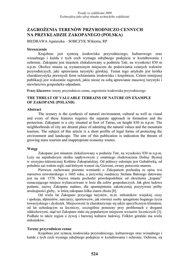 Trendy ve vzdělávání 2008 Technosféra jako zdroj obsahu technického vzdělávání ZAGROŻENIA TERENÓW PRZYRODNICZO CENNYCH NA PRZYKŁADZIE ZAKOPANEGO (POLSKA) BIEDRAWA Agnieszka – SOBCZYK Wiktoria, RP Streszczenie Krajobraz jest syntezą środowiska przyrodniczego, kulturowego oraz wizualnego i każda z tych cech wymaga odrębnego podejścia w kształtowaniu i ochronie. Zakopane jest miastem zlokalizowany u podnóża Tatr, na wysokości 830 m n.p.m. Okolice miasta są wymarzonym miejscem do podziwiania cennych walorów przyrodniczych, jaki uprawiania turystyki górskiej. Temat tego artykułu jest krótka charakterystyka prawnych form ochraniania środowiska i krajobrazu. Celem niniejszej publikacji jest wskazanie zagrożeń, jakie niesie za sobą uprawianie masowej turystyki i niewłaściwa gospodarka odpadami. Frazy kluczowe: tereny przyrodniczo cenne, zagrożenia środowiska przyrodniczego THE THREAT OF VALUABLE TERRAINS OF NATURE ON EXAMPLE OF ZAKOPANE (POLAND) Abstract The scenery is the synthesis of natural environment, cultural as well as visual and every of these features requires the separate approach in formation and the protection. Zakopane is a city situated at foot of Tatras, on height 830 m n.p.m. The neighborhoods of city are dreamt place of admiring the natural values and the mountain tourism. The subject of this article is a short profile of legal forms of protecting the environment and landscape. The aim of this publication is indication the threats of growing mass tourism and inappropriate economy wastes. Wstęp Zakopane jest miastem zlokalizowany u podnóża Tatr, na wysokości 830 m n.p.m. Leży na najmłodszym stożku napływowym z ostatniego zlodowacenia Doliny Bystrej w erozyjno-tektonicznej Kotlinie Zakopiańskiej. Od północy osłonięte jest Gubałówką, od południa zaś wałem regli, nad którymi wznosi się Giewont, zwany potocznie murem. Pierwsze zachowane pisemne wzmianki o Zakopanem pochodzą ze spisu wsi starostwa nowotarskiego z 1605 roku, a przywilej osadniczy Stefana Batorego datowany jest na rok 1578. Nazwa miasta pochodzi prawdopodobnie od określenia „kopane” oznaczającego miejsce wykarczowane w lesie dla celów gospodarczych. Jak głosi ludowe podanie, nazwę Zakopane nadano, dla upamiętnienia zakończonej pozytywnie próby urodzajności gleby, w którą zakopano kilka ziaren zboża [8]. Od wielu lat Zakopane przyciąga turystów, m.in. miłośników wiejskiej ciszy i spokoju, alpinistów, narciarzy, sportowców, jak również osoby spragnione bogatego życia towarzyskiego i dyskotek. Miejscowość ta charakteryzuje się także specyficznym klimatem, od lat uchodzącym za leczniczy, szczególnie pomocny przy problemach z drogami oddechowymi, stąd też Zakopane stało się popularnym miejscem wczasów leczniczych [3]. Podhale to także region o żywej i barwnej kulturze ludowej. Folklor góralski ma wielu miłośników. Tereny przyrodniczo cenne Krajobraz jest syntezą środowiska przyrodniczego, kulturowego oraz wizualnego i każda z tych cech wymaga odrębnego podejścia w kształtowaniu i ochronie. Ochrona, na 524 Trendy ve vzdělávání 2008 Technosféra jako zdroj obsahu technického vzdělávání której nam najbardziej zależy, wymaga znajomości podstawowych praw ekologicznych i zasad funkcjonowania ekosystemów [6]. Według ustawy o ochronie przyrody z 2004 roku walory krajobrazowe to „wartości ekologiczne, estetyczne i kulturowe obszaru oraz związane z nim rzeźba terenu, twory i składniki przyrody, ukształtowane przez siły przyrody lub działalność człowieka” [5]. Okolice Zakopanego są, więc wymarzonym miejscem do podziwiania cennych walorów przyrodniczych, jaki uprawiania turystyki górskiej. Rys.1. Tatrzański Park Narodowy [2] Sens i rację bytu nadają temu miastu Tatry. Znajduje się tu najpiękniejsza przyroda Polski, rozciągająca się wśród wielu wspaniałych dolin, wiodących niekiedy ku samym szczytom górskim. Najważniejszym i najistotniejszym osiągnięciem było utworzenie w 1954 roku Tatrzańskiego Parku Narodowego. Park Narodowy został ustanowiony w celu ochrony ekosystemów i zapewnienia terenów do wypoczynku, ale także do celów edukacyjnych i naukowych [6]. Aktualnie powierzchnia jego wynosi 21 tysięcy hektarów, z czego 72% zajmują lasy, pozostałe tereny to wysokogórskie hale i turnie. Należy zaznaczyć także, że w 1993 roku TPN został uznany przez UNESCO za rezerwat biosfery, czyli międzynarodowy obszar o światowym znaczeniu [2]. Tatry położone są w centralnej części Karpat Zachodnich, stanowią najwyższy łańcuch górski w łuku Karpat. Obszar ich obejmuje polską, północną część Tatr. Łańcuch górski rozciągający się na długości 80 km i szerokości 18,5 km podzielony jest granicą polsko-słowacką. Tatry ze względu na budowę geologiczną dzielą się na dwie części: Tatry Wysokie zbudowane ze skał metamorficznych oraz Tatry Zachodnie zbudowane ze skał osadowych-wapiennych. Występują tu liczne źródła, potoki, wodospady i ponad 30 jezior, oraz obfite zasoby wód podziemnych. Fot.1,2. Tatrzański Park Narodowy [1] 525 Trendy ve vzdělávání 2008 Technosféra jako zdroj obsahu technického vzdělávání Tatry są wyjątkowo ważne ze względu na ochronę bioróżnorodności. Występuje tu około 1000 gatunków roślin, a wśród nich endemity: skalnica tatrzańska i ostróżka tatrzańska. Najbardziej znanymi przykładami flory tatrzańskiej są: świstak, kozica, niedźwiedź, ryś, borsuk, wil, jeleń, sarna. Z ptaków występują orzeł przedni, orlik krzykliwy, kania ruda, puchacz, siwerniak i płochacz skalny - ptaki typowe wyłącznie dla gór [2]. Zespoły ssaków żyjących w Tatrach, zarówno drapieżników (niedźwiedź brunatny, ryś, wilk) jak i ich ofiar (świstak, kozica, jeleń, sarna, dzik), świadczą, że środowisko tatrzańskie jest bardziej pierwotne niż inne chronione regiony w Polsce i Europie [8]. Gospodarka l