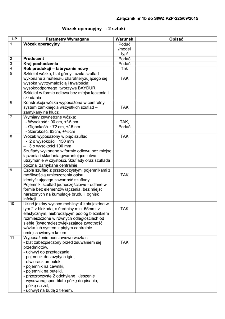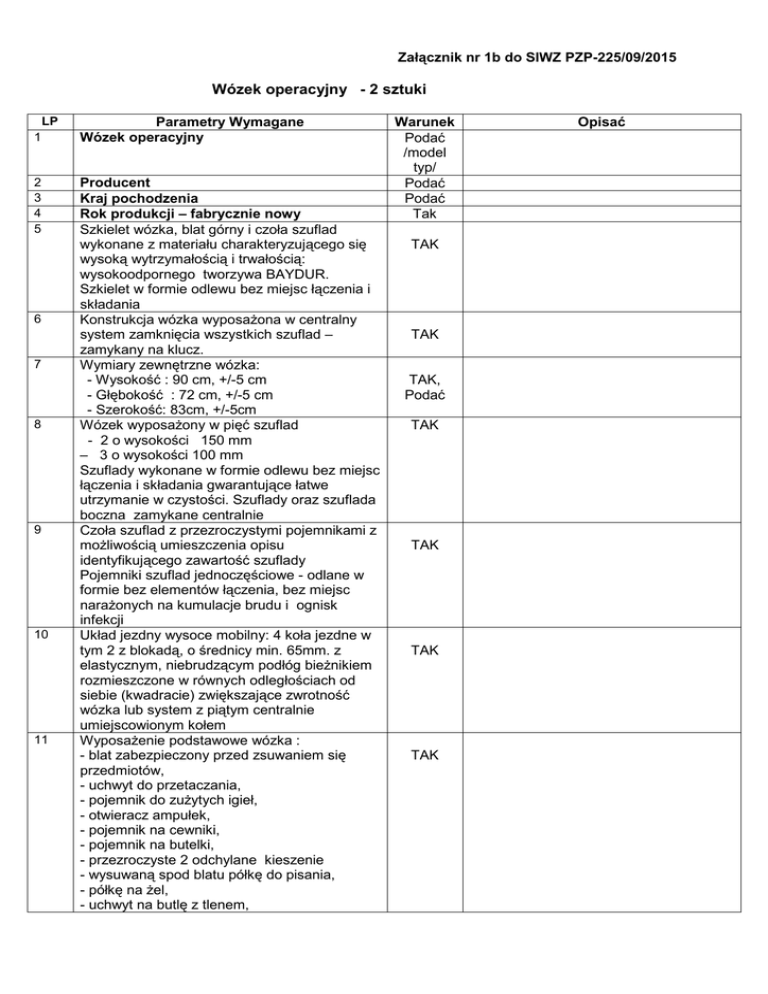 Załącznik nr 1b do SIWZ PZP-225/09/2015 Wózek operacyjny - 2 sztuki LP 1 2 3 4 5 6 7 8 9 10 11 Parametry Wymagane Wózek operacyjny Producent Kraj pochodzenia Rok produkcji – fabrycznie nowy Szkielet wózka, blat górny i czoła szuflad wykonane z materiału charakteryzującego się wysoką wytrzymałością i trwałością: wysokoodpornego tworzywa BAYDUR. Szkielet w formie odlewu bez miejsc łączenia i składania Konstrukcja wózka wyposażona w centralny system zamknięcia wszystkich szuflad – zamykany na klucz. Wymiary zewnętrzne wózka: - Wysokość : 90 cm, +/-5 cm - Głębokość : 72 cm, +/-5 cm - Szerokość: 83cm, +/-5cm Wózek wyposażony w pięć szuflad - 2 o wysokości 150 mm – 3 o wysokości 100 mm Szuflady wykonane w formie odlewu bez miejsc łączenia i składania gwarantujące łatwe utrzymanie w czystości. Szuflady oraz szuflada boczna zamykane centralnie Czoła szuflad z przezroczystymi pojemnikami z możliwością umieszczenia opisu identyfikującego zawartość szuflady Pojemniki szuflad jednoczęściowe - odlane w formie bez elementów łączenia, bez miejsc narażonych na kumulacje brudu i ognisk infekcji Układ jezdny wysoce mobilny: 4 koła jezdne w tym 2 z blokadą, o średnicy min. 65mm. z elastycznym, niebrudzącym podłóg bieżnikiem rozmieszczone w równych odległościach od siebie (kwadracie) zwiększające zwrotność wózka lub system z piątym centralnie umiejscowionym kołem Wyposażenie podstawowe wózka : - blat zabezpieczony przed zsuwaniem się przedmiotów, - uchwyt do przetaczania, - pojemnik do zużytych igieł, - otwieracz ampułek, - pojemnik na cewniki, - pojemnik na butelki, - przezroczyste 2 odchylane kieszenie - wysuwaną spod blatu półkę do pisania, - półkę na żel, - uchwyt na butlę z tlenem, Warunek Podać /model typ/ Podać Podać Tak TAK TAK TAK, Podać TAK TAK TAK TAK Opisać 12 13 - zintegrowane dwie boczne szuflady wysuwane spod blatu: jedna z wkładem ze stali nierdzewnej, druga na leki natychmiastowego użycia –ratujące życie z przezroczystą ścianką pozwalające na ich identyfikacje - nadstawkę z tworzywowymi pojemnikami - potrójny uchwyt rękawic montowany do stelaża nadstawki Wyposażenie nie powoduje zwiększenia gabarytów wózka Możliwość wyboru kolorystyki Montaż i szkolenie pracowników TAK TAK