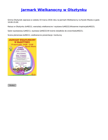 Jarmark Wielkanocny w Olsztynku Gmina Olsztynek zaprasza w sobotę 19 marca 2016 roku na Jarmark Wielkanocny na Rynek Miasta w godz. 10:00-15:00. Ratusz w Olsztynku – warsztaty wielkanocne i wystawa „Wiosenne inspiracje” Salon wystawowy – wystawa „W krainie dziadków do orzechów” Scena plenerowa – wielkanocne prezentacje i konkursy Drukuj