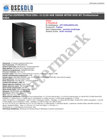 Informacje o produkcie Utworzono 02-03-2017 FUJITSU ESPRIMO P910 E90+ i3-2120 4GB 500GB INTHD DVD W7 Professional 64bit Cena : 2.713,33 zł er m ar k Nr katalogowy : VFY:P0910PF011PL Producent : Fujitsu Stan magazynowy : poniżej średniego Średnia ocena : brak recenzji w at Gwarancja: 12 miesięcy gwarancji fabrycznej Kod Producenta: VFY:P0910PF011PL System operacyjny: MS Windows 7 Professional 64 bit Płyta główna: typ D3162 ATX; Chipset Intel Q77 Platforma komputerowa: ESPRIMO P910 E90+ Procesor (rodzina): Intel Core i3 Procesor (opis): Intel Core i3-2120 processor (2 Cores / 4 Threads, 3.30 GHz, 3 MB) Pamięć zainstalowana (pojemność): 4 GB Pamięć (opis): 4GB DDR3-1600MHz, max. 32 GB, 4 DIMM (DDR3) slots 1600 MHz, Dual channel support Karta graficzna: Intel HD Graphics 2000 Karta muzyczna: Intel HD Audio - Conexant CX20642 Czytnik kart pamięci / FDD: Nie Napęd optyczny (rodzina): Super Multi Napęd optyczny (opis): DVD SuperMulti SATA Dysk twardy (pojemność): 500 GB Dysk twardy (opis): HDD SATA III 500GB 7.2k Obudowa: MICROTOWER, Zasilacz 280W Klawiatura: KB410 USB - czarna Mysz: optyczna mysz USB Wyposażenie dodatkowe: Bays: 2 x 3.5-inch external bays, 2 x 3.5-inch internal bays, 2 x 5.25-inch external bays; 6 x Serial ATA II (3 Gbit) Serial ATA , Interfejsy: 1 x Audio: line-in, 1 x Audio: line-in / microphone, 1 x Audio: line-out, 1 x Front audio: headphone, 1 x Front audio: microphone, 1 x DisplayPort, 1 (DVI-I) x DVI, 1 (optional) x eSATA, , Interfejsy: 1 x Serial (RS-232) (9pin, 16 byte FIFO, 16550 compatible), 1 (via DVI to VGA adapter, part of shipment) x VGA, , Interfejsy: 4 x USB 3.0 total, 10 x USB 2.0 total, 4x 2.0 or 2x 2.0/ 2x 3.0 x USB front, 6x 2.0 / 2x 3.0 x USB rear, 2 x USB internal, 1 x Ethernet (RJ-45), 1 (optional) x Parallel (25pin with EPP and ECP), 2 x Mouse / Keyboard (PS/2), , Slots: 1 x (170 mm / 6.7 inch) Full height, 1 x PCI slots, 1 x PCI-Express x1, 1 x PCI-Express 2.0 x4 (mech. x16) Informacje dodatkowe: Gwarancja 36 miesięcy Bring In (Realizacja w punkcie serwisowym) Wygenerowano w programie www.oscGold.com