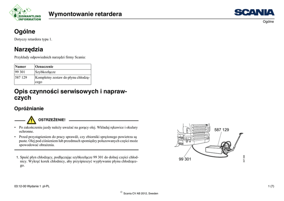 Wymontowanie retardera Ogólne Ogólne Dotyczy retardera typu 1. Narzędzia Przykłady odpowiednich narzędzi firmy Scania: Numer 99 301 587 129 Oznaczenie Szybkozłącze Kompletny zestaw do płynu chłodzącego Opis czynności serwisowych i naprawczych Opróżnianie OSTRZEŻENIE! • Po zakończeniu jazdy należy uważać na gorący olej. Wkładaj rękawice i okulary ochronne. • Przed przystąpieniem do pracy sprawdź, czy zbiorniki sprężonego powietrza są puste. Olej pod ciśnieniem lub przedmuch spomiędzy poluzowanych części może spowodować obrażenia. nicy. Wykręć korek chłodnicy, aby przyśpieszyć wypływanie płynu chłodzącego. 03:12-00 Wydanie 1 pl-PL 99 301 307 398 1. Spuść płyn chłodzący, podłączając szybkozłącze 99 301 do dolnej części chłod- 587 129 1 (7) © Scania CV AB 2012, Sweden Wymontowanie retardera Opis czynności serwisowych i naprawczych 2. Ustaw dźwignię retardera w położeniu 5 i włącz zapłon. Zasobnik zostanie opróżniony z większości oleju, który spłynie do miski olejowej retardera. 3. Odkręć korek spustowy (1) pod przekładnią planetarną i spuść olej. 03:12-00 Wydanie 1 pl-PL 2 (7) © Scania CV AB 2012, Sweden Wymontowanie retardera Opis czynności serwisowych i naprawczych 4. Odłącz przewody od retardera. 5. Wyjmij filtr oleju (2). 1 308 304 2 1. Korek spustowy 2. Filtr oleju 03:12-00 Wydanie 1 pl-PL 3 (7) © Scania CV AB 2012, Sweden Wymontowanie retardera Opis czynności serwisowych i naprawczych 6. Odłącz przewód giętki (3) od akumulatora oleju. 3 308 305 7. Wydmuchaj pozostały olej, doprowadzając sprężone powietrze do złącza (4). 4 3. Przewód giętki 4. Złącze 03:12-00 Wydanie 1 pl-PL 4 (7) © Scania CV AB 2012, Sweden Wymontowanie retardera Opis czynności serwisowych i naprawczych Wymontowanie 1. Wykręć oba korki spustowe z przewodów środka chłodzącego prowadzących do chłodnicy oleju retardera i spuścić płyn chłodzący. Zaślep przewód środka chłodzącego. 2. Spuścić płyn ze skrzyni biegów. Korek znajduje się pod przekładnią planetarną. 3. Opróżnij akumulator oleju zgodnie ze wskazówkami podanymi w instrukcjach przeglądu. 4. Spuścić olej z retardera. 5. Wymontuj przewody giętkie płynu chłodzącego. Korek wlewu oleju 03:12-00 Wydanie 1 pl-PL 5 (7) © Scania CV AB 2012, Sweden Wymontowanie retardera Opis czynności serwisowych i naprawczych 6. Wymontuj przewód giętki powietrza między zaworem proporcjonalnym a retar- derem, po stronie retardera. Przewód giętki powietrza 7. Zamontuj następujący osprzęt do podnośnika skrzyni biegów 587 313. – – – – – Belka do mocowania 98 655. Pryzma podporowa 98 401. Wspornik kątowy 98 744. Krótki trzpień do mocowania 98 700. Uchwyt do wspornika jarzma 98 404. 98 404 98 700 98 655 98 401 98 744 587 313 03:12-00 Wydanie 1 pl-PL 6 (7) © Scania CV AB 2012, Sweden Wymontowanie retardera Opis czynności serwisowych i naprawczych 8. Umieść podnośnik pod retarderem, tak aby pryzma podporowa spoczywała na obudowie retardera. Przymocuj uchwyt 98 404 do pokrywy filtra oleju retardera, wkręcając 2 śruby M8 x 40 do 2 dolnych otworów. Nie zdejmuj pokrywy. 98404 Podnośnik 9. Odkręć 9 śrub kołnierzowych mocujących retarder do skrzyni biegów, a następ- nie wyciągnij go ze skrzynki biegów. Śruby kołnierzowe 03:12-00 Wydanie 1 pl-PL 7 (7) © Scania CV AB 2012, Sweden