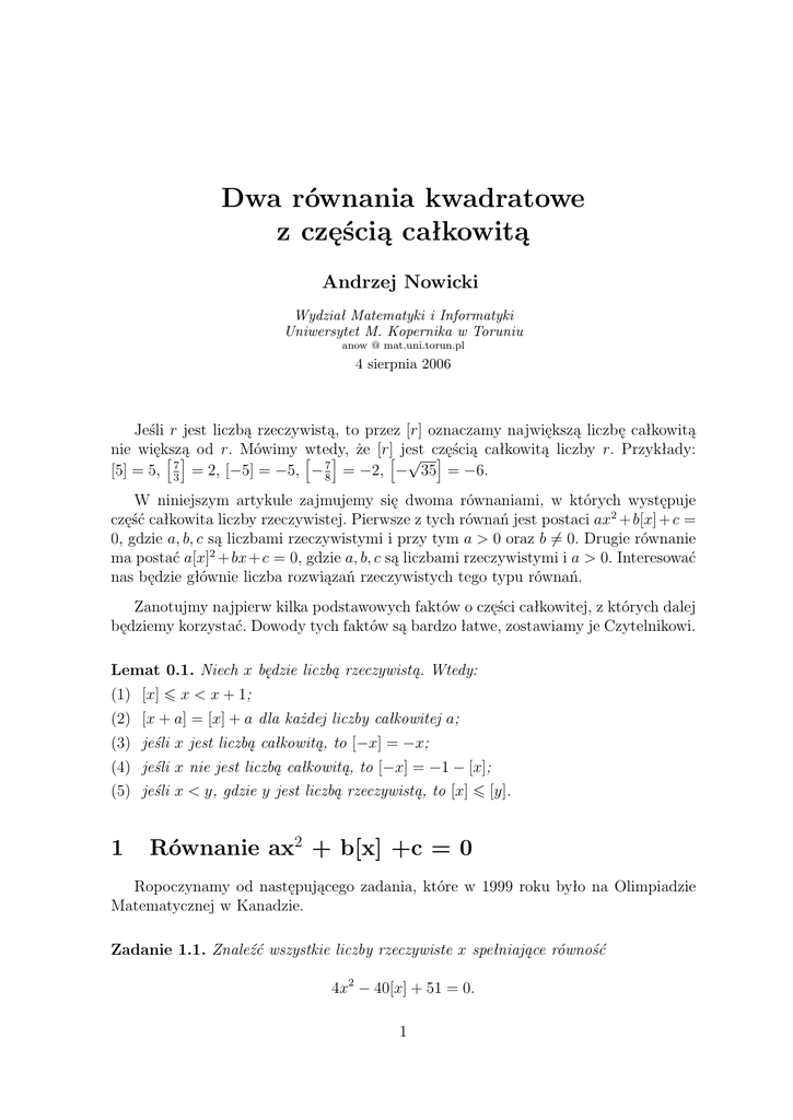 niami są liczby 1, 33, 41 i 7 (patrz [3]). Podobnego typu równania 2x2 − 3[x] + 4 = 0