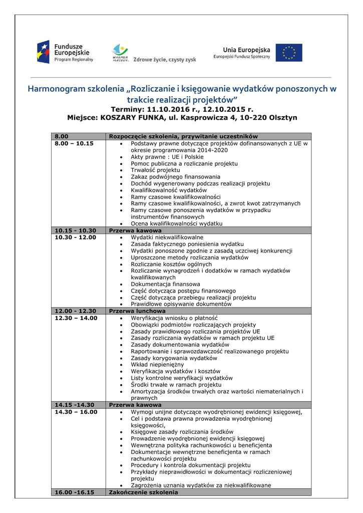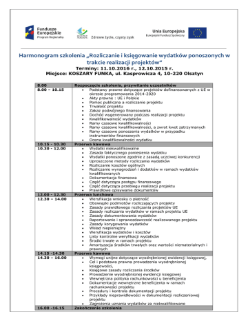 Harmonogram szkolenia „Rozliczanie i księgowanie wydatków ponoszonych w trakcie realizacji projektów” Terminy: 11.10.2016 r., 12.10.2015 r. Miejsce: KOSZARY FUNKA, ul. Kasprowicza 4, 10-220 Olsztyn 8.00 8.00 – 10.15 10.15 - 10.30 10.30 - 12.00 12.00 - 12.30 12.30 – 14.00 14.15 -14.30 14.30 – 16.00 16.00 -16.15 Rozpoczęcie szkolenia, przywitanie uczestników Podstawy prawne dotyczące projektów dofinansowanych z UE w okresie programowania 2014-2020 Akty prawne : UE i Polskie Pomoc publiczna a rozliczanie projektu Trwałość projektu Zakaz podwójnego finansowania Dochód wygenerowany podczas realizacji projektu Kwalifikowalność wydatków Ramy czasowe kwalifikowalności Ramy czasowe kwalifikowalności, a zwrot kwot zatrzymanych Ramy czasowe ponoszenia wydatków w przypadku instrumentów finansowych Ocena kwalifikowalności wydatku Przerwa kawowa Wydatki niekwalifikowalne Zasada faktycznego poniesienia wydatku Wydatki ponoszone zgodnie z zasadą uczciwej konkurencji Uproszczone metody rozliczania wydatków Rozliczanie kosztów ogólnych Rozliczanie wynagrodzeń i dodatków w ramach wydatków kwalifikowanych Dokumentacja finansowa Część dotycząca postępu finansowego Część dotycząca przebiegu realizacji projektu Prawidłowe opisywanie dokumentów Przerwa lunchowa Weryfikacja wniosku o płatność Obowiązki podmiotów rozliczających projekty Zasady prawidłowego rozliczania projektów UE Zasady rozliczania wydatków w ramach projektu UE Zasady dokumentowania wydatków Raportowanie i sprawozdawczość realizowanego projektu Zasady korygowania wydatków Wkład niepieniężny Weryfikacja wydatków i kosztów Listy kontrolne weryfikacji wydatków Środki trwałe w ramach projektu Amortyzacja środków trwałych oraz wartości niematerialnych i prawnych Przerwa kawowa Wymogi unijne dotyczące wyodrębnionej ewidencji księgowej, Cel i podstawa prawna prowadzenia wyodrębnionej księgowości, Księgowe zasady rozliczania środków Prowadzenie wyodrębnionej ewidencji księgowej Wewnętrzna polityka rachunkowości u beneficjenta Dokumentacje wewnętrzne beneficjenta w ramach rachunkowości projektu Procedury i kontrola dokumentacji projektu Przykłady nieprawidłowości w dokumentacji rozliczeniowej projektu Zagrożenia uznania wydatków za niekwalifikowane Zakończenie szkolenia