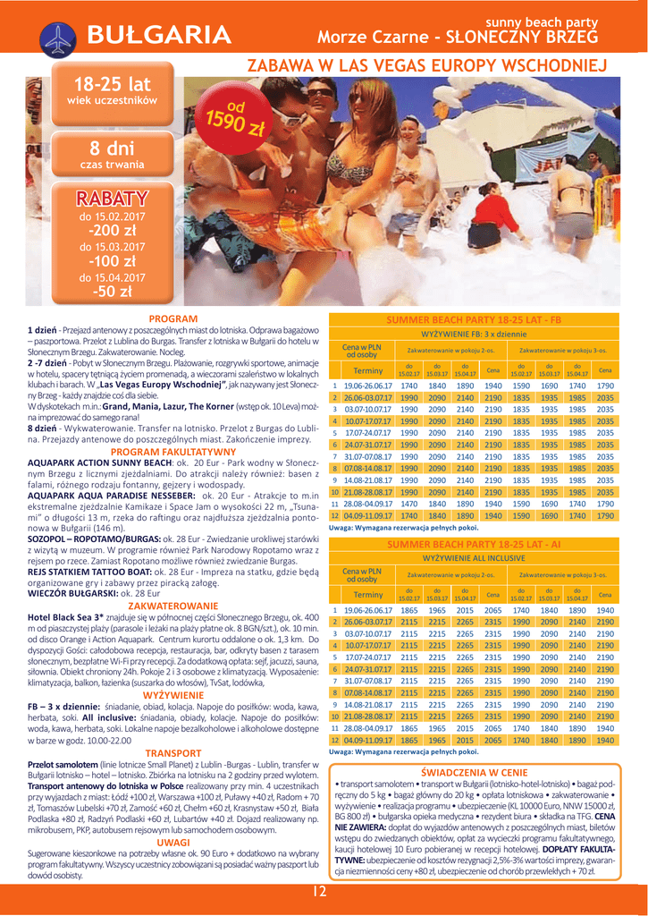 sunny beach party BUŁGARIA Morze Czarne - SŁONECZNY BRZEG ZABAWA W LAS VEGAS EUROPY WSCHODNIEJ 18-25 lat wiek uczestników 8 dni od 1590 zł czas trwania RABATY do 15.02.2017 -200 zł do 15.03.2017 -100 zł do 15.04.2017 -50 zł PROGRAM 1 dzień - Przejazd antenowy z poszczególnych miast do lotniska. Odprawa bagażowo – paszportowa. Przelot z Lublina do Burgas. Transfer z lotniska w Bułgarii do hotelu w Słonecznym Brzegu. Zakwaterowanie. Nocleg. 2 -7 dzień - Pobyt w Słonecznym Brzegu. Plażowanie, rozgrywki sportowe, animacje w hotelu, spacery tętniącą życiem promenadą, a wieczorami szaleństwo w lokalnych klubach i barach. W „Las Vegas Europy Wschodniej”, jak nazywany jest Słoneczny Brzeg - każdy znajdzie coś dla siebie. W dyskotekach m.in.: Grand, Mania, Lazur, The Korner (wstęp ok. 10 Leva) można imprezować do samego rana! 8 dzień - Wykwaterowanie. Transfer na lotnisko. Przelot z Burgas do Lublina. Przejazdy antenowe do poszczególnych miast. Zakończenie imprezy. PROGRAM FAKULTATYWNY AQUAPARK ACTION SUNNY BEACH: ok. 20 Eur - Park wodny w Słonecznym Brzegu z licznymi zjeżdalniami. Do atrakcji należy również: basen z falami, różnego rodzaju fontanny, gejzery i wodospady. AQUAPARK AQUA PARADISE NESSEBER: ok. 20 Eur - Atrakcje to m.in ekstremalne zjeżdzalnie Kamikaze i Space Jam o wysokości 22 m, „Tsunami” o długości 13 m, rzeka do raftingu oraz najdłuższa zjeżdzalnia pontonowa w Bułgarii (146 m). SOZOPOL – ROPOTAMO/BURGAS: ok. 28 Eur - Zwiedzanie urokliwej starówki z wizytą w muzeum. W programie również Park Narodowy Ropotamo wraz z rejsem po rzece. Zamiast Ropotano możliwe również zwiedzanie Burgas. REJS STATKIEM TATTOO BOAT: ok. 28 Eur - Impreza na statku, gdzie będą organizowane gry i zabawy przez piracką załogę. WIECZÓR BUŁGARSKI: ok. 28 Eur ZAKWATEROWANIE Hotel Black Sea 3* znajduje się w północnej części Słonecznego Brzegu, ok. 400 m od piaszczystej plaży (parasole i leżaki na plaży płatne ok. 8 BGN/szt.), ok. 10 min. od disco Orange i Action Aquapark. Centrum kurortu oddalone o ok. 1,3 km. Do dyspozycji Gości: całodobowa recepcja, restauracja, bar, odkryty basen z tarasem słonecznym, bezpłatne Wi-Fi przy recepcji. Za dodatkową opłata: sejf, jacuzzi, sauna, siłownia. Obiekt chroniony 24h. Pokoje 2 i 3 osobowe z klimatyzacją. Wyposażenie: klimatyzacja, balkon, łazienka (suszarka do włosów), TvSat, lodówka, WYŻYWIENIE FB – 3 x dziennie: śniadanie, obiad, kolacja. Napoje do posiłków: woda, kawa, herbata, soki. All inclusive: śniadania, obiady, kolacje. Napoje do posiłków: woda, kawa, herbata, soki. Lokalne napoje bezalkoholowe i alkoholowe dostępne w barze w godz. 10.00-22.00 TRANSPORT SUMMER BEACH PARTY 18-25 LAT - FB WYŻYWIENIE FB: 3 x dziennie Cena w PLN od osoby Zakwaterowanie w pokoju 2-os. Terminy 1 19.06-26.06.17 2 26.06-03.07.17 3 03.07-10.07.17 4 5 6 7 8 9 10 11 12 10.07-17.07.17 17.07-24.07.17 24.07-31.07.17 31.07-07.08.17 07.08-14.08.17 14.08-21.08.17 21.08-28.08.17 28.08-04.09.17 04.09-11.09.17 do 15.02.17 do 15.03.17 do 15.04.17 1740 1990 1990 1990 1990 1990 1990 1990 1990 1990 1470 1740 1840 2090 2090 2090 2090 2090 2090 2090 2090 2090 1840 1840 1890 2140 2140 2140 2140 2140 2140 2140 2140 2140 1890 1890 Zakwaterowanie w pokoju 3-os. Cena do 15.02.17 do 15.03.17 do 15.04.17 Cena 1940 2190 2190 2190 2190 2190 2190 2190 2190 2190 1940 1940 1590 1835 1835 1835 1835 1835 1835 1835 1835 1835 1590 1590 1690 1935 1935 1935 1935 1935 1935 1935 1935 1935 1690 1690 1740 1985 1985 1985 1985 1985 1985 1985 1985 1985 1740 1740 1790 2035 2035 2035 2035 2035 2035 2035 2035 2035 1790 1790 Uwaga: Wymagana rezerwacja pełnych pokoi. SUMMER BEACH PARTY 18-25 LAT - AI WYŻYWIENIE ALL INCLUSIVE Cena w PLN od osoby Terminy 1 19.06-26.06.17 2 26.06-03.07.17 3 4 5 6 7 8 9 10 11 12 03.07-10.07.17 10.07-17.07.17 17.07-24.07.17 24.07-31.07.17 31.07-07.08.17 07.08-14.08.17 14.08-21.08.17 21.08-28.08.17 28.08-04.09.17 04.09-11.09.17 Zakwaterowanie w pokoju 2-os. do 15.02.17 1865 2115 2115 2115 2115 2115 2115 2115 2115 2115 1865 1865 do do 15.03.17 15.04.17 1965 2215 2215 2215 2215 2215 2215 2215 2215 2215 1965 1965 2015 2265 2265 2265 2265 2265 2265 2265 2265 2265 2015 2015 Zakwaterowanie w pokoju 3-os. Cena do 15.02.17 do 15.03.17 do 15.04.17 Cena 2065 2315 2315 2315 2315 2315 2315 2315 2315 2315 2065 2065 1740 1990 1990 1990 1990 1990 1990 1990 1990 1990 1740 1740 1840 2090 2090 2090 2090 2090 2090 2090 2090 2090 1840 1840 1890 2140 2140 2140 2140 2140 2140 2140 2140 2140 1890 1890 1940 2190 2190 2190 2190 2190 2190 2190 2190 2190 1940 1940 Uwaga: Wymagana rezerwacja pełnych pokoi. Przelot samolotem (linie lotnicze Small Planet) z Lublin -Burgas - Lublin, transfer w Bułgarii lotnisko – hotel – lotnisko. Zbiórka na lotnisku na 2 godziny przed wylotem. Transport antenowy do lotniska w Polsce realizowany przy min. 4 uczestnikach przy wyjazdach z miast: Łódź +100 zł, Warszawa +100 zł, Puławy +40 zł, Radom + 70 zł, Tomaszów Lubelski +70 zł, Zamość +60 zł, Chełm +60 zł, Krasnystaw +50 zł, Biała Podlaska +80 zł, Radzyń Podlaski +60 zł, Lubartów +40 zł. Dojazd realizowany np. mikrobusem, PKP, autobusem rejsowym lub samochodem osobowym. UWAGI Sugerowane kieszonkowe na potrzeby własne ok. 90 Euro + dodatkowo na wybrany program fakultatywny. Wszyscy uczestnicy zobowiązani są posiadać ważny paszport lub dowód osobisty. 12 ŚWIADCZENIA W CENIE • transport samolotem • transport w Bułgarii (lotnisko-hotel-lotnisko) • bagaż podręczny do 5 kg • bagaż główny do 20 kg • opłata lotniskowa • zakwaterowanie • wyżywienie • realizacja programu • ubezpieczenie (KL 10000 Euro, NNW 15000 zł, BG 800 zł) • bułgarska opieka medyczna • rezydent biura • składka na TFG. CENA NIE ZAWIERA: dopłat do wyjazdów antenowych z poszczególnych miast, biletów wstępu do zwiedzanych obiektów, opłat za wycieczki programu fakultatywnego, kaucji hotelowej 10 Euro pobieranej w