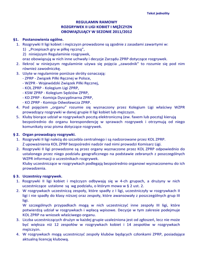 Tekst jednolity REGULAMIN RAMOWY ROZGRYWEK II LIGI KOBIET I MĘŻCZYZN OBOWIĄZUJĄCY W SEZONIE 2011/2012 §1. Postanowienia ogólne. 1. Rozgrywki II ligi kobiet i mężczyzn prowadzone są zgodnie z zasadami zawartymi w: 1) „Przepisach gry w piłkę ręczną”, 2) niniejszym Regulaminie rozgrywek, oraz obowiązują w nich inne uchwały i decyzje Zarządu ZPRP dotyczące rozgrywek. 2. Ilekroć w niniejszym regulaminie używa się pojęcia „zawodnik” to rozumie się pod nim również zawodniczkę. 3. Użyte w regulaminie poniższe skróty oznaczają: - ZPRP - Związek Piłki Ręcznej w Polsce, - WZPR - Wojewódzki Związek Piłki Ręcznej, - KOL ZPRP - Kolegium Ligi ZPRP, - KSW ZPRP - Kolegium Sędziów ZPRP, - KD ZPRP - Komisja Dyscyplinarna ZPRP, - KO ZPRP - Komisja Odwoławcza ZPRP. 4. Pod pojęciem „organu” rozumie się wyznaczony przez Kolegium Ligi właściwy WZPR prowadzący rozgrywki w danej grupie II ligi kobiet lub mężczyzn. 5. Kluby biorące udział w rozgrywkach pocztą elektroniczną (ew. faxem lub pocztą) kierują bezpośrednio do organu korespondencję w sprawach rozgrywek i otrzymują od niego komunikaty oraz pisma dotyczące rozgrywek. § 2. Organ prowadzący rozgrywki. 1. Rozgrywki II ligi należą do szczebla centralnego i są nadzorowane przez KOL ZPRP. Z upoważnienia KOL ZPRP bezpośredni nadzór nad nimi prowadzi Komisarz Ligi. 2. Rozgrywki II ligi prowadzone są przez organy wyznaczone przez KOL ZPRP odpowiednio do ustalonego przez niego podziału geograficznego na podstawie zebranych z poszczególnych WZPR informacji o uczestnikach rozgrywek. Kluby uczestniczące w rozgrywkach podlegają bezpośrednio organowi wyznaczonemu do ich prowadzenia. § 3. Uczestnicy rozgrywek. 1. Rozgrywki II ligi kobiet i mężczyzn odbywają się w 4-ch grupach, a drużyny w nich uczestniczące ustalone są wg podziału, o którym mowa w § 2 ust. 2. 2. W rozgrywkach uczestniczą zespoły, które spadły z I ligi, uczestniczyły w rozgrywkach II ligi i nie spadły do klasy niższej oraz zespoły, które awansowały z poszczególnych grup III ligi. W szczególnych przypadkach mogą w nich uczestniczyć inne zespoły III ligi, które potwierdzą udział w rozgrywkach i wpłacą wpisowe. Decyzje w tym zakresie podejmuje KOL ZPRP na wniosek właściwego organu. 3. Liczba uczestniczących drużyn w każdej grupie uzależniona jest od zgłoszeń, lecz nie może być większa niż 12 zespołów w rozgrywkach kobiet i 14 zespołów w rozgrywkach mężczyzn. 4. W rozgrywkach mogą uczestniczyć zespoły klubów będących członkami ZPRP, posiadające aktualną licencję klubową. -2- § 4. System rozgrywek. 1. W zależności od liczby zespołów uczestniczących w poszczególnych grupach rozgrywek II ligi kobiet i mężczyzn obowiązują następujące systemy: 1) dwurundowy, każdy z każdym, mecz i rewanż, – jeżeli w danej grupie uczestniczy co najmniej 5 zespołów; 2) czterorundowy, każdy z każdym, mecz i rewanż, – jeżeli w danej grupie uczestniczy mniej niż 5 zespołów. 2. Do klasyfikacji końcowej zalicza się wyniki ze wszystkich rozegranych spotkań. § 5. Zasady awansu i spadku. 1. Zespoły, które zwyciężą w poszczególnych grupach II ligi awansują do rozgrywek I ligi. W przypadku rezygnacji z awansu zwycięzcy grupy do I ligi awansuje zespół, który zajął 2 miejsce w rozgrywkach danej grupy. 2. Zespół, który zajmie 2-gie miejsce w rozgrywkach mężczyzn uczestniczy w barażu I stopnia (mecz i rewanż) rozgrywanego pomiędzy wicemistrzami grup. Pary barażu I stopnia ustala KOL ZPRP z uwzględnieniem kryterium geograficznego, a gospodarzy pierwszych zawodów w drodze losowania. Zwycięzcy barażu I stopnia grają w barażu II stopnia z X-tymi zespołami I ligi mężczyzn. Pary ustala KOL ZPRP z uwzględnieniem kryterium geograficznego. Gospodarzem zawodów rewanżowych jest X-ty zespół I ligi mężczyzn. O wyniku barażu decydują kolejno: liczba zdobytych punktów, dodatnia różnica bramek, a w przypadku, gdy jest ona równa, większa liczba bramek zdobytych na wyjeździe. Jeżeli i ta różnica jest równa, to decydują rzuty karne wykonywane zgodnie z „Przepisami gry w piłkę ręczną”. Zwycięzcy barażu II stopnia w następnym sezonie uczestniczą w rozgrywkach I ligi mężczyzn, a pokonani w rozgrywkach II ligi mężczyzn. 3. Generalnie obowiązującą jest zasada, że uczestniczący w rozgrywkach II ligi zespół klubu posiadającego również zespół w I lidze nie może awansować i uczestniczyć w rozgrywkach barażowych o wejście do niej. Nie dotyczy to przypadku, gdy zespół uczestniczący w rozgrywkach I ligi spada do II ligi, przy czym decyzje w takich szczególnych okolicznościach podejmuje KOL ZPRP na wniosek organu, zgodnie z ustaleniami ust. 5. 4. Do niższej klasy, w zależności od liczby zespołów uczestniczących w rozgrywkach danej grupy II ligi, spada: 1) jeden zespół – w przypadku grupy z udziałem do 10 zespołów, 2) dwa zespoły – w przypadku grupy z udziałem ponad 10 zespołów. 5. W przypadkach szczególnych, związanych z awansami i spadkami, decyzje na wniosek właściwego organu podejmuje KOL ZPRP. § 6. Zasady finansowe uczestnictwa. 1. Kluby uczestniczące w rozgrywkach sezonu 2011/2012 wpłacają na konto organu (organ prowadzący obowiązany jest podać nr r-ku bankowego): 1) wpisowe i kaucję w wysokościach podanych w ust. 2, podlegającą przepadkowi na rzecz organu w przypadku wycofania zespołu z rozgrywek oraz zabezpieczającą pokrycie nałożonych na niego kar grzywny i przesyłają potwierdzenie dokonania tych wpłat w terminie ustalonym przez ten organ, lecz przed rozpoczęciem I rundy rozgrywek; 2) grzywny z tytułu kar, o których mowa w § 19. 2. Wysokość wpłat za udział w rozgrywkach w sezonie 2011/2012 wynosi: 1) wpisowe II liga kobiet - 1.000 zł, -3- 3. 4. 5. 6. 7. 8. II liga mężczyzn - 1.500 zł, 2) kaucja II liga kobiet – 1.000 zł, II liga mężczyzn – 2.000 zł. 