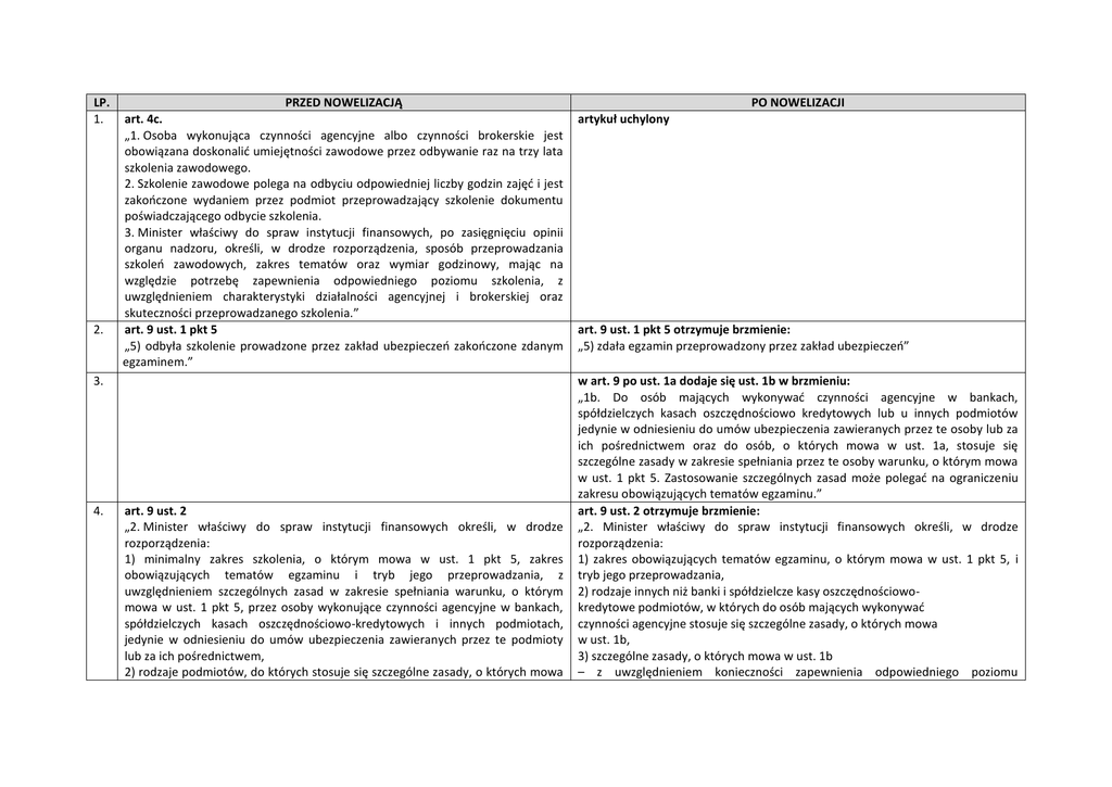 LP. 1. 2. PRZED NOWELIZACJĄ art. 4c. „1. Osoba wykonująca czynności agencyjne albo czynności brokerskie jest obowiązana doskonalić umiejętności zawodowe przez odbywanie raz na trzy lata szkolenia zawodowego. 2. Szkolenie zawodowe polega na odbyciu odpowiedniej liczby godzin zajęć i jest zakończone wydaniem przez podmiot przeprowadzający szkolenie dokumentu poświadczającego odbycie szkolenia. 3. Minister właściwy do spraw instytucji finansowych, po zasięgnięciu opinii organu nadzoru, określi, w drodze rozporządzenia, sposób przeprowadzania szkoleń zawodowych, zakres tematów oraz wymiar godzinowy, mając na względzie potrzebę zapewnienia odpowiedniego poziomu szkolenia, z uwzględnieniem charakterystyki działalności agencyjnej i brokerskiej oraz skuteczności przeprowadzanego szkolenia.” art. 9 ust. 1 pkt 5 „5) odbyła szkolenie prowadzone przez zakład ubezpieczeń zakończone zdanym egzaminem.” 3. 4. art. 9 ust. 2 „2. Minister właściwy do spraw instytucji finansowych określi, w drodze rozporządzenia: 1) minimalny zakres szkolenia, o którym mowa w ust. 1 pkt 5, zakres obowiązujących tematów egzaminu i tryb jego przeprowadzania, z uwzględnieniem szczególnych zasad w zakresie spełniania warunku, o którym mowa w ust. 1 pkt 5, przez osoby wykonujące czynności agencyjne w bankach, spółdzielczych kasach oszczędnościowo-kredytowych i innych podmiotach, jedynie w odniesieniu do umów ubezpieczenia zawieranych przez te podmioty lub za ich pośrednictwem, 2) rodzaje podmiotów, do których stosuje się szczególne zasady, o których mowa PO NOWELIZACJI artykuł uchylony art. 9 ust. 1 pkt 5 otrzymuje brzmienie: „5) zdała egzamin przeprowadzony przez zakład ubezpieczeń” w art. 9 po ust. 1a dodaje się ust. 1b w brzmieniu: „1b. Do osób mających wykonywać czynności agencyjne w bankach, spółdzielczych kasach oszczędnościowo kredytowych lub u innych podmiotów jedynie w odniesieniu do umów ubezpieczenia zawieranych przez te osoby lub za ich pośrednictwem oraz do osób, o których mowa w ust. 1a, stosuje się szczególne zasady w zakresie spełniania przez te osoby warunku, o którym mowa w ust. 1 pkt 5. Zastosowanie szczególnych zasad może polegać na ograniczeniu zakresu obowiązujących tematów egzaminu.” art. 9 ust. 2 otrzymuje brzmienie: „2. Minister właściwy do spraw instytucji finansowych określi, w drodze rozporządzenia: 1) zakres obowiązujących tematów egzaminu, o którym mowa w ust. 1 pkt 5, i tryb jego przeprowadzania, 2) rodzaje innych niż banki i spółdzielcze kasy oszczędnościowokredytowe podmiotów, w których do osób mających wykonywać czynności agencyjne stosuje się szczególne zasady, o których mowa w ust. 1b, 3) szczególne zasady, o których mowa w ust. 1b – z uwzględnieniem konieczności zapewnienia odpowiedniego poziomu 5. 6. 7. 8. w pkt 1 - z uwzględnieniem w szczególności konieczności zapewnienia odpowiedniego poziomu kwalifikacji osób wykonujących czynności agencyjne.” art. 11 ust. 7a „7a. W przypadku agenta ubezpieczeniowego, o którym mowa w art. 16, przepisów ust. 2 i 3 nie stosuje się, jeżeli agent ubezpieczeniowy posiada ustanowione w państwie członkowskim Unii Europejskiej ubezpieczenie odpowiedzialności cywilnej lub inną równoważną gwarancję w kwocie 1.000.000 euro w odniesieniu do jednego zdarzenia oraz 1.500.000 euro w odniesieniu do wszystkich zdarzeń za szkody powstałe z tytułu wykonywania czynności agencyjnych wyrządzone klientowi, ubezpieczającemu, ubezpieczonemu lub osobie uprawnionej z umowy ubezpieczenia.” art. 11 ust. 8 „8. Minister właściwy do spraw instytucji finansowych, po zasięgnięciu opinii ogólnopolskich organizacji pośredników ubezpieczeniowych i Polskiej Izby Ubezpieczeń, określi, w drodze rozporządzenia, szczegółowy zakres ubezpieczenia obowiązkowego, o którym mowa w ust. 3, termin powstania obowiązku ubezpieczenia oraz minimalną sumę gwarancyjną, biorąc w szczególności pod uwagę specyfikę wykonywanej działalności oraz zakres realizowanych zadań.” art. 17 ust. 3 pkt 4 „4) ustanowione ubezpieczenie odpowiedzialności cywilnej lub inną równoważną gwarancję w kwocie 1.000.000 euro w odniesieniu do jednego zdarzenia oraz 1.500.000 euro w odniesieniu do wszystkich zdarzeń za szkody powstałe z tytułu wykonywania czynności agencyjnych wyrządzone osobie poszukującej ochrony ubezpieczeniowej, ubezpieczającemu, ubezpieczonemu lub osobie uprawnionej z umowy ubezpieczenia, jeżeli agent ubezpieczeniowy nie był zobowiązany do zawarcia umowy ubezpieczenia, o którym mowa w art. 11 ust. 3.” art. 22 ust. 3 „3. W przypadku brokera ubezpieczeniowego, o którym mowa w art. 31, przepisu ust. 1 nie stosuje się, jeżeli broker ubezpieczeniowy posiada ustanowione w państwie członkowskim Unii Europejskiej ubezpieczenie odpowiedzialności cywilnej lub inną równoważną gwarancję w kwocie 1.000.000 euro w odniesieniu do jednego zdarzenia oraz 1.500.000 euro w odniesieniu do wszystkich zdarzeń za szkody powstałe z tytułu wykonywania czynności brokerskich wyrządzone osobie poszukującej ochrony ubezpieczeniowej, ubezpieczającemu, ubezpieczonemu lub osobie uprawnionej z umowy ubezpieczenia.” kwalifikacji osób wykonujących czynności agencyjne.”; art. 11 ust. 7a otrzymuje brzmienie: „7a. W przypadku agenta ubezpieczeniowego, o którym mowa w art. 16, przepisów ust. 2 i 3 nie stosuje się, jeżeli agent ubezpieczeniowy posiada ustanowione w państwie członkowskim Unii Europejskiej ubezpieczenie odpowiedzialności cywilnej lub inną równoważną gwarancję, której wysokość odpowiada co najmniej minimalnej sumie gwarancyjnej określonej w przepisach wydanych na podstawie ust. 8.” art. 11 ust. 8. otrzymuje brzmienie: „8. Minister właściwy do spraw instytucji finansowych określi, w drodze rozporządzenia, szczegółowy zakres ubezpieczenia obowiązkowego, o którym mowa w ust. 3