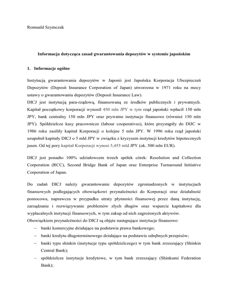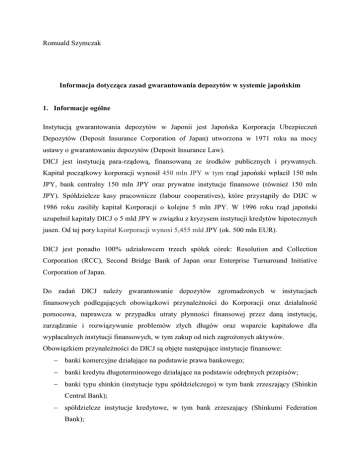 Romuald Szymczak Informacja dotycząca zasad gwarantowania depozytów w systemie japońskim 1. Informacje ogólne Instytucją gwarantowania depozytów w Japonii jest Japońska Korporacja Ubezpieczeń Depozytów (Deposit Insurance Corporation of Japan) utworzona w 1971 roku na mocy ustawy o gwarantowaniu depozytów (Deposit Insurance Law). DICJ jest instytucją para-rządową, finansowaną ze środków publicznych i prywatnych. Kapitał początkowy korporacji wynosił 450 mln JPY w tym rząd japoński wpłacił 150 mln JPY, bank centralny 150 mln JPY oraz prywatne instytucje finansowe (równieŜ 150 mln JPY). Spółdzielcze kasy pracownicze (labour cooperatives), które przystąpiły do DIJC w 1986 roku zasiliły kapitał Korporacji o kolejne 5 mln JPY. W 1996 roku rząd japoński uzupełnił kapitały DICJ o 5 mld JPY w związku z kryzysem instytucji kredytów hipotecznych jusen. Od tej pory kapitał Korporacji wynosi 5,455 mld JPY (ok. 500 mln EUR). DICJ jest ponadto 100% udziałowcem trzech spółek córek: Resolution and Collection Corporation (RCC), Second Bridge Bank of Japan oraz Enterprise Turnaround Initiative Corporation of Japan. Do zadań DICJ naleŜy gwarantowanie depozytów zgromadzonych w instytucjach finansowych podlegających obowiązkowi przynaleŜności do Korporacji oraz działalność pomocowa, naprawcza w przypadku utraty płynności finansowej przez daną instytucję, zarządzanie i rozwiązywanie problemów złych długów oraz wsparcie kapitałowe dla wypłacalnych instytucji finansowych, w tym zakup od nich zagroŜonych aktywów. Obowiązkiem przynaleŜności do DICJ są objęte następujące instytucje finansowe: − banki komercyjne działające na podstawie prawa bankowego; − banki kredytu długoterminowego działające na podstawie odrębnych przepisów; − banki typu shinkin (instytucje typu spółdzielczego) w tym bank zrzeszający (Shinkin Central Bank); − spółdzielcze instytucje kredytowe, w tym bank zrzeszający (Shinkumi Federation Bank); − banki pracy, w tym bank zrzeszający (Rokinren Bank). Łącznie członkami systemu jest ponad 600 instytucji kredytowych z wymienionych powyŜej grup (w tym 149 banków komercyjnych i 279 banków typu shinkin). Wyłączone z członkostwa są natomiast zagraniczne oddziały wymienionych instytucji, rządowe instytucje finansowe i oddziały zagranicznych banków w Japonii. The Norinchukin Bank, Agricultural cooperatives, Fishermen’s cooperatives, Seafood processing cooperatives naleŜą do drugiej, działającej w Japonii instytucji gwarantującej depozyty, Savings Insurance System of the Agricultural and Fisheries Cooperative Savings Corporation. Oszczędności powierzone poczcie japońskiej (Japan Post) są zabezpieczone przez rząd japoński. Fundusze inwestycyjne są objęte gwarancjami Investor Protector Fund, podczas gdy ubezpieczenia na Ŝycie i majątkowe naleŜą do Insurance Policyholder Protection Corporation. Japońska Korporacja Ubezpieczeń Depozytów jest instytucją duŜą, zatrudniającą 359 pracowników. Kadrę zarządzającą (powoływaną przez Premiera Japonii za zgodą dwóch izb Zgromadzenia Narodowego Japonii (Houses of the Diet) stanowią: prezes, 4 zastępców prezesa, oraz audytor. Biuro DICJ składa się z dziewięciu departamentów: planowania i koordynacji, skarbowego, restrukturyzacji, gwarantowania depozytów, kontroli i windykacji, inspekcji, prawnego, audytu oraz departamentu zamiejscowego w Osace na region Kansai i zachodniej Japonii. DICJ jest aktywnym członkiem Międzynarodowego Stowarzyszenia Gwarantów Depozytów (IADI). Korporacja oddelegowuje i finansuje pobyt w Bazylei jednego z dwóch asystentów Sekretarza Generalnego IADI. Jest równieŜ organizatorem Walnego Zgromadzenia Członków Stowarzyszenia i dorocznej konferencji międzynarodowej w Tokio (24-28.10.2010 r.). 2. Organy decyzyjne Na mocy japońskiej ustawy o gwarantowaniu depozytów organami DICJ jest Rada Polityki i Zarząd. Organem decyzyjnym Korporacji, zatwierdzającym wszystkie istotne dla funkcjonowania i działalności DICJ uchwały jest Rada Polityki. W jej skład wchodzi prezes DICJ, pełniący funkcję przewodniczącego Rady, wszyscy czterej zastępcy prezesa oraz nie więcej niŜ 8 członków zwykłych. Członków zwykłych Rady, spośród ekspertów w dziedzinie finansów, powołuje prezes DICJ, po otrzymaniu akceptacji Premiera Japonii oraz Ministra Finansów. W Radzie Polityki nie zasiadają zatem ani przedstawiciele banku centralnego, ani instytucji 2 uczestniczących w systemie gwarantowania depozytów. Kadencja członków Rady trwa jeden rok. Członkowie Rady nie otrzymują za pełnienie tej funkcji wynagrodzenia, a jedynie zwrot kosztów podróŜy. Prezes, jego zastępcy oraz audytor tworzą Zarząd Korporacji. Rada Polityki zatwierdza między innymi: zmiany statutu, regulaminów wewnętrznych, roczny budŜet i program finansowy, rachunek zysków i strat oraz zmiany stawek ubezpieczeniowych. Podejmuje równieŜ decyzje dotyczące pomocy finansowej, wyboru metody postępowania naprawczo-likwidacyjnego oraz wypłaty środków gwarantowanych. Obecnie stanowisko przewodniczącego Rady Polityki oraz Prezesa DICJ pozostaje nieobsadzone (od 12 lipca 2010 r.). Pełniącym obowiązki prezesa jest Masanori Tanabe, Zastępca Prezesa. 3. Zakres gwarancji depozytów Gwarancjami DICJ objęte są: depozyty, instrumenty systematycznego oszczędzania, środki na rachunku powierniczym do wysokości wkładu początkowego, obligacje banku (przechowywane przez bank); produkty oszczędnościowe oparte na powyŜszych depozytach, depozyty związane z systematycznym inwestowaniem oszczędności na poczet emerytury. Gwarantowane są równieŜ depozyty przedsiębiorstw. DICJ gwarantuje deponentom wkłady w kwocie do 10 mln. JPY (równowartość ok. 92 tys. EUR) z odsetkami. Do tej wysokości gwarancje obejmują 100% przedmiotowej kwoty. DICJ dopuszcza moŜliwość wypłata zaliczki na poczet środków gwarantowanych