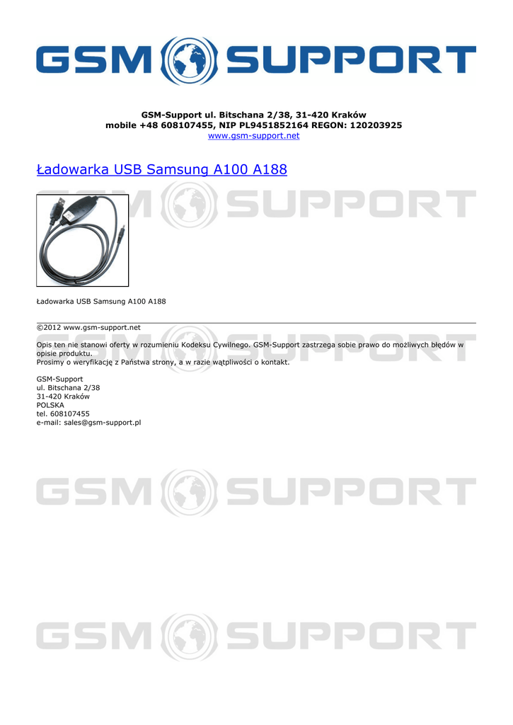 GSM-Support ul. Bitschana 2/38, 31-420 Kraków mobile +48 608107455, NIP PL9451852164 REGON: 120203925 www.gsm-support.net Ładowarka USB Samsung A100 A188 Ładowarka USB Samsung A100 A188 ©2012 www.gsm-support.net Opis ten nie stanowi oferty w rozumieniu Kodeksu Cywilnego. GSM-Support zastrzega sobie prawo do możliwych błędów w opisie produktu. Prosimy o weryfikację z Państwa strony, a w razie wątpliwości o kontakt. GSM-Support ul. Bitschana 2/38 31-420 Kraków POLSKA tel. 608107455 e-mail: [email protected] Powered by TCPDF (www.tcpdf.org)