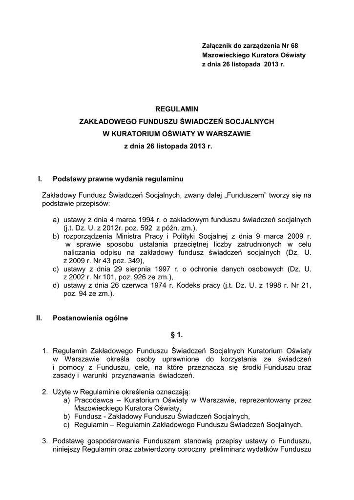 Załącznik do zarządzenia Nr 68 Mazowieckiego Kuratora Oświaty z dnia 26 listopada 2013 r. REGULAMIN ZAKŁADOWEGO FUNDUSZU ŚWIADCZEŃ SOCJALNYCH W KURATORIUM OŚWIATY W WARSZAWIE z dnia 26 listopada 2013 r. I. Podstawy prawne wydania regulaminu Zakładowy Fundusz Świadczeń Socjalnych, zwany dalej „Funduszem” tworzy się na podstawie przepisów: a) ustawy z dnia 4 marca 1994 r. o zakładowym funduszu świadczeń socjalnych (j.t. Dz. U. z 2012r. poz. 592 z późn. zm.), b) rozporządzenia Ministra Pracy i Polityki Socjalnej z dnia 9 marca 2009 r. w sprawie sposobu ustalania przeciętnej liczby zatrudnionych w celu naliczania odpisu na zakładowy fundusz świadczeń socjalnych (Dz. U. z 2009 r. Nr 43 poz. 349), c) ustawy z dnia 29 sierpnia 1997 r. o ochronie danych osobowych (Dz. U. z 2002 r. Nr 101, poz. 926 ze zm.), d) ustawy z dnia 26 czerwca 1974 r. Kodeks pracy (j.t. Dz. U. z 1998 r. Nr 21, poz. 94 ze zm.). II. Postanowienia ogólne § 1. 1. Regulamin Zakładowego Funduszu Świadczeń Socjalnych Kuratorium Oświaty w Warszawie określa osoby uprawnione do korzystania ze świadczeń i pomocy z Funduszu, cele, na które przeznacza się środki Funduszu oraz zasady i warunki przyznawania świadczeń. 2. Użyte w Regulaminie określenia oznaczają: a) Pracodawca – Kuratorium Oświaty w Warszawie, reprezentowany przez Mazowieckiego Kuratora Oświaty, b) Fundusz - Zakładowy Funduszu Świadczeń Socjalnych, c) Regulamin – Regulamin Zakładowego Funduszu Świadczeń Socjalnych. 3. Podstawę gospodarowania Funduszem stanowią przepisy ustawy o Funduszu, niniejszy Regulamin oraz zatwierdzony coroczny preliminarz wydatków Funduszu 2 (plan rzeczowo – finansowy). Preliminarz wydatków podlega uzgodnieniu między Pracodawcą a przedstawicielami pracowników – Komisją Socjalną. Zatwierdzany jest corocznie do dnia 1 lutego danego roku kalendarzowego. 4. Środkami Funduszu administruje Mazowiecki Kurator Oświaty, zwany dalej „Kuratorem” lub osoba upoważniona przez Kuratora. 5. Środki Funduszu na poszczególne rodzaje działalności socjalnej mogą być przesuwane w razie zaistnienia określonych potrzeb na inne rodzaje działalności socjalnej. § 2. 1. Decyzje dotyczące sposobu podziału środków Funduszu oraz przyznawania świadczeń socjalnych poszczególnym osobom podejmuje Kurator w uzgodnieniu z Komisją Socjalną. 2. Wstępnej oceny wniosków o przyznanie świadczeń socjalnych dokonuje Komisja Socjalna, w skład której wchodzą: a) jako przedstawiciel pracodawcy: Główny Księgowy (lub wskazana przez niego osoba), b) po jednym przedstawicielu z każdej delegatury, c) 6 przedstawicieli Kuratorium Oświaty w Warszawie. 3. Komisja Socjalna opiniuje wnioski i przedstawia do zatwierdzenia przez Kuratora lub innej wskazanej przez niego osobie. Decyzja Kuratora jest ostateczna. III. Tworzenie Funduszu § 3. 1. Fundusz tworzy się z corocznego odpisu podstawowego, naliczonego w stosunku do przeciętnej liczby zatrudnionych pracowników, który jest przeznaczony na sfinansowanie świadczeń socjalnych dla pracowników i innych osób uprawnionych. 2. Podstawę ustalania kwot wskaźników odpisu na Fundusz, zgodnie z art. 5 ust. 2 ustawy o Funduszu, stanowi 37,5% przeciętnego wynagrodzenia miesięcznego w gospodarce narodowej w roku poprzednim lub w drugim półroczu roku poprzedniego, jeżeli przeciętne wynagrodzenie z tego okresu stanowiło kwotę wyższą. 3. Środki Funduszu zwiększa się o: a) odpis na Fundusz w wysokości 6,25 % przeciętnego wynagrodzenia w gospodarce narodowej, o którym mowa w art. 5 ust. 2 ustawy o Funduszu – na każdą zatrudnioną osobę, w stosunku do której orzeczono znaczny lub 3 b) c) d) e) umiarkowany stopień niepełnosprawności oraz na każdego emeryta i rencistę, byłego pracownika Kuratorium, darowizny oraz zapisy osób fizycznych oraz prawnych, odsetki z oprocentowania pożyczek udzielonych na cele mieszkaniowe, odsetki od środków Funduszu, inne środki określone w odrębnych przepisach. 4. Środki niewykorzystane w danym roku kalendarzowym przechodzą na rok następny. 5. Środki Funduszu gromadzone są na odrębnym rachunku bankowym. 6. Środki Funduszu na poszczególne formy pomocy socjalnej mogą być przyznawane w formie finansowej lub rzeczowej. IV. Osoby uprawnione do korzystania z Funduszu. § 4. 1. Ze świadczeń Funduszu mają prawo korzystać: a) pracownicy zatrudnieni na podstawie umowy o pracę w Kuratorium niezależnie od rodzaju umowy o pracę i od wymiaru czasu pracy, b) pracownicy przebywający na urlopach wychowawczych, c) emeryci i renciści, którzy rozwiązali z Kuratorium umowę o pracę w związku z przejściem na emeryturę lub rentę, d) członkowie rodzin osób wymienionych w pkt a – c, e) dzieci po zmarłym pracowniku, uprawnione do renty rodzinnej, do ukończenia 18 roku życia lub w przypadku kontynuowania nauki – do ukończenia 26 życia. 2. Za członków rodzin, o których mowa w ust.1 pkt d uważa się: a) pozostające na utrzymaniu i wychowaniu pracownika, emeryta lub rencisty dzieci własne, przysposobione oraz przyjęte na wychowanie w ramach rodziny zastępczej, dzieci współmałżonków, kontynuujące naukę - nie dłużej niż do ukończenia 26 – tego roku życia, b) osoby wymienione w pkt a będące inwalidami I i II grupy bez względu na wiek, jeżeli orzeczono w stosunku do nich znaczny lub umiarkowany stopień niepełnosprawności. V. Przeznaczenie Funduszu § 5. Środki Funduszu przeznacza się na sfinansowanie: 1. Wypoczynku w formie: 4 a) dofinansowania wczasów, wczasów leczniczych, wczasów profilaktyczno – leczniczych (wg „tabeli dopłat” stanowiącej załącznik Nr 1, b) dofinansowania krajowego i poza granicami kraju zorganizowanego wypoczynku dzieci i młodzieży w formie wczasów, kolonii, zimowisk, obozów, kolonii zdrowotnych, zielonych szkół, c) dofinansowania krajowych i zagranicznych wycieczek turystycznokrajoznawczych organizowanych przez pracodawcę,