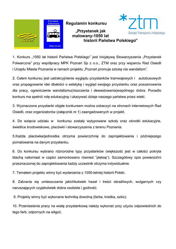 Regulamin konkursu „Przystanek jak malowany-1050 lat historii Państwa Polskiego” 1. Konkurs „1050 lat historii Państwa Polskiego” jest inicjatywą Stowarzyszenia „Przystanek Folwarczna” przy współpracy MPK Poznań Sp z o.o., ZTM oraz przy wsparciu Rad Osiedli i Urzędu Miasta Poznania w ramach projektu „Poznań promuje sztukę nie wandalizm”. 2. Celem konkursu jest uatrakcyjnienie wy wyglądu glądu przystanków tramwajowych i autobusowych oraz propagowanie idei dbałości o estetykę i wygląd sw swojego ojego przystanku przystank oraz poszanowania dla pracy, ograniczenie wandalizmu(niszczenia i dewastowania)wspólnego dobra. Ponadto konkurs ma spełnić rolę edukacyjną i ukazywać dzieje naszego państwa przez wieki. wieki 3. Wyznaczone przystanki objęte konkursem można zobaczyć na stronach internetowych Rad Osiedli, oraz organizatorów (załącznik nr.1 nr.1) zaangażowanych w projekt. 4. Do wzięcia udziału w konkursu zzostały wytypowane szkoły oraz ośrodki edukacyjne, świetlice środowiskowe, placówki i stowarzyszenia z terenu Poznania. 5.Każda placówka/jednostka otrzyma powierzchnię do zaprojektowania i późniejszego pomalowania na danym przystanku. 6. Do konkursu wybrano różnorodne typy przystanków (większość jest w całości pokryta blachą natomiast w części zamontowano również ”pleksę”). Szczegółowy opis powierzchni przeznaczonej do zaprojektowania każdy uczestnik otrzyma indywidualnie. 7. Tematem projektu winny być wyd wydarzenia z 1050-letniej historii Polski. 8. Zabrania się umieszczania jakichkolwiek haseł i treści obraźliwych, wulgarnych czy naruszających czyjekolwiek dobra osobiste i godność. 9. Projekty winny być wykonane techniką dowolną (farba, kredka, szkic). 10. Przeniesienie pracy na wiatę przystankową należy wykonać przy uż użyciu yciu odpowiednich odpo do tego farb, odpornych na wilgoć. 11. Wszelkie koszty związane z zaprojektowaniem i wykonawstwem ponosi uczestnik konkursu. 12. Prace (wizualizacje przystanków) należy przesłać do 10 maja 2016 roku do godz. 12:00 na adres e-mail: [email protected] w temacie wpisując: „1050 lat historii Państwa Polskiego”. 13. Uczestnik może przesłać maksymalnie 3 prace danego przystanku. 14. Nadesłane projekty zostaną zamieszczone na stronach organizatorów, Rad Osiedli uczestniczących w konkursie oraz www.miastopoznaj.pl 15. Na stronie www.miastopoznaj.pl zorganizowane zostanie głosowanie internautów w dniach 12-24 maja 2016 do godz.24.00 w którym wybrane zostaną zwycięskie pomysły. 16. Zostaną one zrealizowane (fizycznie umieszczone) na przystankach w dniu 4 czerwca 2016r. 17. Uczestnicy konkursu mogą umieścić na wiacie swoje logo, numer placówki lub nazwę patrona (po wewnętrznej stronie wiaty po prawej lub lewej stronie ,nie większe niż 1/5 powierzchni tej części). 18. Dla laureatów konkursu przewidziano upominki. 19. Wzięcie udziału w konkursie jest jednoznaczne z wyrażeniem zgody na nieodpłatną publikację prac konkursowych oraz imion i nazwisk ich autorów oraz przeniesienie praw autorskich na Urząd Miasta Poznania. 20. Patronat medialny:
