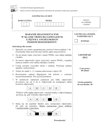 Centralna Komisja Egzaminacyjna Ukáad graficzny © CKE 2011 Arkusz zawiera informacje prawnie chronione do momentu rozpoczĊcia egzaminu. UZUPEàNIA UCZEē KOD UCZNIA miejsce na naklejkĊ z kodem PESEL UZUPEàNIA ZESPÓà NADZORUJĄCY BADANIE DIAGNOSTYCZNE W KLASIE TRZECIEJ GIMNAZJUM Z JĉZYKA ANGIELSKIEGO POZIOM ROZSZERZONY dysleksja Instrukcja dla ucznia 1. SprawdĨ, czy zestaw egzaminacyjny zawiera 9 stron (zadania 1–8). Ewentualny brak stron lub inne usterki zgáoĞ nauczycielowi. 2. Na tej stronie wpisz swój kod i numer PESEL oraz naklej naklejkĊ z kodem. LISTOPAD 2012 3. Na karcie odpowiedzi wpisz swój kod i numer PESEL, wypeánij matrycĊ znaków oraz naklej naklejkĊ z kodem. 4. Czytaj uwaĪnie wszystkie teksty i zadania. Wykonuj zadania zgodnie z poleceniami. 5. Teksty do zadaĔ 1. i 2. zostaną odtworzone z páyty CD. 6. Rozwiązania zapisuj dáugopisem lub piórem tuszem/atramentem. Nie uĪywaj korektora. z Czas pracy: 60 minut czarnym 7. W niektórych zadaniach podanych jest kilka odpowiedzi do wyboru, np. od A do E. Odpowiada im nastĊpujący ukáad na karcie odpowiedzi: Wybierz tylko jedną odpowiedĨ i zamaluj kratkĊ z odpowiadającą jej literą, np. gdy wybraáeĞ odpowiedĨ D: 8. Staraj siĊ nie popeániü báĊdów przy zaznaczaniu odpowiedzi, ale jeĞli siĊ pomylisz, báĊdne zaznaczenie otocz kóákiem i zamaluj kratkĊ z inną literą. Powodzenia! Liczba punktów do uzyskania: 40 Zadanie 1. (0–6) Usłyszysz dwukrotnie dwa teksty. Na podstawie informacji zawartych w nagraniu w zadaniach 1.1.–1.6. z podanych odpowiedzi wybierz właściwą. Zakreśl literę A, B albo C. Zadania 1.1.–1.3. odnoszą się do pierwszego tekstu, a zadania 1.4.–1.6. do drugiego. Tekst 1. Usłyszysz rozmowę dwóch osób. 1.1. The girl has to do her homework for А. Tuesday. В. Wednesday. С. Thursday. 1.2. The girl finally decides to А. ask her mother for help. В. go to the cinema. С. read another book. 1.3. The conversation takes place А. in a library. В. in a bookshop. С. at home. Tekst 2. Usłyszysz wypowiedź nastolatki. 1.4. The girl worked in a restaurant which А. opens only after lunchtime hours. В. belonged to her mother’s friend. С. is a well-known eating place. 1.5. She didn’t like А. working at night. В. wearing a uniform. С. serving Mr Potter. 1.6. This text is about А. what a waitress’s job is like. В. how to serve rude customers. С. why people lose summer jobs. Strona 2 z 9 Zadanie 2. (0–4) Usáyszysz dwukrotnie cztery wypowiedzi na temat relacji pomiĊdzy nastolatkami i ich rodzicami. Na podstawie informacji zawartych w nagraniu dopasuj do kaĪdej wypowiedzi (2.1.–2.4.) odpowiadające jej zdanie (A–E). Wpisz rozwiązania do tabeli. Uwaga! Jedno zdanie zostaáo podane dodatkowo i nie pasuje do Īadnej wypowiedzi. My parents A. are very strict about my grades. B. don’t let me study until midnight. C. tell me to do too much housework. D. aren’t glad because my room is messy. E. want to know about the phone calls I get. 2.1. 2.2. 2.3. 2.4. PRZENIEĝ ROZWIĄZANIA ZADAē 1. ORAZ 2. NA KARTĉ ODPOWIEDZI! Strona 3 z 9 Zadanie 3. (0–3) Przeczytaj tekst. Do kaĪdego akapitu (3.1.–3.3.) dopasuj wáaĞciwy nagáówek (A–D). Wpisz odpowiednią literĊ obok numeru kaĪdego akapitu. Uwaga! Jeden nagáówek zostaá podany dodatkowo i nie pasuje do Īadnego akapitu. A. Take your time B. Shop out of season C. Online shops are better D. Only bring the cash you need HOW TO SHOP WISELY 3.1. ____ Before you go out, put a small amount of money in your wallet – just enough to pay for the shopping you have planned. You can’t spend money you don’t have. When your wallet is empty, your shopping is over. 3.2. ____ If you’ve heard of a new product that you would really like to have, first visit a few shops to look for the lowest price. Perhaps check online, too. Comparing prices may take you a few hours, but don’t hurry. It will leave you with some extra cash in your wallet. 3.3. ____ Remember that if you need a new swimsuit or sandals for next summer, you should start shopping for them in October or November. The rule is that prices of light summer clothes are lower in autumn or winter, while warm coats and thick sweaters are much cheaper during the summer months. PRZENIEĝ ROZWIĄZANIA NA KARTĉ ODPOWIEDZI! Strona 4 z 9 Zadanie 4. (0–4) Przeczytaj tekst, z którego usuniĊto cztery zdania. Wpisz w luki 4.1.–4.4. litery, którymi oznaczono brakujące zdania (A–E), tak aby otrzymaü logiczny i spójny tekst. Uwaga! Jedno zdanie zostaáo podane dodatkowo i nie pasuje do Īadnej luki. THE LIBRARY CAT The first thing the workers of the Belmore Local Library noticed when they entered the building on 12th January 2008 was a grey kitten sitting under a desk. 4.1. ____ The workers wondered how the cat got into the library and they agreed that it had jumped through a small metal door in the wall. 4.2. ____ It usually happened at the weekend and on Monday there was a pile of books lying on the floor. The friendly kitten kept people company while they chose books or used library computers. The library workers loved it, too. But there was one problem – they didn’t know what to call it. 4.3. ____ Dewey Readmore Books was the winning name! Dewey began attracting families and school groups to the library. Soon, the local newspaper published an article about the library cat. 4.4. ____ It even started getting letters from people all over the world! A. So, the library organised a competition to name their favourite. B. People used it to return books when the library was closed. C. As a result, the cat became famous across the country. D. But the library workers didn’t like the cat’s name. E. It was thin and dirty but wasn’t afraid of people. PRZENIEĝ ROZWIĄZANIA NA KARTĉ ODPOWIEDZI! Strona 5 z 9 Zadanie 5. (0–3) Przeczytaj informacje o trzech osobach (5.1.–5.3.) oraz recenzje czterech filmów (A–D). Dopasuj do kaĪdej osoby film, któr