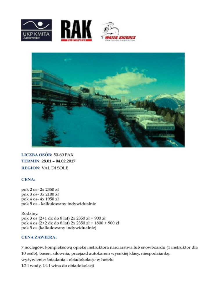 LICZBA OSÓB: 50-60 PAX TERMIN: 28.01 – 04.02.2017 REGION: VAL DI SOLE CENA: pok 2 os- 2x 2350 zł pok 3 os- 3x 2100 zł pok 4 os- 4x 1950 zł pok 5 os - kalkulowany indywidualnie Rodziny. pok 3 os (2+1 dz do 8 lat) 2x 2350 zł + 900 zł pok 4 os (2+2 dz do 8 lat) 2x 2350 zł + 1800 + 900 zł pok 5 os (kalkulowany indywidualnie) CENA ZAWIERA: 7 noclegów, kompleksową opiekę instruktora narciarstwa lub snowboardu (1 instruktor dla 10 osób), basen, siłownia, przejazd autokarem wysokiej klasy, niespodziankę. wyżywienie: śniadania i obiadokolacje w hotelu 1⁄2 l wody, 1⁄4 l wina do obiadokolacji ubezpieczenie KL 20 000 EURO, NNW 2 000 EURO, BAGAZ 200 EURO, KR (PODLIMIT KL) 5 000 EURO (KOSZTY RATOWNICTWA) CENA NIE ZAWIERA: dodatkowych napoi do obiadokolacji opcjonalnego ubezpieczenie OC SKI w wys. 40 zł/os. taksy klimatycznej płatnej na miejscu 1,3 euro/osoba/dzień. dopłaty do pokoju 1 os. SKIPASS: 6 dniowy SKI PASS FOLGARIDA MARILLEVA 204 euro/os dorosła, junior 143 euro/os POŁOŻENIE: hotel jest częścią kompleksu "Club Hotel Solaria" http://www.hotelclubsolaria.it usytuowany w jednym z najbardziej imponujących ośrodków górskich MARILLEVA 1400, w regionie VAL DI SOLE. Wokół roztacza się widok na łańcuch górski Dolomitów. Ze stacji stacji narciarskiej Marilleva 1400 można łatwo przemieszczać się na inne wyciągi w Folgaridzie i Madonnie di Campiglio. SERWIS: winda, 2 bary, 2 restauracje, szeroki hall, disco, basen, siłownia, animacje, mini-klub dla dzieci od 4-13 lat, rozległy taras, strefa z internetem bezprzewodowym, przechowalnia sprzętu narciarskiego, kryty parking, wewnątrz kompleksu znajduje się supermarket, sklepy, wypożyczalnia sprzętu narciarskiego, sala gier, pralnia, fotograf, salon piękności. POKOJE: standardowo wyposażone pokoje 1, 2, 3, 4 os. z pełnym węzłem sanitarnym (łazienka z prysznicem). Pokoje wyposażone w telefon, TV LCD. W pokojach 4 os mogą być łóżka piętrowe. WYŻYWIENIE: śniadania i obiadokolacje w formie bufetu REZERWACJA: Artur Czerwiec tel. 509536643, email [email protected] Termin rezerwacji 5.11.2016r