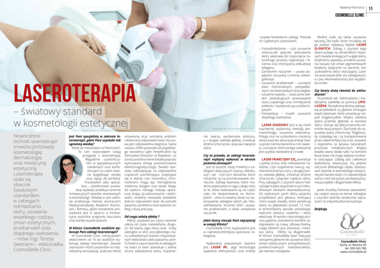 Materiał Partnera CosmoBelle Clinic i prawie bezbolesne zabiegi. Posiada on 5 głównych zastosowań: – Fotoodmładzanie – czyli usuwanie zmarszczek poprzez pobudzenie skóry właściwej do rozpoczęcia naturalnego procesu regeneracji i leczenia oraz intensywną odbudowę kolagenu. – Zamykanie naczynek – usuwa popękane naczynka, rumienie, teleangiektazje. – Usuwanie przebarwień – usunięcie plam hormonalnych, potrądzikowych, soczewicowatych oraz piegów. – Leczenie trądziku – zwalczanie bakterii powodujących powstawanie stanu zapalnego oraz zmniejszenie wielkości i wydajności gruczołów łojowych. – Fotoepilacja – trwałe usuwanie zbędnego owłosienia. Laseroterapia – światowy standard w kosmetologii estetycznej Nowoczesne techniki laseroterapii zrewolucjonizowały kosmetologię, dermatologię oraz medycynę estetyczną. Laseroterapia stała się obecnie światowym standardem w zabiegach odmładzania skóry, usuwania wszelkiego rodzaju zmian estetycznych, przebarwień oraz zbędnego owłosienia – mówi mgr Teresa Seemann – właścicielka CosmoBelle Clinic. Jest Pani specjalistą w zakresie laseroterapii, gdzie Pani uzyskała tak ogromną wiedzę? Wiele lat mieszkałam w Niemczech. To tam rozpoczęłam swoją przygodę z laseroterapią. Regularnie uczestniczyłam w specjalistycznych szkoleniach oraz konferencjach na całym świecie pogłębiając wiedzę oraz dążąc do perfekcji. Pracowałam jako specjalista – szkoleniowiec prowadząc wykłady i prelekcje na temat innowacyjnych laserów stosowanych w kosmetologii. Wiedzę w tym zakresie przekazuję również słuchaczom Międzynarodowej Akademii Kosmetyki i Biznesu, gdzie kształcenie prowadzone jest w oparciu o innowacyjne autorskie programy nauczania oraz bardzo wysoki poziom. W klinice CosmoBelle osobiście wykonuje Pani zabiegi laseroterapii? W Cosmobelle Clinic, której jestem właścicielem od 16 lat osobiście wykonuję zabiegi laseroterapii. Zawsze zapraszam moich pacjentów na indywidualną konsultację, podczas której omawiamy oraz oceniamy problem i dobieramy odpowiedni laser. Kluczowa jest odpowiednia diagnoza. Sama nazwa LASER powstała od angielskiego wyrażenia Light Amplification by Stimualted Emission of Radiation, co oznacza wzmocnienie światła poprzez wymuszoną emisję promieniowania elektromagnetycznego. Światło laserowe oddziaływuje na odpowiednie cząsteczki pochłaniające, znajdujące się w skórze, tzw. hromofory. Chromoforami mogą być hemoglobina, melanina, kolagen oraz woda. Mając do wyboru różnego rodzaju aparaturę, znając jej zastosowanie i właściwości, możemy niezwykle dokładnie dobrać odpowiedni laser do potrzeb pacjenta i problemu oraz wykonać zabieg z dużą precyzją. Od czego zależą efekty ? Efekty uzyskane po użyciu laserów zależą od czasu naświetlania, długości fali lasera, jego mocy oraz liczby zabiegów w serii, początkowego stanu naświetlanych tkanek i indywidualnych właściwości skóry pacjenta. Jeżeli chodzi o użycie laserów w zabiegach na twarz to laser powoduje z jednej strony odświeżenie skóry, rozjaśnie- fotografie: archiwum CosmoBelle Clinic nie twarzy, wyrównanie kolorytu, a z drugiej zadziała głębiej, zniweluje drobne zmarszczki i poprawi napięcie skóry. Czy to prawda, że zabiegi laseroterapii najlepiej wykonać w okresie jesienno-zimowym? Jest to słuszne, kiedy mówimy o zabiegach dotyczących twarzy, dekoltu, szyi i rąk - czyli tych obszarów, które narażone są na promieniowanie słoneczne. Zabiegi laserowe, które możemy wykonywać w ciągu całego roku to te, które realizowane są na części ciała nie eksponowanej na słońce. Jesień – zima to świetny okres na wykonywanie zabiegów takich, jak: fotoodmładzanie, leczenie blizn, usuwanie przebarwień, a także zamykania naczynek. Jakie lasery stosuje Pani najczęściej w swojej Klinice? Cosmobelle Clinic wyposażona jest w najnowocześniejszą aparaturę zabiegową. Najbardziej popularnym laserem jest LASER IPL. Jego technologia zapewnia efektywność oraz krótkie LASER DIODOWY jest w tej chwili najchętniej wybieraną metodą permanentnego usuwania owłosienia. Polega ona na uszkodzeniu macierzy włosa poprzez absorpcję energii lasera przez ciemny barwnik w nim zawarty. Usunięcie niechcianego owłosienia jest szybkie, bezbolesne i trwałe. LASER FRAKCYJNY CO2 powoduje z jednej strony silne odświeżenie naskórka, czyli rozjaśnienie twarzy, wyrównanie kolorytu cery, z drugiej strony zadziała głębiej, zniweluje drobne zmarszczki i poprawi napięcie skóry. Przy zabiegach z użyciem lasera frakcyjnego trzeba się jednak liczyć z kilkudniowym okresem rekonwalescencji. Do wybranych partii skóry pacjenta przykładana jest głowica emitująca mikro-wiązki światła, które penetrują skórę na głębokości ponad 1,5 mm, w kontrolowany sposób uszkadzając wybrane obszary naskórka i skóry właściwej. W wyniku naturalnego procesu gojenia uszkodzone komórki zastępowane są nową, zdrową tkanką, czego efektem jest zdrowsza i młodsza skóra. Efekty są długotrwałe. W Klinice CosmoBelle laser frakcyjny stosujemy głównie do usuwania blizn, zmian estetycznych, potrądzikowych, powierzchownych niedoskonałości, jak również rozstępów. Modne stało się także usuwanie tatuaży. Dla osób, które chciałyby się go pozbyć najlepszy będzie LASER Q-SWITCH. Zabieg z użyciem tego lasera polega na ultrakrótkich impulsach światła wnikających w głąb skóry, dzięki temu zjawisku, w trakcie usuwania tatuaży lub zmian pigmentowych działamy wyłącznie na barwnik, bez uszkodzenia skóry otaczającej. Laser nie pozostawia blizn po zabiegowych, a czas rekonwalescencji jest wyjątkowo krótki. Czy lasery służą również do odchudzania? Oczywiście tak. Odchudzamy i modelujemy sylwetkę za pomocą LIPOLASERA. Na wybraną okolicę zabiegową przykładane są głowice emitujące wiązki laserowe, które prowokują rozpad tr