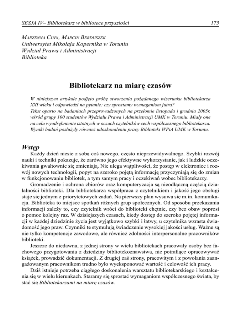 SESJA IV– Bibliotekarz w bibliotece przyszłości 175 Marzenna Cupa, Marcin Berduszek Uniwersytet Mikołaja Kopernika w Toruniu Wydział Prawa i Administracji Biblioteka Bibliotekarz na miarę czasów W niniejszym artykule podjęto próbę stworzenia pożądanego wizerunku bibliotekarza XXI wieku i odpowiedzi na pytanie: czy sprostamy wymaganiom jutra? Tekst oparto na badaniach przeprowadzonych na przełomie listopada i grudnia 2005r. wśród grupy 100 studentów Wydziału Prawa i Administracji UMK w Toruniu. Miały one na celu wyodrębnienie istotnych w oczach czytelników cech współczesnego bibliotekarza. Wyniki badań posłużyły również udoskonaleniu pracy Biblioteki WPiA UMK w Toruniu. Wstęp Każdy dzień niesie z sobą coś nowego, często nieprzewidywalnego. Szybki rozwój nauki i techniki pokazuje, że zarówno jego efektywne wykorzystanie, jak i ludzkie oczekiwania gwałtownie się zmieniają. Nie ulega wątpliwości, że postęp w elektronice i rozwój nowych technologii, popyt na szeroko pojętą informację przyczyniają się do zmian w funkcjonowaniu bibliotek, a tym samym pracy i oczekiwań wobec bibliotekarzy. Gromadzenie i ochrona zbiorów oraz komputeryzacja są nieodłączną częścią działalności biblioteki. Dla bibliotekarza współpraca z czytelnikiem i jakość jego obsługi staje się jednym z priorytetowych zadań. Na pierwszy plan wysuwa się m.in. komunikacja. Biblioteka to miejsce spotkań różnych grup społecznych. Od sposobu przekazania informacji zależy to, czy czytelnik wróci do biblioteki chętnie, czy bez obaw poprosi o pomoc kolejny raz. W dzisiejszych czasach, kiedy dostęp do szeroko pojętej informacji w każdej dziedzinie życia jest wyjątkowo szybki i łatwy, u czytelnika wzrasta świadomość jego praw. Czynniki te stymulują świadczenie wysokiej jakości usług. Ważne są nie tylko kompetencje zawodowe, ale również zdolności interpersonalne pracowników biblioteki. Jeszcze do niedawna, z jednej strony w wielu bibliotekach pracowały osoby bez fachowego przygotowania z dziedziny bibliotekoznawstwa, nie potrafiące opracowywać książek, prowadzić dokumentacji. Z drugiej zaś strony, pracowitym i z powołania zaangażowanym pracownikom trudno było wyeksponować wartość i celowość ich pracy. Dziś istnieje potrzeba ciągłego doskonalenia warsztatu bibliotekarskiego i kształcenia się w wielu kierunkach. Staramy się sprostać wymaganiom współczesnego świata, by stać się Bibliotekarzami na miarę czasów. 176 Biblioteki XXI wieku. Czy przetrwamy? Rola i cechy bibliotekarza XXI wieku- w opinii czytelników Biblioteki WPiA UMK w Toruniu Na dzisiejszego bibliotekarza nakładane są obowiązki często wykraczające poza działalność bibliotekarską. Powinien on posiadać kwalifikacje nie tylko z zakresu bibliotekoznawstwa, ale i technologii informacyjnych i komunikacyjnych, marketingu i zarządzania, pedagogiki i metodyki. By zbudować nowy wizerunek bibliotekarza przełamując stereotypy, w bibliotekach należałoby zatrudniać osoby z odpowiednimi kwalifikacjami i predyspozycjami, chcące sukcesywnie poszerzać wiedzę i praktyczne umiejętności. Jednak czy rzeczywiście potrzeba wielkich zmian, by stać się bibliotekarzem na miarę czasów? Autorzy referatu postanowili sprawdzić, jaka jest rola współczesnego pracownika biblioteki i jakimi cechami powinien się on odznaczać, by sprostać zadaniom dzisiejszego i nadchodzącego dnia. W dniach 18 listopada 2005 r. – 4 grudnia 2005 r. wśród 100 studentów Wydziału Prawa i Administracji przeprowadzono ankietę, której tematem przewodnim była Rola bibliotekarza. Przed rozdaniem arkuszy z 6 pytaniami: 1.Płeć ankietowanych 2.Czy korzysta Pan/Pani z pomocy bibliotekarza? 3.W jakiej sytuacji prosi Pan/Pani o pomoc bibliotekarza? 4.Jakie cechy powinien posiadać „idealny bibliotekarz”? 5.Jaką rolę spełnia współczesny bibliotekarz? 6.Jaką rolę powinien spełniać bibliotekarz „na miarę czasów”? Wśród studentów prawa i administracji UMK przeprowadzono sondę, na podstawie której wyłoniono najczęściej pojawiające się odpowiedzi. Rys. 1. W ankiecie wzięło udział 66 kobiet, co stanowi 66% ogółu ankietowanych i 34 mężczyzn (34%) Odpowiedzi na pytanie o korzystanie z pomocy bibliotekarza wykazały, że ok. 80% użytkowników BWPiA prosi o pomoc pracowników biblioteki. Wyniki wyglądały następująco: Rys. 2. Na pytanie „Czy korzysta Pan/Pani z pomocy bibliotekarza?” ankietowani odpowiedzieli TAK 78% (A), NIE 22% (B) SESJA IV– Bibliotekarz w bibliotece przyszłości 177 Wydaje się być dobrą wróżbą fakt, że przeważająca większość naszych czytelników nie stroni od poszukiwania pomocy u bibliotekarzy. Prosząc o pomoc, liczą na fachową odpowiedź. Idąc dalej, zauważamy, że najczęściej użytkownicy oczekują pomocy we wskazaniu miejsca, w którym poszukiwana książka się znajduje, udzielamy informacji o jej dostępności w naszym księgozbiorze jak również w zbiorach innych ośrodków, doradzamy lekturę. Ta rola wpisana jest w zawód bibliotekarza. Gdy sięgamy pamięcią do czasów naszego dzieciństwa i pierwszych wizyt w bibliotece, zawsze oczekiwaliśmy pomocy i rady. Dziś, mając do dyspozycji zdobycze najnowszej techniki - komputery, drukarki, praca staje się łatwiejsza, ciekawsza i bardziej efektywna. Użytkownik otrzymuje od nas pełną informację. Rys. 3. „W jakiej sytuacji prosi Pan/Pani o pomoc bibliotekarza?” - odpowiedzi, jakich udzielili ankietowani można było sklasyfikować następująco: 62% (A) problem ze znalezieniem książki, 6% (B) pytanie o dostępność książki, 14% (C) brak czasu, 18% (D) prośba o doradzenie lektury Ale czy tylko nasza rola ogranicza się do udzielania pomocy? Czy tylko tym zajmuje się bibliotekarz XXI wieku? Otóż okazuje się, że niezmiernie ważnym dla czytelnika jest to, że bibliotekarze stoją na straży ciszy i porządku. Wśród priorytetowych z