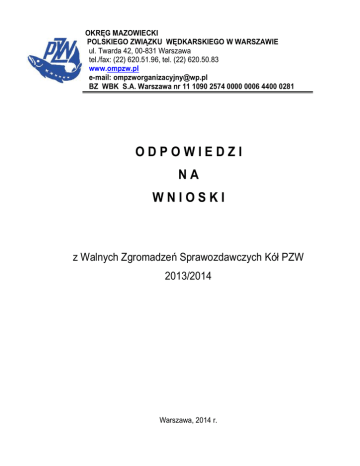 OKRĘG MAZOWIECKI POLSKIEGO ZWIĄZKU WĘDKARSKIEGO W WARSZAWIE ul. Twarda 42, 00-831 Warszawa tel./fax: (22) 620.51.96, tel. (22) 620.50.83 www.ompzw.pl e-mail: [email protected] BZ WBK S.A. Warszawa nr 11 1090 2574 0000 0006 4400 0281 ODPOWIEDZI NA WNIOSKI z Walnych Zgromadzeń Sprawozdawczych Kół PZW 2013/2014 Warszawa, 2014 r. -2- -3- Wnioski pod adresem Zarządu Okręgu Zagadnienia organizacyjne 1. Dlaczego Z.O. nie jest zainteresowany działalnością i dofinansowaniem w ośrodku Góra. Ośrodek będzie atrakcyjnym łowiskiem ale na odbudowę którego potrzeba parę lat i zarybienia. (k-1) Zarząd Okręgu Mazowieckiego wspierał finansowo badania jeziora Góra. Nie ma jednak możliwości dofinansowania działalności gospodarczej prowadzonej w schronisku. 2. Wnioskujemy o przekazanie aktualnego regulaminu na podstawie, którego dokonano oceny Kół za działalność młodzieżową oraz udostępnienie wyników oceny Kół za działalność młodzieżową w roku 2013, przeprowadzonej przez Komisje Młodzieżową Okręgu. (k-2) Zarząd Okręgu zobowiąże Komisję Młodzieżową do umieszczenia na stronie internetowej w/w regulaminu oraz oceny kół za działalność młodzieżową. 3. Wnioskujemy o umieszczenie na stronie internetowej Okręgu uchwał Prezydium Okręgu. (k-2, k-32) Uchwały podejmowane przez Prezydium ZO są publikowane na stronie internetowej po zatwierdzaniu przez Zarząd Okręgu. 4. Zwracamy się do koordynatora Kół Okręgu Mazowieckiego PZW o pilną interwencję dotyczącą nieprzestrzegania Uchwały Nr 17/Z.O./2013 z 4 listopada 2013 r. Nasza prośba o interwencję dotyczy sprzedaży zezwoleń wędkarskich w sklepie GARBUS ul. Wincentego 25 przez koło Nr 1 Warszawa Śródmieście co stanowi naruszenie uchwały Okręgu Mazowieckiego PZW. Osoby opłacające zezwolenia w tym sklepie są automatycznie przepisywanie do koła nr 1. (k-5) Zarząd Okręgu zweryfikuje uchwałę nr 17/ZO/2013 i określi rejon działania kół. 5. Walne Zgromadzenie Koła wnioskuje o zajęcie oficjalnego stanowiska Z.O. Maz. i uznanie dzielnicy Targówek jako terenu działalności Koła nr 5 Warszawa Praga Północ. Dzielnica Targówek nie jest „BIAŁĄ PLAMĄ” na mapie działalności Polskiego Związku Wędkarskiego, jest to teren działalności Koła nr 5 od momentu jego założenia i nikt nas nie zwolnił z działalności na tym terenie. Zwracamy się z prośbą o opublikowanie mapy terenu działalności naszego Koła i pozostałych Kół Dzielnicowych w Warszawie na stronie internetowej Okręgu Mazowieckiego PZW. (k-5) Odpowiedź jak w pkt. 4. 6. Wnioskujemy o zniesienie Uchwały Nr 17/Z.O./2013 z dnia 4 listopada 2013 r. w sprawie rozprowadzania znaków członkowskich w jednostkach organizacyjnych Okręgu. (k-13) Odpowiedź jak w pkt. 4. 7. Walne Zgromadzenie Koła wnioskuje o publikowanie na stronie internetowej Okręgu danych preliminarza budżetowego oraz jego wykonania. (k-32) Na stronie internetowej ZO zamieszczony jest bilans za rok 2013 i preliminarz budżetowy na rok 2014. -4- 8. Wykreślić z zezwolenia na amatorski połów ryb wędką błędnego nazewnictwa miejscowości Zegrze (jest zapisane w Zegrzu Północnym); ta nazwa nie obowiązuje już od kilku lat. (k-37) Nazwa miejscowości „Zegrze Północne”, która występuje na str. 20 przy opisie granic obrębu ochronnego „Zegrze”, nie może być zmieniona, ponieważ jest zawarta w uchwale Zarządu Województwa Mazowieckiego. 9. Z czego wynika 16 złotowy wzrost składki okręgowej i czy taki wzrost będzie w latach następnych? (k-38, k-60, k-70) Wzrost składki okręgowej o 16 zł w roku 2014 był podyktowany potrzebą utrzymania i zagospodarowania akwenów, które z początkiem br. Okręg Mazowiecki przejął po połączeniu się z Okręgiem Płocko-Włocławskim. Wysokość składki okręgowej na rok 2015 będzie kalkulowana jesienią br. Na razie nie ma przesłanek, aby w kolejnym roku wzrost składek był równie wysoki. 10. Czy utrzymany będzie dalszy wzrost składek dla najmłodszych wędkarzy (uczestników)? (k-38) Wzrost składki będzie proporcjonalny do składki ogólnej. 11. Zbyt wysoka składka jednodniowa dla niezrzeszonych odstrasza potencjalnych nabywców. (k-38) Składka 1-dniowa dla osób niezrzeszonych zezwala na wędkowanie zarówno w wodach nizinnych, jak i górskich naszego Okręgu. Taka sama lub wyższa kwota składki obowiązuje w okręgach: Krosno, Konin, Lublin, Nowy Sącz, Piła, Rzeszów i Słupsk. Nasza składka nie jest więc wygórowana. 12. Zaznaczyć zakres zezwolenia na połów ryb w formie mapki (do pobrania z Internetu). (k46) Na stronie internetowej ZO zamieszona jest interaktywna mapa wód Okręgu Mazowieckiego. Wykonanie dokładnej mapy wszystkich łowisk jest przedsięwzięciem bardzo trudnym i kosztownym – ze względu na duży areał wód użytkowanych przez nasz Okręg. 13. Po wprowadzeniu podatku śmieciowego powstał problem wywozu zgromadzonych śmieci. Prosimy Okręg o zajęcie stanowiska w tej sprawie. (k-48) Koszty wywozu śmieci z siedziby koła ponosi zarząd koła. W przypadku zwrotu kosztów wywozu śmieci zebranych nad akwenami, zarząd koła powinien wystąpić do urzędu gminy. 14. Rozliczenie ze składek do 10 każdego kwartału. Wpływy finansowe są w kole niewielkie w ciągu miesiąca to, aby zmniejszyć koszty dojazdu do Warszawy skarbnika proponujemy, aby tak małe koło jak nasze, rozliczało się raz na kwartał. (k-49, 55) Przepisy regulujące działalność finansową w Okręgu są obligatoryjne. Zarząd Okręgu nie widzi potrzeby różnicowania pod tym względem mazowieckich kół. 15. Wnioskujemy o utworzenie jednego koła w Przasnyszu. (k-66) Połączenie kół może odbyć się na zgodny wniosek nadzwyczajnych walnych zgromadzeń członków tych kół. 16. Wprowadzić w 2015 r. w zasadach wędkowania w wodach Okręgu Mazowieckiego zapis: „na zalewie w Chorzelach obowiązuje limit dobowy karpia 1 szt. i dodatkowo wymiar ochronny powyżej 