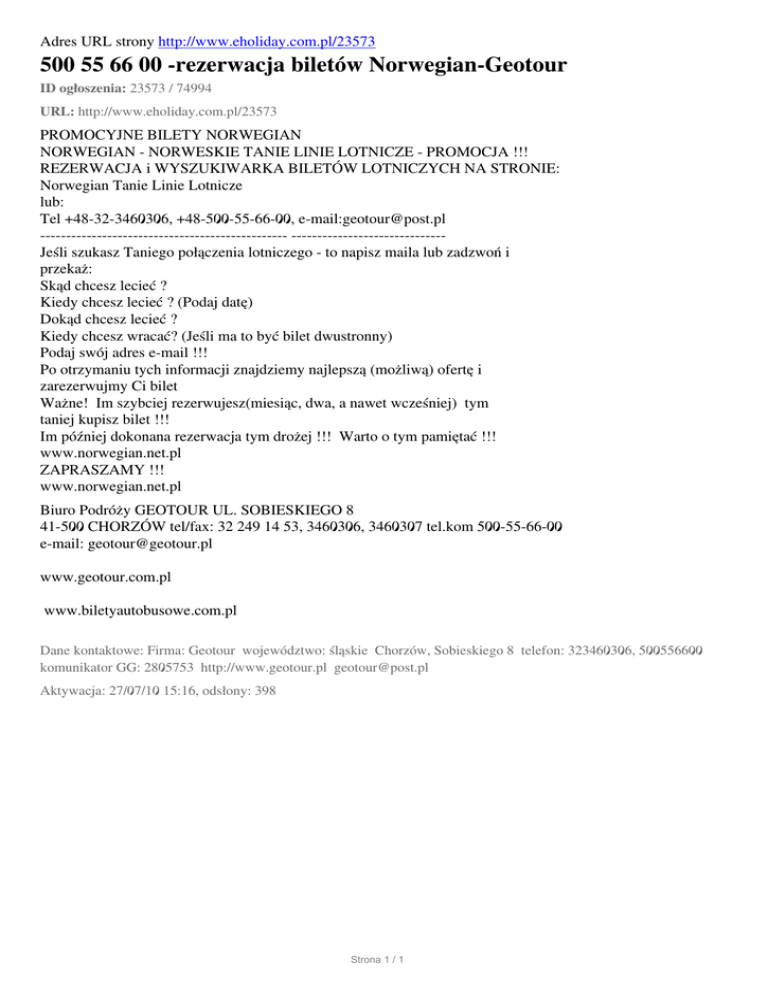 Adres URL strony http://www.eholiday.com.pl/23573 500 55 66 00 -rezerwacja biletów Norwegian-Geotour ID ogłoszenia: 23573 / 74994 URL: http://www.eholiday.com.pl/23573 PROMOCYJNE BILETY NORWEGIAN NORWEGIAN - NORWESKIE TANIE LINIE LOTNICZE - PROMOCJA !!! REZERWACJA i WYSZUKIWARKA BILETÓW LOTNICZYCH NA STRONIE: Norwegian Tanie Linie Lotnicze lub: Tel +48-32-3460306, +48-500-55-66-00, e-mail:[email protected] ------------------------------------------------ -----------------------------Jeśli szukasz Taniego połączenia lotniczego - to napisz maila lub zadzwoń i przekaż: Skąd chcesz lecieć ? Kiedy chcesz lecieć ? (Podaj datę) Dokąd chcesz lecieć ? Kiedy chcesz wracać? (Jeśli ma to być bilet dwustronny) Podaj swój adres e-mail !!! Po otrzymaniu tych informacji znajdziemy najlepszą (możliwą) ofertę i zarezerwujmy Ci bilet Ważne! Im szybciej rezerwujesz(miesiąc, dwa, a nawet wcześniej) tym taniej kupisz bilet !!! Im później dokonana rezerwacja tym drożej !!! Warto o tym pamiętać !!! www.norwegian.net.pl ZAPRASZAMY !!! www.norwegian.net.pl Biuro Podróży GEOTOUR UL. SOBIESKIEGO 8 41-500 CHORZÓW tel/fax: 32 249 14 53, 3460306, 3460307 tel.kom 500-55-66-00 e-mail: [email protected] www.geotour.com.pl www.biletyautobusowe.com.pl Dane kontaktowe: Firma: Geotour województwo: śląskie Chorzów, Sobieskiego 8 telefon: 323460306, 500556600 komunikator GG: 2805753 http://www.geotour.pl [email protected] Aktywacja: 27/07/10 15:16, odsłony: 398 Strona 1 / 1