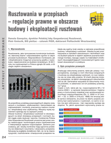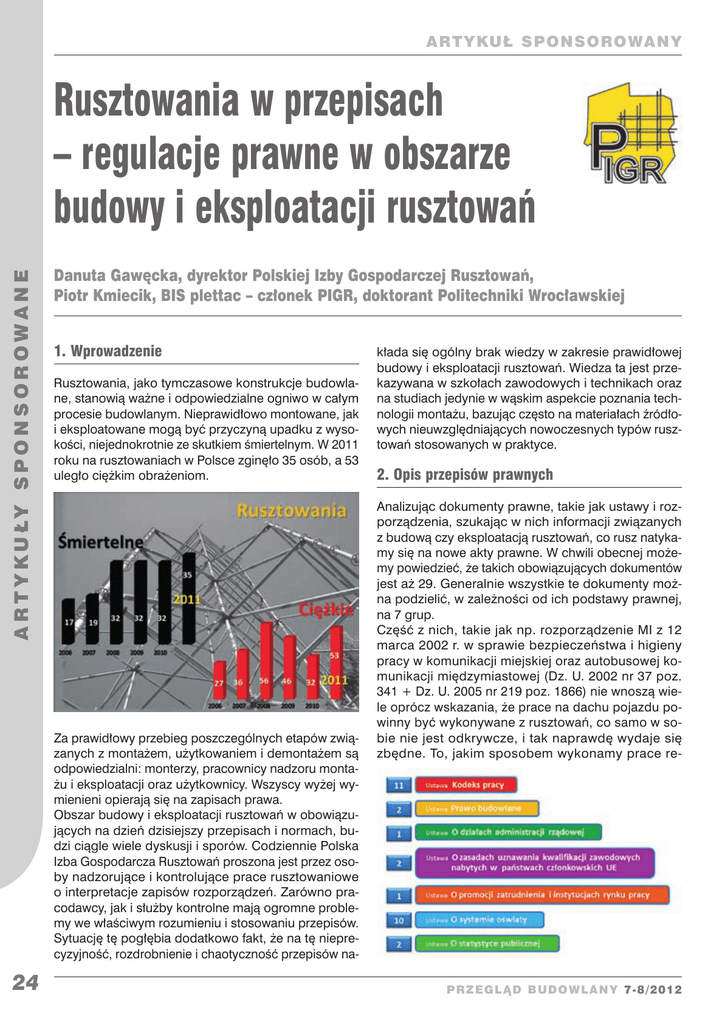 ARTYKUŁ S PON S OROWANY A R T Y K U ŁY S P ON S O R OWANE Rusztowania w przepisach – regulacje prawne w obszarze budowy i eksploatacji rusztowań Danuta Gawęcka, dyrektor Polskiej Izby Gospodarczej Rusztowań, Piotr Kmiecik, BIS plettac – członek PIGR, doktorant Politechniki Wrocławskiej 1. Wprowadzenie Rusztowania, jako tymczasowe konstrukcje budowlane, stanowią ważne i odpowiedzialne ogniwo w całym procesie budowlanym. Nieprawidłowo montowane, jak i eksploatowane mogą być przyczyną upadku z wysokości, niejednokrotnie ze skutkiem śmiertelnym. W 2011 roku na rusztowaniach w Polsce zginęło 35 osób, a 53 uległo ciężkim obrażeniom. Za prawidłowy przebieg poszczególnych etapów związanych z montażem, użytkowaniem i demontażem są odpowiedzialni: monterzy, pracownicy nadzoru montażu i eksploatacji oraz użytkownicy. Wszyscy wyżej wymienieni opierają się na zapisach prawa. Obszar budowy i eksploatacji rusztowań w obowiązujących na dzień dzisiejszy przepisach i normach, budzi ciągle wiele dyskusji i sporów. Codziennie Polska Izba Gospodarcza Rusztowań proszona jest przez osoby nadzorujące i kontrolujące prace rusztowaniowe o interpretacje zapisów rozporządzeń. Zarówno pracodawcy, jak i służby kontrolne mają ogromne problemy we właściwym rozumieniu i stosowaniu przepisów. Sytuację tę pogłębia dodatkowo fakt, że na tę nieprecyzyjność, rozdrobnienie i chaotyczność przepisów na- 24 kłada się ogólny brak wiedzy w zakresie prawidłowej budowy i eksploatacji rusztowań. Wiedza ta jest przekazywana w szkołach zawodowych i technikach oraz na studiach jedynie w wąskim aspekcie poznania technologii montażu, bazując często na materiałach źródłowych nieuwzględniających nowoczesnych typów rusztowań stosowanych w praktyce. 2. Opis przepisów prawnych Analizując dokumenty prawne, takie jak ustawy i rozporządzenia, szukając w nich informacji związanych z budową czy eksploatacją rusztowań, co rusz natykamy się na nowe akty prawne. W chwili obecnej możemy powiedzieć, że takich obowiązujących dokumentów jest aż 29. Generalnie wszystkie te dokumenty można podzielić, w zależności od ich podstawy prawnej, na 7 grup. Część z nich, takie jak np. rozporządzenie MI z 12 marca 2002 r. w sprawie bezpieczeństwa i higieny pracy w komunikacji miejskiej oraz autobusowej komunikacji międzymiastowej (Dz. U. 2002 nr 37 poz. 341 + Dz. U. 2005 nr 219 poz. 1866) nie wnoszą wiele oprócz wskazania, że prace na dachu pojazdu powinny być wykonywane z rusztowań, co samo w sobie nie jest odkrywcze, i tak naprawdę wydaje się zbędne. To, jakim sposobem wykonamy prace re- PRzeg l Ąd bu d owl any 7-8/2012 A R T Y KU Ł S P ONSOROWANY Nazwa aktu prawnego Dziennik ustaw Opis treści 1 ROZPORZĄDZENIE MINISTRA INFRASTRUKTURY z 6 lutego 2003 r. w sprawie bezpieczeństwa i higieny pracy podczas wykonywania robót budowlanych Dz. U. 2003 nr 47 poz. 401 Najważniejsze rozporządzenie dotyczące rusztowań. W rozdziale 8 pt. „Rusztowania i ruchome podesty robocze” zawarto m.in. wymagania prawne w zakresie konstrukcji, bhp i ergonomiczne. 2 ROZPORZĄDZENIE MINISTRA GOSPODARKI, PRACY I POLITYKI SPOŁECZNEJ z 30 września 2003 r. zmieniające rozporządzenie w sprawie minimalnych wymagań dotyczących bezpieczeństwa i higieny pracy w zakresie użytkowania maszyn przez pracowników podczas pracy Dz. U. 2003 nr 178 poz. 1745 Wymagania dotyczące rusztowań wynikające z przepisów UE. W paragrafie 8c zawarto wytyczne wynikające z DYREKTYWY 2001/45/EWG zmieniającej Dyrektywę 89/655/EWG w sprawie minimalnych wymagań ochrony zdrowia i bezpieczeństwa w stosunku do sprzętu używanego przez pracowników w miejscu pracy. 3 ROZPORZĄDZENIE MINISTRA GOSPODARKI z 20 września 2001 r. w sprawie bezpieczeństwa i higieny pracy podczas eksploatacji maszyn i innych urządzeń technicznych do robót ziemnych, budowlanych i drogowych Dz. U. 2001 nr 118 poz. 1263 Uprawnienia dla monterów rusztowań. 4 ROZPORZĄDZENIE MINISTRA PRACY I POLITYKI SOCJALNEJ z 26 września 1997 r. w sprawie ogólnych przepisów bezpieczeństwa i higieny pracy Tekst jednolity Dz. U. 2003 nr 169 poz. 1650 Zmiany: Dz. U. 2007 nr 49 poz. 330 Dz. U. 2008 nr 108 poz. 690 Dz. U. 2011 nr 173 poz. 1034 Rozdział 6 określający prace szczególnie niebezpieczne zawiera punkt E – Prace na wysokości, w tym wytyczne dotyczące prac na rusztowaniach. Ponadto, w załączniku nr 2 opisano szczegółowe zasady stosowania środków ochrony indywidualnej, w tym przez monterów rusztowań (tabela nr 2). 5 ROZPORZĄDZENIE MINISTRA GOSPODARKI z 30 maja 2001 r. w sprawie bezpieczeństwa i higieny pracy przy budowie i przebudowie oraz remoncie jednostek pływających Dz. U. 2001 nr 73 poz. 770 Zmiany: Dz. U. 2007 nr 150 poz. 1065 Specyficzne wymagania dotyczące rusztowań znajdujących się przy i na jednostkach pływających (Rozdział 5 – Praca na wysokości). 6 ROZPORZĄDZENIE MINISTRA INFRASTRUKTURY z 23 czerwca 2003 r. w sprawie informacji dotyczącej bezpieczeństwa i ochrony zdrowia oraz planu bezpieczeństwa i ochrony zdrowia Dz. U. 2003 nr 120 poz. 1126 Obowiązek sporządzania planu bioz dotyczy m.in. robót, przy których wykonywaniu występuje ryzyko upadku z wysokości ponad 5,0 m oraz dla montażu, demontażu i konserwacji rusztowań przy budynkach wysokich i wysokościowych (§ 6). 7 ROZPORZĄDZENIE MINISTRA TRANSPORTU i BUDOWNICTWA z 28 kwietnia 2006 r. w sprawie samodzielnych funkcji technicznych w budownictwie Dz. U. 2006 nr 83 poz. 578 Zmiany: Dz. U. 2007 nr 210 poz. 1528 Dz. U. 2011 nr 99 poz. 573 Osoby posiadające uprawnienia budowlane w specjalności konstrukcyjno-budowlanej mogą zdobyć specjalizację techniczno-budowlaną: rusztowania i deskowania wielofunkcyjne (Załącznik nr 2). montowo-budowlane powinno wynikać ze wskazań projektanta lub decyzji inwestora. Ważne są więc te przepisy, które określają zasady prawidłowego oraz bezpiecznego montażu i ek
