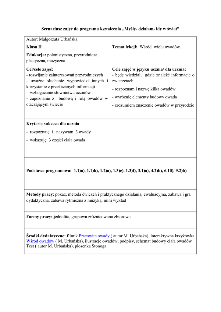 Scenariusz zajęć do programu kształcenia „Myślę- działam- idę w świat” Autor: Małgorzata Urbańska Klasa II Temat lekcji: Wśród wielu owadów. Edukacja: polonistyczna, przyrodnicza, plastyczna, muzyczna Cel/cele zajęć: - rozwijanie zainteresowań przyrodniczych - uważne słuchanie wypowiedzi innych i korzystanie z przekazanych informacji - wzbogacanie słownictwa uczniów - zapoznanie z budową i rolą owadów w otaczającym świecie Cele zajęć w języku ucznia/ dla ucznia: - będę wiedział, gdzie znaleźć informacje o zwierzętach - rozpoznam i nazwę kilka owadów - wyróżnię elementy budowy owada - zrozumiem znaczenie owadów w przyrodzie Kryteria sukcesu dla ucznia: - rozpoznaję i nazywam 3 owady - wskazuję 3 części ciała owada Podstawa programowa: 1.1)a), 1.1)b), 1.2)a), 1.3)c), 1.3)f), 3.1)a), 4.2)b), 6.10), 9.2)b) Metody pracy: pokaz, metoda ćwiczeń i praktycznego działania, ewaluacyjna, zabawa i gra dydaktyczna, zabawa rytmiczna z muzyką, mini wykład Formy pracy: jednolita, grupowa zróżnicowana zbiorowa Środki dydaktyczne: filmik Pracowite owady ( autor M. Urbańska), interaktywna krzyżówka Wśród owadów ( M. Urbańska), ilustracje owadów, podpisy, schemat budowy ciała owadów Test ( autor M. Urbańska), piosenka Stonoga Przebieg zajęć „Drogowskazy” -wskazówki i uwagi o realizacji Centra Aktywnej Edukacji 1.Oglądanie filmiku Pracowite owady ( autor M. Urbańska). matematycznoZapowiedź tematyki dzisiejszych zajęć. Rozpoznawanie owadów. przyrodnicze Dzieci same próbują ustalić kryterium sukcesu. 2. Rozwiązanie zbiorowe interaktywnej krzyżówki Wśród owadów ( autor M. Urbańska ) Chętni uczniowie podchodzą do tablicy interaktywnej i rozwiązują krzyżówkę. 3. Swobodne rozmowy na temat przedstawionych owadów. Sprawdzenie w encyklopedii znaczenia słowa : entomologia. Ułożenie z rozsypanki wyrazowej zdania: Entomologia to nauka zajmująca się owadami i przyklejenie na kółku, elemencie ,, Klasowej Stonogi” 4. Przygotowanie dla uczniów- entomologów, w przygotowanych miejscach ( książki przyrodnicze: albumy, leksykony; czasopisma ; materiały do rysowania i pisania) zadań: * Opisanie wyglądu owadów: kolor, wielkość * Budowa owada * Wyróżnienie cech charakterystycznych * Sposób odżywiania * Miejsce występowania. Podział uczniów na dowolną ilość grup, o dowolnej ilości. Liderzy wybierają spośród przygotowanych ilustracji owadów jedną, którą dokładnie ,, zbadają” i wnioski przedstawią obrazowo na przygotowanym kole- elemencie stonogi. 5. Wykonanie pracy w określonym czasie i prezentacja na forum klasy. Każda grupa prezentuje swojego owada na plakacie. Wypowiedź popierana jest ilustracjami i użyciem fachowych pojęć i nazw. Nauczyciel inspiruje uczniów słuchających do stawiania pytań. Następnie łączy koła tworząc ,, Klasową Stonogę” 6. Zabawa rytmiczna do piosenki ,, Stonoga” ( załącznik nr 1) Zwrócenie uwagi na ,, odnóża”- ustawienie symetryczne. artystycznoruchowe 7. Porównanie cech wybranych owadów . Swobodne wypowiedzi polonistycznouczniów i wybór najlepszych pomysłów ze szczególnym komunikacyjne zwróceniem uwagi na: < rolę kolorów owadów < budowę owadów, wskazanie i nazwanie części ciała owada ( odkrywanie rysunku owada , jego podpisów: głowa, tułów i odwłok- załącznik nr 2 ) < sposób odżywiania, zdecydowania : czy wskazany owad jest pożyteczny i dlaczego? 8. ,, Owady- zwiadowcy”- wysunięcie rąk przez dzieci na wysokości tułowia- czułek, zamknięcie oczu i wędrówka na dywan. 9. Wybór przez dzieci ilustracji 3 owadów i dopasowanie podpisu. Uzupełnienie kart pracy ( załącznik kryterium sukcesu. nr 3) Sprawdzenie 10. Ewaluacja.-Pajęcza nić- Uczniowie przekazując sobie kłębek wełny mówią nazwę owada, starają się nie powtarzać nazwy. Na koniec zajęć wskazują w zabawie kto jest głową, tułowiem i odwłokiem. W domu uczniowie przygotowują się do wycieczki do lasu: utrwalają zdobytą wiedzę, przynoszą kolorowe karteczki ( czarną, czerwoną, białą, żółtą) służące do obserwacji owadów oraz lupy. Odbędzie się zabawa w detektywistyczna. Załącznik nr1 13 Stonoga.mp3 ,,Stonoga " Załącznik nr 2 Załącznik nr 3 Oceń czy to prawda- P, czy fałsz- F lp 1. Zdanie Etomologia to nauka zajmująca się owadami. 2. Owady to najmniejsza na świecie grupa zwierząt. 3. Biedronka jest szkodnikiem. 4. Ciało owadów zbudowane jest z głowy i tułowia. 5. Mszyce są ulubionym pokarmem biedronek. 6. Głowa, tułów i odwłok to części ciała owadów. 7. Wszystkie biedronki mają parzystą liczbę kropek. 8. W Polsce żyją biedronki siedmiokropki. 9. Muchy żyją w wodzie. 10. Owady to najliczniejsza grupa zwierząt. P czy F
