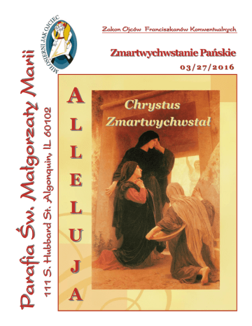 Zmartwychwstanie Pańskie 03/27/2016 111 S. Hubbard St. Algonquin, lL 60102 Parafia Św. Małgorzaty Marii Zakon Ojców Franciszkanów Konwentualnych A L L E L U J A Chrystus Zmartwychwstał OD PROBOSZCZA „Dlaczego szukacie żyjącego wśród umarłych? Nie ma Go tutaj; zmartwychwstał.” Drodzy Przyjaciele! Po intensywnym przygotowaniu w Czasie Wielkiego Postu, nastał dla nas dzień ogromnej radości, której źródłem jest prawda o Zmartwychwstaniu Jezusa Chrystusa. Jeśli Chrystus by nie zmartwychwstał, to Jego cierpienie, nie miałoby sensu. Bez zmartwychwstania miłość Chrystusa i Jego ofiara nie miałyby żadnego znaczenia. Co więcej, oznaczałoby to, że grzech, zło i śmierć zwyciężyły. Tylko jasny blask Zmartwychwstania daje sens krzyżowi na, którym Jezus przelał krew za nasze grzechy. Słowa Ewangelii wg św. Jana 20, 1-9 Pierwszego dnia po szabacie, wczesnym rankiem, gdy jeszcze było ciemno, Maria Magdalena udała się do grobu i zobaczyła kamień odsunięty od grobu. Pobiegła więc i przybyła do Szymona Piotra oraz do drugiego ucznia, którego Jezus kochał, i rzekła do nich: «Zabrano Pana z grobu i nie wiemy, gdzie Go położono». Dzięki Niedzieli Zmartwychwstania, mamy siłę do Wyszedł więc Piotr i ów drugi uczeń i szli do przeżywania Wielkich Piątków w naszym życiu. grobu. Biegli obydwaj razem, lecz ów drugi Znany artysta epoki Renesansu Michał Anioł wyraził uczeń wyprzedził Piotra i przybył pierwszy do tą prawdę w małej, marmurowej rzeźbie Chrystusa grobu. A kiedy się nachylił, zobaczył leżące Zmartwychwstałego, która obecnie znajduje się płótna, jednakże nie wszedł do środka. w Rzymie w kościele Św. Marii sopra Minerva. Nadszedł potem także Szymon Piotr, idący za nim. Wszedł on do wnętrza grobu i ujrzał leżące płótna oraz chustę, która była na Jego głowie, leżącą nie razem z płótnami, ale oddzielnie zwiniętą w jednym miejscu. Wtedy wszedł do wnętrza także i ów drugi uczeń, który przybył pierwszy do grobu. Ujrzał i uwierzył. Dotąd bowiem nie rozumieli jeszcze Pisma, które mówi, że On ma powstać z martwych. Postać Chrystusa w tej rzeźbie jest pełna chwały. Jezus stoi pewnie, ale nie jest sztywny. Jest młody, dobrze umięśniony, oraz pełen energii jak bokser przed walką, lub jak żołnierz, który powraca do domu po zwycięskiej bitwie. Zmartwychwstały Chrystus stoi sam. Jedyną drugą figurą, którą możemy zobaczyć w rzeźbie, jest krzyż. Jezus obejmuje go lewym ramieniem. W porównaniu z postacią Chrystusa, krzyż jest bardzo mały, mizerny. Jest zbyt mały, aby był użyty do ukrzyżowania Chrystusa. Krzyż jest tak drobny i lekki, że wydaje się, że Jezus trzyma go z taką łatwością, jakby trzymał bukiet kwiatów. I w tym obrazie możemy zobaczyć cały sens tej rzeźby. Dająca życie, moc Zmartwychwstałego Pana, przerosła śmiertelną moc krzyża. To jest właśnie sens Niedzieli Zmartwychwstania w naszym życiu. Prawda Zmartwychwstania sprawia, że światło nadziei świeci jasno w naszym życiu i powoduje, że nasze krzyże stają się lekkie i małe. Możemy je teraz nieść z radością, ponieważ mamy pewność, że one wiodą nas do chwalebnego zwycięstwa Zmartwychwstania. Zmartwychwstanie Chrystusa jest naszą nadzieją. Pokój i Dobro Fr. Piotr Sarnicki, OFM, Conv. CZYTANIE Z DZIEJÓW APOSTOLSKICH DZ 10, 34A. 37-43 On nam rozkazał ogłosić ludowi i dać świadectwo, że Bóg ustanowił Go sędzią żywych i umarłych. Wszyscy prorocy świadczą o tym, że każdy, kto w Niego wierzy, przez Jego imię otrzymuje odpuszczenie grzechów». Gdy Piotr przybył do domu setnika Korneliusza w Cezarei, przemówił w dłuższym wywodzie: «Wiecie, CZYTANIE Z PIERWSZEGO LISTU co się działo w całej Judei, począwszy od Galilei, po chrzcie, który głosił Jan. Znacie sprawę Jezusa ŚWIĘTEGO PAWŁA APOSTOŁA DO z Nazaretu, którego Bóg namaścił Duchem Świętym KORYNTIAN 1 KOR 5, 6B-8 i mocą. Dlatego że Bóg był z Nim, przeszedł On, dobrze czyniąc i uzdrawiając wszystkich, którzy byli Bracia: pod władzą diabła. Czyż nie wiecie, że odrobina kwasu całe ciasto A my jesteśmy świadkami wszystkiego, co zdziałał zakwasza? Wyrzućcie więc stary kwas, abyście się stali w ziemi żydowskiej i w Jeruzalem. Jego to zabili, nowym ciastem, bo przecież przaśni jesteście. zawiesiwszy na drzewie. Bóg wskrzesił Go trzeciego Chrystus bowiem został złożony w ofierze jako nasza dnia i pozwolił Mu ukazać się nie całemu ludowi, Pascha. Tak przeto odprawiajmy święto nasze, nie ale nam, wybranym uprzednio przez Boga na przy użyciu starego kwasu złości i przewrotności, lecz świadków, którzy z Nim jedliśmy i piliśmy po Jego na przaśnym chlebie czystości i prawdy. zmartwychwstaniu. CHRYSTUS ZMARTWYCHWSTAŁ ALLELUJA Parafia Św. Małgorzaty Marii 111 S. Hubbard St. Algonquin, IL www.saintmargaretmary.org PO POLSKU Biuro Parafialne 847 658-7625 Fax Parafialny 847-658-7882 Biuro Finansowe 847-658-6071 Szkoła Katolicka 847-658-5313 Szkoła Polska 224-436-0320 Biuro Katechetyczne 847-658-9339 Klasztor Franciszkański 847-658-7699 Niech Zmartwychwstały Pan dodaje nam odwagi w umieraniu dla grzechu i w rodzeniu się do nowego życia z Chrystusem. Website Niech radość i nadzieja, które płyną z pustego grobu umacniają nas każdego dnia. Niech prawda o Zmartwychwstaniu stanie się naszym udziałem i niech będzie widoczna w naszej chrześcijańskiej postawie. Biuro Parafialne Czynne: Poniedziałek - Piątek: Sobota: Niedziela: W imieniu naszej franciszkańskiej wspólnoty życzę Wam 9:00 am - 5:00 pm 11:00 am - 1:00 pm 1:00 pm - 3:00 pm Rozkład Mszy Św. Polskich Sobota: Niedziela: Poniedziałek: Dni świąteczne: I Piątek Miesiąca: 6:30 pm 1:00 pm 7:00 pm 7:30 pm 7:30 pm Radosnego Alleluja. OGŁOSZENIA W Poniedziałek Wielkanocny zapraszamy na Mszę Św. o 7 wieczorem. W piątek przypada Pierwszy Piątek Miesiąca. Msza św. o 7.