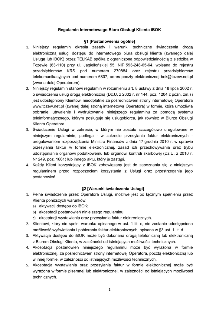 Regulamin Internetowego Biura Obsługi Klienta iBOK 1. Niniejszy regulamin §1 [Postanowienia ogólne] określa zasady i warunki techniczne świadczenia drogą elektroniczną usługi dostępu do internetowego biura obsługi klienta (zwanego dalej Usługą lub iBOK) przez TELKAB spółka z ograniczoną odpowiedzialnością z siedzibą w Tczewie (83-110) przy ul. Jagiellońskiej 55, NIP 593-248-65-64, wpisana do rejestru przedsiębiorców KRS pod numerem 270884 oraz rejestru przedsiębiorców telekomunikacyjnych pod numerem 6807, adres poczty elektronicznej [email protected] (zwana dalej Operatorem). 2. Niniejszy regulamin stanowi regulamin w rozumieniu art. 8 ustawy z dnia 18 lipca 2002 r. o świadczeniu usług drogą elektroniczną (Dz.U. z 2002 r. nr 144, poz. 1204 z późn. zm.) i jest udostępniony Klientowi nieodpłatnie za pośrednictwem strony internetowej Operatora www.tczew.net.pl (zwanej dalej stroną internetową Operatora) w formie, która umożliwia pobranie, utrwalenie i wydrukowanie niniejszego regulaminu za pomocą systemu teleinformatycznego, którym posługuje się usługobiorca, jak również w Biurze Obsługi Klienta Operatora. 3. Świadczenie Usługi w zakresie, w którym nie zostało szczegółowo uregulowane w niniejszym regulaminie, podlega - w zakresie przesyłania faktur elektronicznych uregulowaniom rozporządzenia Ministra Finansów z dnia 17 grudnia 2010 r. w sprawie przesyłania faktur w formie elektronicznej, zasad ich przechowywania oraz trybu udostępniania organowi podatkowemu lub organowi kontroli skarbowej (Dz.U. z 2010 r. Nr 249, poz. 1661) lub innego aktu, który je zastąpi. 4. Każdy Klient korzystający z iBOK zobowiązany jest do zapoznania się z niniejszym regulaminem przed rozpoczęciem korzystania z Usługi oraz przestrzegania jego postanowień. §2 [Warunki świadczenia Usługi] 1. Pełne świadczenie przez Operatora Usługi, możliwe jest po łącznym spełnieniu przez Klienta poniższych warunków: a) aktywacji dostępu do iBOK; b) akceptacji postanowień niniejszego regulaminu; c) akceptacji wystawiania oraz przesyłania faktur elektronicznych. 2. Klientowi, który nie spełni warunku opisanego w ust. 1 lit. c, nie zostanie udostępniona możliwość wyświetlania i pobierania faktur elektronicznych, opisana w §3 ust. 1 lit. d. 3. Aktywacja dostępu do iBOK może być dokonana drogą telefoniczną lub elektroniczną z Biurem Obsługi Klienta, w zależności od istniejących możliwości technicznych. 4. Akceptacja postanowień niniejszego regulaminu może być wyrażona w formie elektronicznej, za pośrednictwem strony internetowej Operatora, pocztą elektroniczną lub w innej formie, w zależności od istniejących możliwości technicznych. 5. Akceptacja wystawiania oraz przesyłania faktur w formie elektronicznej może być wyrażona w formie pisemnej lub elektronicznej, w zależności od istniejących możliwości technicznych. 1 6. Dostęp do iBOK możliwy będzie wyłącznie po podaniu nazwy użytkownika oraz hasła, udostępnionych przez Operatora. Zapis zdania pierwszego nie wyklucza możliwości samodzielnej, późniejszej zmiany hasła przez Klienta, na zasadach określonych w iBOK. §3 [Zasady korzystania z iBOK] 1. Usługa iBOK jest usługą świadczoną drogą elektroniczną i polega na udostępnieniu Klientowi przez Operatora następujących funkcjonalności, z zastrzeżeniem §2 ust. 2: a) Dane Klienta – obejmującej wgląd do swoich danych osobowych, adresowych oraz indywidualnego konta płatności; b) Obroty – obejmującej możliwość zapoznania się z listą wszystkich swoich operacji finansowych wraz ze wskazaniem salda Klienta w tym salda przeterminowanych należności; c) Usługi – obejmującej możliwość zapoznania się z wykazem usług łącznie z informacją o ich statusie, wraz ze wskazaniem opłat z nich wynikających, w tym w szczególności obowiązujących promocji; d) Rachunki – obejmującej możliwość zapoznania się z wykazem rachunków w postaci listy wystawionych faktur za usługi, a w przypadku opisanym w §4 ust. 1 również wyświetlania i pobierania faktur elektronicznych; e) Połączenia telefoniczne – obejmującej możliwość zapoznania się z wykazem połączeń telefonicznych przeprowadzonych w wybranym czasie; f) Kontakt – umożliwiającej Klientowi kontakt z Operatorem, za pośrednictwem formularza. 2. Operator zastrzega sobie możliwość dodawania nowych funkcji iBOK bez konieczności zmiany niniejszego regulaminu. 3. W przypadku, w którym okaże się to niezbędne, w szczególności w związku z koniecznością przeprowadzenia czasowej konserwacji urządzeń systemu teleinformatycznego, Operator zastrzega sobie prawo dokonywania przerw w dostępie do iBOK. Operator podejmował będzie starania, aby przerwa w dostępie do iBOK była jak najkrótsza i możliwie najmniej uciążliwa dla Klienta. 4. Korzystanie z iBOK jest dostępne w ramach Abonamentu i nie wymaga ponoszenia dodatkowych opłat przez Klienta. 5. Do poprawnego działania iBOK konieczne jest spełnienie poniższych wymagań: a) wykorzystanie przeglądarki Internet Explorer 7 lub nowszej, Mozilla Firefox, Google Chrome, Safari lub innej obsługującej cookies; b) włączona obsługa JavaScript i cookies przez przeglądarkę. §4 [Zasady korzystania z faktur elektronicznych poprzez iBOK] 1. Operator na podstawie akceptacji Klienta, podejmie decyzję o zaprzestaniu wystawiania faktur w zwykłej formie i rozpocznie ich wystawianie oraz przesyłanie wyłącznie w formie elektronicznej, zapewniając ich autentyczność i integralność, niezbędne do uznania ich za faktury elektroniczne w rozumieniu Rozporządzenia z dnia 17 grudnia 2010 r. 2. Operator poinformuje Klienta o rozpoczęciu udostępniania faktur w sposób opisany w ust. 1, w sposób opisany w §6 ust. 2. 2 3. Chwilą doręczenia faktury elektronicznej jest chwila udostępnienia faktury elektronicznej w systemie iBOK. 4. Wyrażając zgodę na udostępnianie