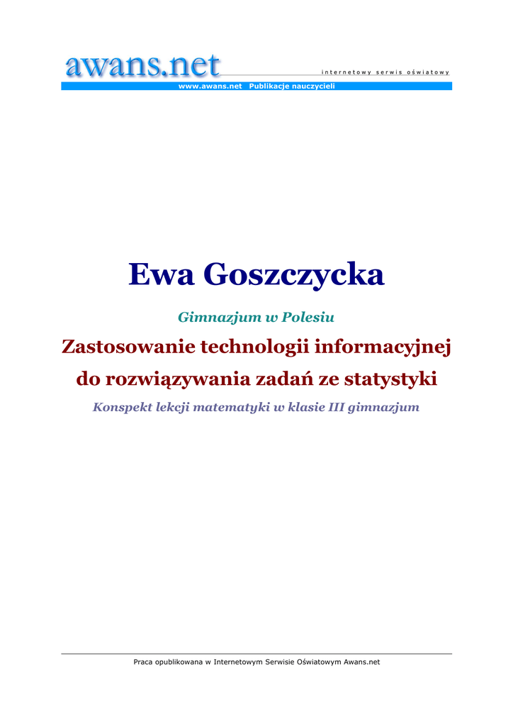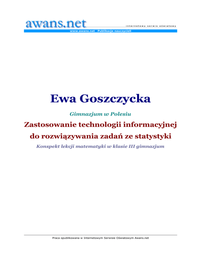 www.awans.net Publikacje nauczycieli Ewa Goszczycka Gimnazjum w Polesiu Zastosowanie technologii informacyjnej do rozwiązywania zadań ze statystyki Konspekt lekcji matematyki w klasie III gimnazjum Praca opublikowana w Internetowym Serwisie Oświatowym Awans.net Temat: Zastosowanie technologii informacyjnej do rozwiązywania zadań ze statystyki – lekcja powtórzeniowa. Program nauczania: Od Pitagorasa do Euklidesa. Nr dopuszczenia DKW – 4014-180/99. Dział programowy: Doświadczenia losowe. Czas pracy: 90 minut. Cele lekcji: Uczeń: potrafi zbierać, opracowywać i w czytelny sposób prezentować dane, zna pojęcia: średnia arytmetyczna, rozstęp, moda, mediana oraz potrafi je policzyć i zinterpretować otrzymane wyniki, potrafi podać przykłady doświadczeń losowych oraz potrafi obliczyć częstość wyniku, zna podstawowe funkcje programu Microsoft Excel i Microsoft PowerPoint - uczeń potrafi wykonać tabelę w Microsoft Excel, stosować funkcję autosumowania i średniej arytmetycznej, formatuje komórki, zamienia liczby na procenty, pisze formuły stosując adresowanie względne i bezwzględne, wykonuje wykres dobierając jego typ do zastosowania, sortuje liczby, dąży do poszerzenia swojej wiedzy i umiejętności, rozwija logiczne myślenie. Metody: problemowa, praktyczna – indywidualna praca uczniów przy komputerach. Pomoce: prezentacja multimedialna wykonana w programie Microsoft PowerPoint, komputery, podręcznik dla klasy 3 gimnazjum „Od Pitagorasa do Euklidesa”. Przebieg lekcji: 1. Czynności organizacyjne. Sprawdzenie listy obecności. Ilościowe i jakościowe sprawdzenie pracy domowej. Sformułowanie tematu lekcji. 2. Przypomnienie pojęć z działu: „Doświadczenia losowe”. Uczniowie oglądają prezentację przygotowaną przez nauczyciela, odczytując poszczególne pojęcia na głos. 3. Rozwiązywanie zadań z zastosowaniem – wykorzystywanie programu Microsoft Excel. 1) 2) 3) technologii komputerowej Zadanie 1.4/167 analiza zadania, propozycje rozwiązań, wykonanie tabeli w Microsoft Excel, Zadanie uczniów polega na zaprojektowaniu tabeli przedstawiającej podział miesięcznych wydatków pewnej rodziny, której dochód wynosi 2400,00 zł., a następnie obliczenie jaką kwotę rodzina może wpłacić na książeczkę oszczędnościową. Rodzaj Kwota wydatków żywność 1 200,00 zł odzież 288,00 zł opłaty stałe 360,00 zł książki, prasa, itp. 192,00 zł razem wydatki 2 040,00 zł oszczędności 360,00 zł dochód rodziny 2 400,00 zł 4) wykonanie procentowego diagramu rozkładu wydatków, Procentowy rozkład wydatków żywność odzież opłaty stałe książki, prasa, itp. oszczędności Zadanie 2.1/175 1) analiza zadania, 2) propozycje rozwiązań, 3) wykonanie tabeli w Microsoft Excel, Zadanie uczniów polega na wprowadzeniu do tabeli wpływów do kasy z siedmiu miesięcy, ustawieniu ich w kolejności niemalejącej oraz obliczeniu średniej arytmetycznej, rozstępu mody i mediany wpływów. Wpływy do kasy 3 500,00 zł 4 700,00 zł 5 260,00 zł 6 980,00 zł 9 200,00 zł 12 760,00 zł 13 285,00 zł średnia rozstęp mediana 7 955,00 zł 9 785,00 zł 6 980,00 zł Zadanie 2.2/176 i Zadanie 2.4/176 Są to zadania analogiczne do poprzedniego. Zadanie 3.3/185 Dana jest tabela: Liczba oczek 1 2 3 4 5 6 Liczba wyników 2 4 6 3 2 3 Zadanie uczniów polega na znalezieniu mody i mediany, obliczeniu częstości i wykonaniu diagramu procentowego częstości. Liczba oczek 1 2 3 4 5 6 ilość rzutów Liczba wyników 2 4 6 3 2 3 20 Częstość 0,1 0,2 0,3 0,15 0,1 0,15 Diagram procentowy częstości 1 2 3 4 5 6 4. Podsumowanie lekcji. Odpowiedź na pytanie: Czy komputer ułatwia nam obliczenia statystyczne i wykonywanie wykresów? 5. Ocena aktywności i pracy uczniów. Publikacja dodana do Archiwum Internetowego Serwisu Oświatowego Awans.net 19 lutego 2004 r.