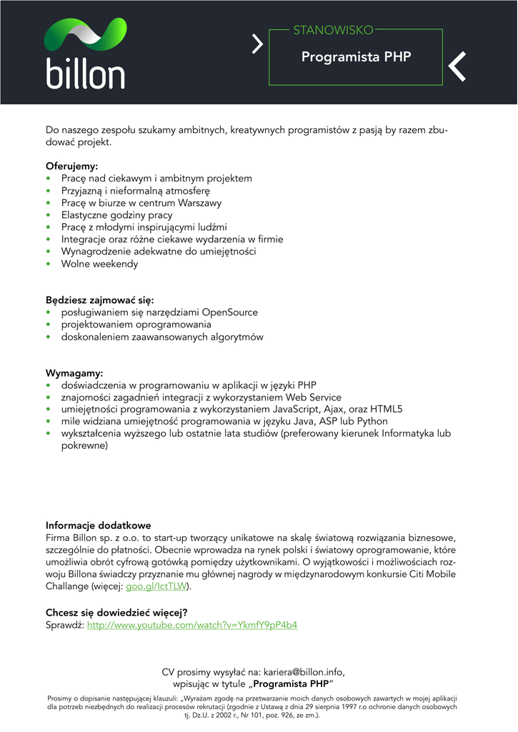 STANOWISKO Programista PHP Do naszego zespołu szukamy ambitnych, kreatywnych programistów z pasją by razem zbudować projekt. Oferujemy: • Pracę nad ciekawym i ambitnym projektem • Przyjazną i nieformalną atmosferę • Pracę w biurze w centrum Warszawy • Elastyczne godziny pracy • Pracę z młodymi inspirującymi ludźmi • Integracje oraz różne ciekawe wydarzenia w firmie • Wynagrodzenie adekwatne do umiejętności • Wolne weekendy Będziesz zajmować się: • posługiwaniem się narzędziami OpenSource • projektowaniem oprogramowania • doskonaleniem zaawansowanych algorytmów Wymagamy: • doświadczenia w programowaniu w aplikacji w języki PHP • znajomości zagadnień integracji z wykorzystaniem Web Service • umiejętności programowania z wykorzystaniem JavaScript, Ajax, oraz HTML5 • mile widziana umiejętność programowania w języku Java, ASP lub Python • wykształcenia wyższego lub ostatnie lata studiów (preferowany kierunek Informatyka lub pokrewne) Informacje dodatkowe Firma Billon sp. z o.o. to start-up tworzący unikatowe na skalę światową rozwiązania biznesowe, szczególnie do płatności. Obecnie wprowadza na rynek polski i światowy oprogramowanie, które umożliwia obrót cyfrową gotówką pomiędzy użytkownikami. O wyjątkowości i możliwościach rozwoju Billona świadczy przyznanie mu głównej nagrody w międzynarodowym konkursie Citi Mobile Challange (więcej: goo.gl/IctTLW). Chcesz się dowiedzieć więcej? Sprawdź: http://www.youtube.com/watch?v=YkmfY9pP4b4 CV prosimy wysyłać na: [email protected], wpisując w tytule „Programista PHP” Prosimy o dopisanie następującej klauzuli: „Wyrażam zgodę na przetwarzanie moich danych osobowych zawartych w mojej aplikacji dla potrzeb niezbędnych do realizacji procesów rekrutacji (zgodnie z Ustawą z dnia 29 sierpnia 1997 r.o ochronie danych osobowych tj. Dz.U. z 2002 r., Nr 101, poz. 926, ze zm.).