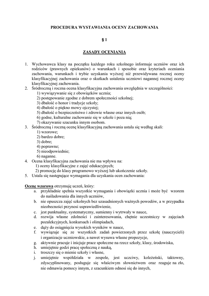 PROCEDURA WYSTAWIANIA OCENY ZACHOWANIA §1 ZASADY OCENIANIA 1. Wychowawca klasy na początku każdego roku szkolnego informuje uczniów oraz ich rodziców (prawnych opiekunów) o warunkach i sposobie oraz kryteriach oceniania zachowania, warunkach i trybie uzyskania wyższej niż przewidywana rocznej oceny klasyfikacyjnej zachowania oraz o skutkach ustalenia uczniowi nagannej rocznej oceny klasyfikacyjnej zachowania. 2. Śródroczną i roczna ocena klasyfikacyjna zachowania uwzględnia w szczególności: 1) wywiązywanie się z obowiązków ucznia; 2) postępowanie zgodne z dobrem społeczności szkolnej; 3) dbałość o honor i tradycje szkoły; 4) dbałość o piękno mowy ojczystej; 5) dbałość o bezpieczeństwo i zdrowie własne oraz innych osób; 6) godne, kulturalne zachowanie się w szkole i poza nią; 7) okazywanie szacunku innym osobom. 3. Śródroczną i roczną ocenę klasyfikacyjną zachowania ustala się według skali: 1) wzorowe; 2) bardzo dobre; 3) dobre; 4) poprawne; 5) nieodpowiednie; 6) naganne. 4. Ocena klasyfikacyjna zachowania nie ma wpływu na: 1) oceny klasyfikacyjne z zajęć edukacyjnych; 2) promocję do klasy programowo wyższej lub ukończenie szkoły. 5. Ustala się następujące wymagania dla uzyskania ocen zachowania: Ocenę wzorowa otrzymuję uczeń, który: a. przykładnie spełnia wszystkie wymagania i obowiązki ucznia i może być wzorem do naśladowania dla innych uczniów, b. nie opuszcza zajęć szkolnych bez uzasadnionych ważnych powodów, a w przypadku nieobecności przynosi usprawiedliwienie, c. jest punktualny, systematyczny, sumienny i wytrwały w nauce, d. rozwija własne zdolności i zainteresowania, chętnie uczestniczy w zajęciach pozalekcyjnych, konkursach i olimpiadach, e. dąży do osiągnięcia wysokich wyników w nauce, f. wywiązuje się ze wszystkich zadań powierzonych przez szkołę (nauczycieli) i organizacje uczniowskie, a nawet wysuwa własne propozycje, g. aktywnie pracuje i inicjuje prace społeczne na rzecz szkoły, klasy, środowiska, h. umiejętnie godzi pracę społeczną z nauką, i. troszczy się o mienie szkoły i własne, j. umiejętnie współdziała w zespole, jest uczciwy, koleżeński, taktowny, zdyscyplinowany, posługuje się właściwym słownictwem oraz reaguje na zło, nie odmawia pomocy innym, z szacunkiem odnosi się do innych, k. dba o kulturę słowa, dobre imię szkoły, o zdrowie własne i innych, higienę osobistą i estetykę wyglądu własnego oraz najbliższego otoczenia. 0cenę bardzo dobra uzyskuje uczeń, który spełnia następujące wymagania: a. bardzo dobrze wywiązuje się z obowiązków ucznia; uczęszcza systematycznie i punktualnie na zajęcia lekcyjne, wszystkie jego nieobecności są uzasadnione i usprawiedliwione; rozwija swoje zainteresowania i zdolności, uczestniczy w zajęciach pozalekcyjnych b. wyróżnia się na tle społeczności szkolnej; inicjuje i organizuje życie swojej klasy oraz szkoły, bierze udział w ważnych wydarzeniach, jest aktywny i twórczy. c. godnie reprezentuje szkołę podczas konkursów i olimpiad, dba o honor i tradycje szkoły, z szacunkiem odnosi się do symboli Gimnazjum oraz państwa.. d. wyróżnia się dbałością o kulturę słowa , nie używa wulgaryzmów, przeciwdziała procesowi degradacji mowy ojczystej. e. pamięta o podstawowych zasadach bezpieczeństwa i higieny pracy, dba o estetykę wyglądu, czystość osobistą, zdrowie fizyczne i psychiczne swoje i innych, jest asertywny, taktowny, koleżeński i prawdomówny. f. zna i stosuje zasady kulturalnego zachowania się nie tylko w szkole, ale również poza nią, nie przynosi ujmy dobremu imieniu Gimnazjum, godnie nosi imię jego ucznia. g. okazuje szacunek wszystkim pracownikom szkoły, respektuje zasady tolerancji wobec współuczniów, akceptuje odmienność ich poglądów, przekonań i wierzeń, pomaga słabszym, nie wyśmiewa ułomności fizycznych bądź umysłowych innych. 0cenę dobra otrzymuje uczeń, który spełnia następujące wymagania: a. systematycznie i punktualnie uczęszcza na zajęcia szkolne, b. nieobecności na zajęciach lekcyjnych ma usprawiedliwione, c. przestrzega zasad bhp, d. dba o podręczniki, przybory, pomoce szkole i mienie szkoły, e. stara się na miarę swych możliwości i predyspozycji osiągać pozytywne wyniki w nauce i wywiązywać się z nałożonych przez nauczyciela zadań, f. odrabia lekcje, przygotowuje się do zajęć, wykonuje zlecone przez nauczycieli prace społeczne, g. włącza się do pracy organizacji uczniowskich, stara się uczestniczyć w życiu szkoły, h. zgodnie współdziała w zespole, jest uczciwy, prawdomówny, i. dba o kulturę słowa, higienę osobistą, zdrowie własne i innych 0cene poprawna może uzyskać uczeń, jeżeli spełni następujące wymagania: a. osiąga wyniki w nauce adekwatne do możliwości, b. prezentuje poprawny stosunek do obowiązków ucznia, zasadniczo ich nie lekceważy, choć czasem nie odrabia pracy domowej lub nie przygotowuje się do lekcji, c. dość systematycznie uczęszcza na zajęcia, zdarzają mu się jednak nieuzasadnione nieobecności, d. stara się uczestniczyć w życiu klasy i szkoły, choć nie należy do najaktywniejszych uczniów, e. zwykle przestrzega kultury słowa, dba o higienę osobistą oraz zdrowie swoje i innych, nie ulega nałogom, f. unika scysji ze współuczniami, nie inicjuje ich, dba o swój dobry wizerunek w szkole i poza jej murami, g. szanuje tradycję, trud wszystkich pracowników oraz mienie szkoły. 0cenę nieodpowiednia otrzymuje uczeń, który uchybia zachowaniom, ale zastosowane środki zaradcze przynoszą oczekiwane rezultaty. a. opuszcza zajęcia bez usprawiedliwienia lub bez uzasadnionych powodów, b. niesystematycznie przygotowuje się do zajęć lekcyjnych, ma lekceważący stosunek do obowiązków szkolnych, c. nie dba o podręczniki, pomoce naukowe, sprzęt i mienie społeczne, szkolne, d. nie przestrzega zasad kulturalnego zachowania się, kultury słowa, e