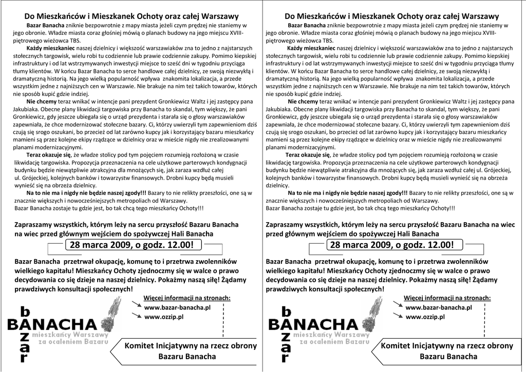 Do Mieszkańców i Mieszkanek Ochoty oraz całej Warszawy Do Mieszkańców i Mieszkanek Ochoty oraz całej Warszawy Bazar Banacha zniknie bezpowrotnie z mapy miasta jeżeli czym prędzej nie staniemy w jego obronie. Władze miasta coraz głośniej mówią o planach budowy na jego miejscu XVIIIpiętrowego wieżowca TBS. Każdy mieszkaniec naszej dzielnicy i większość warszawiaków zna to jedno z najstarszych stołecznych targowisk, wielu robi tu codziennie lub prawie codziennie zakupy. Pomimo kiepskiej infrastruktury i od lat wstrzymywanych inwestycji miejsce to sześć dni w tygodniu przyciąga tłumy klientów. W końcu Bazar Banacha to serce handlowe całej dzielnicy, ze swoją niezwykłą i dramatyczną historią. Na jego wielką popularność wpływa znakomita lokalizacja, a przede wszystkim jedne z najniższych cen w Warszawie. Nie brakuje na nim też takich towarów, których nie sposób kupić gdzie indziej. Nie chcemy teraz wnikać w intencje pani prezydent Gronkiewicz Waltz i jej zastępcy pana Jakubiaka. Obecne plany likwidacji targowiska przy Banacha to skandal, tym większy, że pani Gronkiewicz, gdy jeszcze ubiegała się o urząd prezydenta i starała się o głosy warszawiaków zapewniała, że chce modernizować stołeczne bazary. Ci, którzy uwierzyli tym zapewnieniom dziś czują się srogo oszukani, bo przecież od lat zarówno kupcy jak i korzystający bazaru mieszkańcy mamieni są przez kolejne ekipy rządzące w dzielnicy oraz w mieście nigdy nie zrealizowanymi planami modernizacyjnymi. Teraz okazuje się, że władze stolicy pod tym pojęciem rozumieją rozłożoną w czasie likwidację targowiska. Propozycja przeznaczenia na cele użytkowe parterowych kondygnacji budynku będzie niewątpliwie atrakcyjna dla mnożących się, jak zaraza wzdłuż całej ul. Grójeckiej, kolejnych banków i towarzystw finansowych. Drobni kupcy będą musieli wynieść się na obrzeża dzielnicy. Na to nie ma i nigdy nie będzie naszej zgody!!! Bazary to nie relikty przeszłości, one są w znacznie większych i nowocześniejszych metropoliach od Warszawy. Bazar Banacha zostaje tu gdzie jest, bo tak chcą tego mieszkańcy Ochoty!!! Bazar Banacha zniknie bezpowrotnie z mapy miasta jeżeli czym prędzej nie staniemy w jego obronie. Władze miasta coraz głośniej mówią o planach budowy na jego miejscu XVIIIpiętrowego wieżowca TBS. Każdy mieszkaniec naszej dzielnicy i większość warszawiaków zna to jedno z najstarszych stołecznych targowisk, wielu robi tu codziennie lub prawie codziennie zakupy. Pomimo kiepskiej infrastruktury i od lat wstrzymywanych inwestycji miejsce to sześć dni w tygodniu przyciąga tłumy klientów. W końcu Bazar Banacha to serce handlowe całej dzielnicy, ze swoją niezwykłą i dramatyczną historią. Na jego wielką popularność wpływa znakomita lokalizacja, a przede wszystkim jedne z najniższych cen w Warszawie. Nie brakuje na nim też takich towarów, których nie sposób kupić gdzie indziej. Nie chcemy teraz wnikać w intencje pani prezydent Gronkiewicz Waltz i jej zastępcy pana Jakubiaka. Obecne plany likwidacji targowiska przy Banacha to skandal, tym większy, że pani Gronkiewicz, gdy jeszcze ubiegała się o urząd prezydenta i starała się o głosy warszawiaków zapewniała, że chce modernizować stołeczne bazary. Ci, którzy uwierzyli tym zapewnieniom dziś czują się srogo oszukani, bo przecież od lat zarówno kupcy jak i korzystający bazaru mieszkańcy mamieni są przez kolejne ekipy rządzące w dzielnicy oraz w mieście nigdy nie zrealizowanymi planami modernizacyjnymi. Teraz okazuje się, że władze stolicy pod tym pojęciem rozumieją rozłożoną w czasie likwidację targowiska. Propozycja przeznaczenia na cele użytkowe parterowych kondygnacji budynku będzie niewątpliwie atrakcyjna dla mnożących się, jak zaraza wzdłuż całej ul. Grójeckiej, kolejnych banków i towarzystw finansowych. Drobni kupcy będą musieli wynieść się na obrzeża dzielnicy. Na to nie ma i nigdy nie będzie naszej zgody!!! Bazary to nie relikty przeszłości, one są w znacznie większych i nowocześniejszych metropoliach od Warszawy. Bazar Banacha zostaje tu gdzie jest, bo tak chcą tego mieszkańcy Ochoty!!! Zapraszamy wszystkich, którym leży na sercu przyszłość Bazaru Banacha na wiec przed głównym wejściem do spożywczej Hali Banacha Zapraszamy wszystkich, którym leży na sercu przyszłość Bazaru Banacha na wiec przed głównym wejściem do spożywczej Hali Banacha 28 marca 2009, o godz. 12.00! Bazar Banacha przetrwał okupację, komunę to i przetrwa zwolenników wielkiego kapitału! Mieszkańcy Ochoty zjednoczmy się w walce o prawo decydowania co się dzieje na naszej dzielnicy. Pokażmy naszą siłę! Żądamy prawdziwych konsultacji społecznych! Więcej informacji na stronach: www.bazar-banacha.pl www.ozzip.pl Komitet Inicjatywny na rzecz obrony Bazaru Banacha 28 marca 2009, o godz. 12.00! Bazar Banacha przetrwał okupację, komunę to i przetrwa zwolenników wielkiego kapitału! Mieszkańcy Ochoty zjednoczmy się w walce o prawo decydowania co się dzieje na naszej dzielnicy. Pokażmy naszą siłę! Żądamy prawdziwych konsultacji społecznych! Więcej informacji na stronach: www.bazar-banacha.pl www.ozzip.pl Komitet Inicjatywny na rzecz obrony Bazaru Banacha