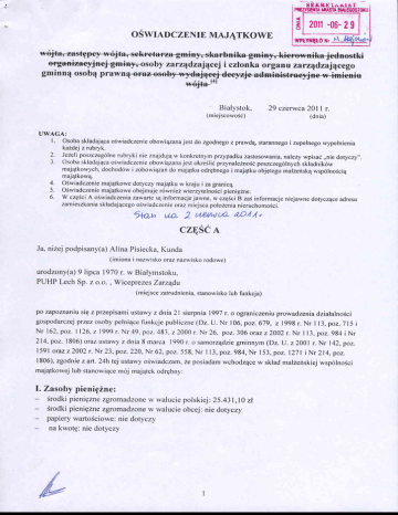 SEKRE'tanral' oswrADCZENrEMAJATKOWE @oSobyzarzqdzajacejiczlonkaorganuzarz4dzaj4cego gminn4 osobq prawnq rcyias+,;s;s# Bialystok, (miejscowoSc) 29 czerwca2jll r. (dnia) UWAGA: I . OsobaskladajqcaoSwiadczenieobowi4zanajest do zgodnego z prawdqustarannegoi zupetnegowypelnienia ka2dej z rubryk. 2. Je|eli poszczeg6lnerubryki nie znajduj4w konkretnymprzypadkuzastosowania nalezywpisai , ,,niedotyczy". 3. OsobaskladajqcaoSwiadczenieobowi4zanajest okreSlii przynale2nol(,poszczegolnychskladnik6w maj4tkowych,dochodow i zobowiqzahdo majqtkuodrgbnegoi majqtku objptegoraiz.tiskq wsp6lnoSci4 majqtkow4. 4. OSwiadczeniemaj4tkowedotyczy maj4tku w kraju i za granicq. 5. oswiadczeniemaj4tkoweobejmujer6wnie2wierzytelnoscipieniqzne. 6. W czgSciA oSwiadczenia zawafiesq informacjejawne, w czgsciB zaSinformacjeniejawnedotycz4ceadresu zamieszkania sklada.i4cego o5wiadczenie oraz mie.jsca poloZenianieruchomoSci. 5tOn u(A 2 o4f//4)6- APl / " CZ\ Sca Ja, nilej podpisany(a) Alina Pisiecka,Kunda (imiona i nazwiskooraznazwiskorodowe) urodzony(a) 9 lipca 1970r. w Bialymstoku. PUHPLechSp.z o.o., Wiceprezes Zarzqdu (miejsce zatrudnienia, stanowisko lub funkcja) po zapoznaniu sig z przepisamiustawyz dnia2l sierpnia1997r. o ograniczeniuprowadzeniadzialalnoSci gospodarczej przezosobypelni4cefunkcjepubliczne(Dz. U. Nr 106,po2.679, z 1998r. Nr I 13,poz.715i N r l 6 2 , p o z . 1 1 2 6 . 2 1 9 9 9 r . N r 4 9 , p o 2 . 1 8 3 . 2 2 0 0 0 r . N r 2p6o,z . 3 0 6 o r a z z 2 0 0 2 r . N r l l 3 , p o z . 9 8 4 i N r 2 1 4 , p o z '1 8 0 6 )o r a zu s t a w yz d n i a 8 m a r c a 1 9 9 0r . o s a m o r z 4 d zgi em i n n y m( D z . U . z 2 0 0 l r . N r l 4 2 , p o z . l 5 9 l o r a z z 2 0 0 2 r . N r 2 3 , p o z . 2 2 0 , N r 6 2 , p o z . 5 5 8 , N r l l 3 , p o z . 9 8 4 , N r l 5 3 , p o z . l i2N7rl2 1 4 , p o z . 1806),zgodniezart.24h tej ustawyoSwiadczanr, 2e posiadamwchodz4cew skladmal2e6skiejwsp6lnoSci maj4tkorvejlub stanowiqcern6j rnajqtekodrpbny: I. ZasobypienipZne: Srodkipieniqznezgromadzone w waluciepolskiej:25.431,10zl SrodkipienipZnezgromadzonew walucie obcej: nie dotyczy papierywartoSciowe:nie dotyczy na kwotQ:nie dotyczy II. l. Dom o powierzchni: 192,9m2, na dzialceo pow. 1700m2 o wartoSci:ok. 650 tys.zl tytul prawny: wlasnoS6(malzeriskawsp6lnoS6maj4tkowa) 2. Mieszkanieo powierzchni: 58,90 m2 z piwnicqo pow. 5,3 m2 i udzialem 642015406700 czgsci we wsp6lwlasnoSci nieruchomoSci wsp6lnejo powierzchni10,3208ha o wartoSci:ok. 220 tvs. zl tytul prawny:wlasnoScw udzialel16 czEici(maj4tekodrEbny) 3. Gospodarstwo rolne:nie dotyczy rodzajgospodarstwa:nie dotyczy. powierzchnia:nie dotyczy o wartoSci:nie dotyczy, rodzalzabudowy:nie dotyczy tytul prawny:nie dotyczy Ztego tytulu osi4gn4lem(glam) w roku ubieglymprzych6di doch6dw wysokoSci:nie dotyczy 4. Inne nieruchomoSci:nie dotyczy powierzchnia:nie dotyczy o wartoSci:nie dotyczy tytul prawny: nie dotyczy III. Posiadamudzialy w sp6lkachhandlowych- nalezypodai liczbEi emitentaudzial6w: nie dotyczy udzialy te stanowi4pakiet wiEkszyniz l0o/oudzial6w w sp6lce:nie dotyczy Ztego tytulu osi4gn4lem(Elam) w roku ubieglymdoch6dw wysokoSci:nie dotyczy IV. Posiadamakcjew sp6lkachhandlowych- nalezypodacliczbgi emitentaakcji: nie dotyczy akcje te stanowiqpakiet wiEkszy niz l0o/oakcji w sp6lce:nie dotyczy Ztego tytulu osi4gnqlem(Elam) w roku ubieglym doch6dw wysokoSci:. nie dotyczy V. Nabylem(am)(nabyt moj malzonek,zwyl4czeniemmienia przynale2negodo jego majEtku odrEbnego)od SkarbuParistwa,innej paristwowejosoby prawnej,jednostek samorz4du terytorialnego,ich zwiqzkow lub od komunalnejosobyprawnej nastEpuj4ce mienie, kt6re podlegalozbyciu w drodze przetargu- naleZypodai opis mienia i datg nabycia,od kogo: nie dotyczy VI. l. ProwadzgdzialalnoSc gospodarczqlzl (nalezypodaiformgprawn4i przedmiot dzialalnoSci): nie dotyczy osobiScie nie dotyczy wsp6lniezinnymi osobaminie dotyczy Ztego tytulu osi4gn4lem(glam)w roku ubieglym przych6di doch6d w wysokoSci:nie dotyczy 2. ZarzqdzamdzialalnoSci4gospodarcz.qlubjestem przedstawicielem,pelnomocnikiemtakiej nie dotyczydzialalnoSci (naleZypoda6formgprawn4i przedmiot dzialalnoSci): nie dotyczy osobiScie nie dotyczy wsp6lniez innymi osobaminie dotyczy Z tegotytulu osi4gn4lem(Etam) w roku ubieglym doch6dw wysokoSci:nie dotyczy VII. I . W sp6lkachhandlowych(nazwa,siedziba sp6lki):PUHPLechSp.z o.o.,ul. Kombatant6w 4. I 5-I I 0 Bialystok jestem czlonkiem zarz4du(od kiedy):2 czerwca20ll r. jestem czlonkiem rudy nadzorczej(od kiedy):nie dotyczy jestemczlonkiemkomisji rewizyjnej(od kiedy) Ztego tytulu osi4gn4lem(glam)w roku ubieglym doch6dw wysokoSci: nie dotyczy 2. W sp6ldzielniach: nie doryczy jestemczlonkiemzarzqdu(od kiedy): nie dotyczy jestem czlonkiem rady nadzorczeil3l (od kiedy):nie dotyczy jestemczlonkiemkomisji rewizyjnej(od kiedy): nie dotyczy Ztego tytulu osi4gn4lem(glam) w roku ubieglymdoch6dw wysokoSci:nie dotyczy 3. w fundacjachprowadz4cychdzialalnosi gospodarczq:nie dotyczy jestemczlonkiemzarzqdu(od kiedy):nie dotyczy jestem czlonkiem rady nadzorczej(od kiedy):nie dotyczy jestem czlonkiem komisji rewizyjnej (od kiedy): nie dotyczy ztego tytulu osi4gn4lem(plam) w roku ubieglymdoch6dw wysokosci: VIII. Innedochodyosi4gane z tytulu zatrudnienia lub innejdzialalnoSci zarobkowejlub zajgc,z podaniem kwotuzyskiwanych zkaldegotytulu: - zatrudnienie - 35.g99,g4 w urzgdzieMiejskimw Bialymstoku zl - zatrudnienie w PUHPLechSp.z o.o.- 20.877,80 zl IX. Skladnikimieniaruchomegoo wartoScipowyzej l0 000 zlotych(wprzypadku pojazd6w mechanicznych nale2ypodacmarkg.modeli rok produkcji): NissanQashqai2007- wlasnoSi (malzet'rska wsp6lnoScmaj4tkowa) X. Zobowiqzaniapienig2neo wartoScipowy2ej l0 000 zlotych,w tym zaci4gnigtekredytyi poLyczki otaz warunki, na jakich zostalyudzielone (wobeckogo,w zwiqzkuz jakim zdarzeniem, w jakiejwysokoSci): - kredyt hipotecznyna zakup nieruchomoScigruntowejzabudowanej domemjednorodzinnymw Kredyt Bank SA I Odzialw Bialymstoku- 69.723,50zl - kredyt got6wkowy nazakup samochoduw BNP ParibasFortis w Bialymstoku - 19.091,73 zl Powy2szeoSwiadczenieskl