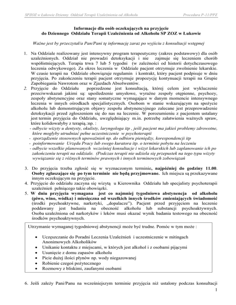 SPZOZ w Łukowie Dzienny Oddział Terapii Uzależnienia od Alkoholu Procedura P-11/PPZ Informacje dla osób oczekujących na przyjęcie do Dziennego Oddziału Terapii Uzależnienia od Alkoholu SP ZOZ w Łukowie Ważne jest by przeczytał/a Pan/Pani tę informację zaraz po wyjściu z konsultacji wstępnej 1. Na Oddziale realizowany jest intensywny program terapeutyczny (zakres podstawowy) dla osób uzależnionych. Oddział nie prowadzi detoksykacji i nie zajmuje się leczeniem chorób współistniejących. Terapia trwa 7 lub 5 tygodni (w zależności od historii dotychczasowego leczenia odwykowego). Za okres leczenia w Oddziale pacjent otrzymuje zwolnienie lekarskie. W czasie terapii na Oddziale obowiązuje regulamin i kontrakt, który pacjent podpisuje w dniu przyjęcia. Po zakończeniu terapii pacjent otrzymuje propozycję kontynuacji terapii na Grupie Zapobiegania Nawrotom oraz w Zjazdach Absolwentów. 2. Przyjęcie do Oddziału poprzedzone jest konsultacją, której celem jest wykluczenie przeciwwskazań jakimi są: upośledzenie umysłowe, wyraźne zespoły otępienne, psychozy, zespoły abstynencyjne oraz stany somatyczne wymagające w danym momencie intensywnego leczenia w innych ośrodkach specjalistycznych. Osobom w stanie wskazującym na spożycie alkoholu lub demonstrującym objawy zespołu abstynencyjnego zalecane jest przeprowadzenie detoksykacji przed zgłoszeniem się do nas na leczenie. W porozumieniu z pacjentem ustalany jest termin przyjęcia do Oddziału, uwzględniający m.in. potrzebę załatwienia ważnych spraw, które kolidowałyby z terapią.:np. : - odbycie wizyty u dentysty, okulisty, laryngologa itp , jeśli pacjent ma jakieś problemy zdrowotne, które mogłyby utrudniać pełne uczestniczenie w psychoterapii - sporządzenie stosownych upoważnień np. do odbioru pieniędzy, korespondencji itp - poinformowanie Urzędu Pracy lub swego kuratora itp. o terminie pobytu na leczeniu - odbycie wszelkie planowanych wcześniej konsultacje i wizyt lekarskich lub zaplanowanie ich po zakończeniu terapii na oddziale. (Podczas terapii nie udziela się przepustek na tego typu wizyty wywiązanie się z różnych terminów prawnych i innych terminowych zobowiązań 3. Do przyjęcia trzeba zgłosić się w wyznaczonym terminie, najpóźniej do godziny 11.00. Osoby zgłaszające się po tym terminie nie będą przyjmowane. Ich miejsca są przekazywane innym oczekującym na przyjęcie. 4. Przyjęcie do oddziału zaczyna się wizytą u Kierownika Oddziału lub specjalisty psychoterapii uzależnień pełniącego takie obowiązki. 5. W dniu przyjęcia wymagana jest co najmniej tygodniowa abstynencja od alkoholu (piwo, wino, wódka) i miesięczna od wszelkich innych środków zmieniających świadomość (środki psychoaktywne, narkotyki, „dopalacze”). Pacjent przed przyjęciem na leczenie poddawany jest badaniu na obecność alkoholu lub substancji psychoaktywnych. Osoba uzależniona od narkotyków i leków musi okazać wynik badania testowego na obecność środków psychoaktywnych. Utrzymanie wymaganej tygodniowej abstynencji może być trudne. Pomóc w tym może : Uczęszczanie do Poradni Leczenia Uzależnień i uczestniczenie w mitingach Anonimowych Alkoholików Unikanie kontaktu z miejscami, w których jest alkohol i z osobami pijącymi Usunięcie z domu zapasów alkoholu Picie dużej ilości płynów np. wody niegazowanej Robienie czegoś pożytecznego Rozmowy z bliskimi, zaufanymi osobami 6. Jeśli zależy Pani/Panu na wcześniejszym terminie przyjęcia niż ustalony podczas konsultacji 1 SPZOZ w Łukowie Dzienny Oddział Terapii Uzależnienia od Alkoholu Procedura P-11/PPZ wstępnej, to można dowiadywać się o wolne miejsce w każdy piątek o godzinie 12.00. Telefon w sprawie przyspieszenia przyjęcia musi Pani/Pan wykonać osobiście, a nie ktoś w Pani/Pana imieniu. Należy dzwonić pod numer 25 / 798 48 80. Jeśli okaże się, że jest wolne miejsce, proszę liczyć się z tym, że trzeba będzie zgłosić się na oddział jeszcze tego samego dnia. 7. Jeśli rozpoczęcie terapii w umówionym wcześniej terminie okaże się niemożliwe, prosimy o jak najwcześniejsze powiadomienie nas o tym. Termin ten będzie wykorzystany przez inną oczekującą osobę. 8. Co zabrać ze sobą do oddziału ? A. Skierowanie na leczenie odwykowe wystawione przez lekarza lub Postanowienie Sądu o zobowiązaniu do leczenia. (Ta kartka, którą teraz Pan/Pani czyta - nie jest skierowaniem). B. 2 grube zeszyty i długopis C. Sztućce, kubeczek D. Dokument tożsamości zawierający numer PESEL E. Na oddziale nie są podawane środki farmakologiczne typu anticol, esperal. W Oddziale nie są leczone choroby współistniejące. Jeśli choruje Pani/Pan jeszcze na inną przewlekłą chorobę poza alkoholizmem, proszę wziąć ze sobą dokumentację medyczną oraz leki na cały okres pobytu na oddziale zlecone przez lekarza prowadzącego. Jeśli leczył się Pan/Pani psychiatrycznie lub odwykowo proszę przywieźć karty informacyjne z pobytów w szpitalu. F. Jeśli ma Pani/Pan problemy z widzeniem, proszę nie zapomnieć o zabraniu ze sobą okularów; jeśli problemy ze słuchem, konieczny jest aparat słuchowy. Jeśli nie ma ich Pani/Pan – proszę wykorzystać czas oczekiwania na rozpoczęcie leczenia - na zaopatrzenie się w okulary lub aparat. Dobre widzenie i słyszenie jest zasadniczym warunkiem przyjęcia na leczenie w naszej placówce. Proszę nie zabierać ze sobą: 1. Kosmetyków na bazie alkoholu (perfumy, wody kolońskie, itp.), oraz gumy do żucia, cukierków miętowych (lub innych aromatycznych). Nie chcemy Pani/Pana podejrzewać o tłumienie tymi środkami woni alkoholu lub innego środka. 2. Książek i czasopism, laptopa, sprzętu rtv, kart i jakichkolwiek gier. Czas terapii ma być okresem wzmożonej koncentracji na zasadniczej przyczynie Pani/Pana kłopotów, czyli uzależnieniu. 3. Jeśli nie ma bezwzględnej konieczności, to zachęcamy do niezabierania oddział telefonu