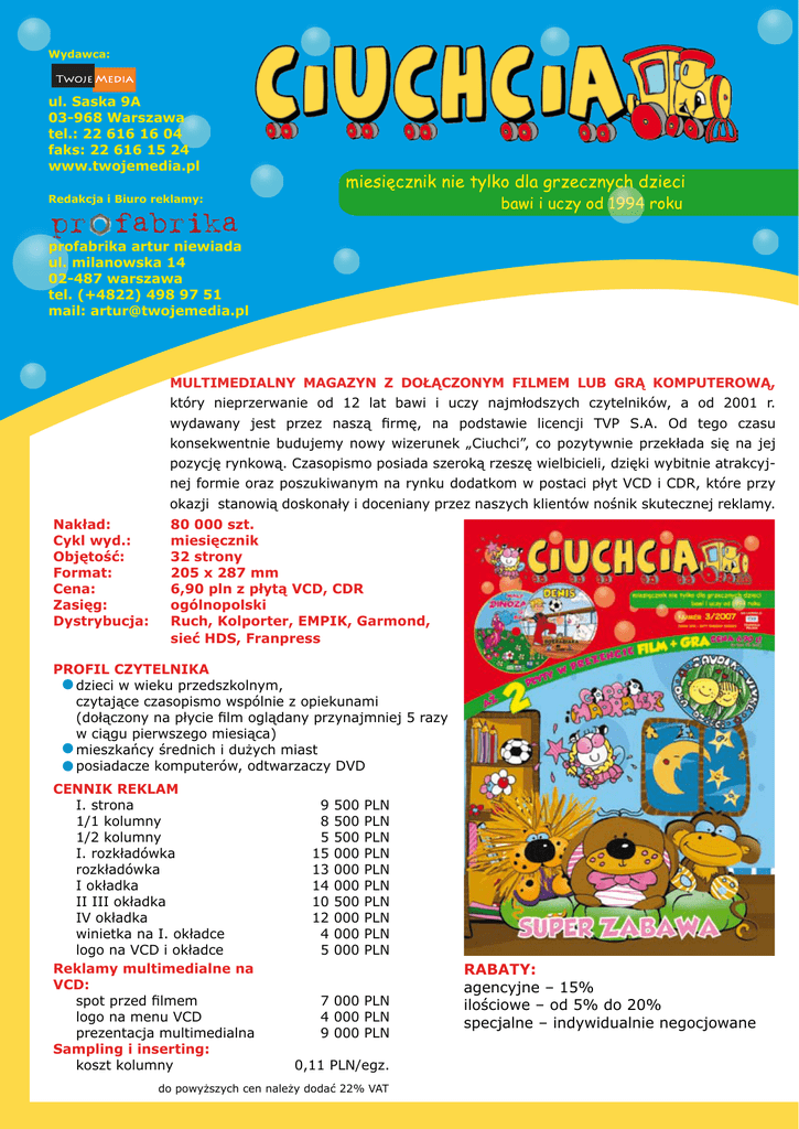 Wydawca: ul. Saska 9A 03-968 Warszawa tel.: 22 616 16 04 faks: 22 616 15 24 www.twojemedia.pl Redakcja i Biuro reklamy: profabrika artur niewiada ul. milanowska 14 02-487 warszawa tel. (+4822) 498 97 51 mail: [email protected] MULTIMEDIALNY MAGAZYN Z DOŁĄCZONYM FILMEM LUB GRĄ KOMPUTEROWĄ, który nieprzerwanie od 12 lat bawi i uczy najmłodszych czytelników, a od 2001 r. wydawany jest przez naszą firmę, na podstawie licencji TVP S.A. Od tego czasu konsekwentnie budujemy nowy wizerunek „Ciuchci”, co pozytywnie przekłada się na jej pozycję rynkową. Czasopismo posiada szeroką rzeszę wielbicieli, dzięki wybitnie atrakcyjnej formie oraz poszukiwanym na rynku dodatkom w postaci płyt VCD i CDR, które przy okazji stanowią doskonały i doceniany przez naszych klientów nośnik skutecznej reklamy. Nakład: Cykl wyd.: Objętość: Format: Cena: Zasięg: Dystrybucja: 80 000 szt. miesięcznik 32 strony 205 x 287 mm 6,90 pln z płytą VCD, CDR ogólnopolski Ruch, Kolporter, EMPIK, Garmond, sieć HDS, Franpress PROFIL CZYTELNIKA dzieci w wieku przedszkolnym, czytające czasopismo wspólnie z opiekunami (dołączony na płycie film oglądany przynajmniej 5 razy w ciągu pierwszego miesiąca) mieszkańcy średnich i dużych miast posiadacze komputerów, odtwarzaczy DVD CENNIK REKLAM I. strona 1/1 kolumny 1/2 kolumny I. rozkładówka rozkładówka I okładka II III okładka IV okładka winietka na I. okładce logo na VCD i okładce Reklamy multimedialne na VCD: spot przed filmem logo na menu VCD prezentacja multimedialna Sampling i inserting: koszt kolumny 9 8 5 15 13 14 10 12 4 5 500 500 500 000 000 000 500 000 000 000 PLN PLN PLN PLN PLN PLN PLN PLN PLN PLN 7 000 PLN 4 000 PLN 9 000 PLN 0,11 PLN/egz. do powyższych cen należy dodać 22% VAT RABATY: agencyjne – 15% ilościowe – od 5% do 20% specjalne – indywidualnie negocjowane Reklamy na płyty VCD można dostarczyć na następujących nośnikach: - beta analogowa - beta cyfrowa - mini DVD Reklamy prasowe przyjmujemy jako pliki w następujących formatach: · PDF 1.3, 1.4 · JPG ( 300 DPI z najwyższą jakością) · TIFF Reklama powinna mieć spady 5 mm, które zostają obcięte w trakcie druku. W przypadku reklam pionowych, zajmujących pół albo 1/3 strony, prosimy o nie umieszczanie spadów po lewej stronie, jeśli reklama ma się znaleźć na stronie prawej (nieparzystej) albo po prawej stronie, jeśli reklama ma się znaleźć na stronie lewej (parzystej). W przypadku reklam poziomych, jeśli mają się znaleźć na górze strony, spadów nie powinno być na dole, natomiast jeśli znajdą się na dole strony, spadów nie powinno być na górze. Elementy istotne (tekst, logo itp.) powinny znajdować się nie mniej niż 3 mm od miejsca obcięcia reklamy (zakładając 5 mm spad będzie to 8 mm od brzegu). Uwaga! Grzbiet pisma jest zszywany w związku z tym, zaleca się nie umieszczanie istotnych informacji ! Wymiary reklam netto: · Cała strona – 205 x 290 mm · Pół strony – pion 102,5 x 290 mm , poziom 205 x 145 mm · 1/3 strony – pion 68,33 x 290 mm, poziom 205 x 96,66 mm Do podanych wymiarów trzeba doliczyć po 5 mm na spady. Dostarczenie odbitki próbnej (Cromalin, Matchprint etc.) obliguje pismo do odtworzenia kolorów reklamy w druku. Odbitkami próbnymi nie są wydruki z drukarek atramentowych, laserowych etc. Reklamy prosimy przesyłać drogą elektroniczną równolegle na adresy: [email protected], [email protected], [email protected] lub pocztą (na nośnikach CDR): PROFABRIKA ul. Milanowska 14 02-487 Warszawa e-mail: [email protected]