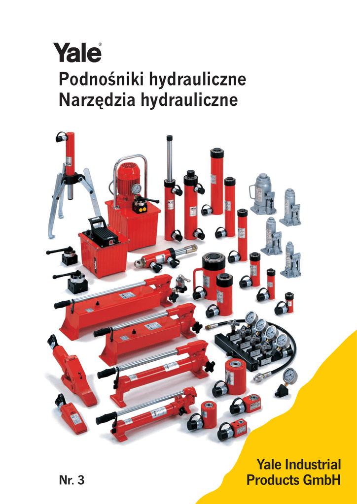Podnośniki hydrauliczne Narzędzia hydrauliczne Nr. 3 Yale Industrial Products GmbH Cylindry uniwersalne Niskie i płaskie cylindry jednostronnego działania z powrotem sprężynowym, 5 do 100 ton, maksymalne ciśnienie robocze: 700 bar jednostronnego działania z powrotem sprężynowym, 10 do 100 ton, maksymalne ciśnienie robocze: 700 bar Do wszystkich uniwersalnych zastosowań wymagających wysokich sił i małych rozmiarów urządzenia jednocześnie. Solidna konstrukcja cylindra, wykonana z masywnej stali chromowo-molibdenowej z twardym chromowanym tłokiem oraz długimi prowadnicami z brązu. Zestaw zawiera siodło, gwinty mocujące oraz złączkę żeńską. Te kompaktowe cylindry hydrauliczne zostały zaprojektowane do takich zastosowań jak podnoszenie i ustawianie jak również do wszelkich podstawowych robót konserwacyjnych wymagających dużej siły, niedużych rozmiarów, małej masy i poręczności urządzenia. Zestaw zawiera złączkę żeńską. YLS YFS Typ Nośność Skok Wysokość maks. Rozmiar cylindra kN mm mm tony 5 YS - 5/15 YS - 5/25 YS - 5/75 YS - 5/127 YS - 5/180 50 50 50 50 50 15 25 75 127 180 45 97 157 214 267 10 20 30 50 100 10 YS - 10/25 YS - 10/50 YS - 10/100 YS - 10/150 YS - 10/200 YS - 10/250 YS - 10/300 100 100 100 100 100 100 100 25 50 100 150 200 250 300 90 125 178 250 300 352 407 10 20 30 50 100 YS - 15/25 YS - 15/50 YS - 15/100 YS - 15/150 YS - 15/200 YS - 15/250 YS - 15/300 YS - 15/350 150 150 150 150 150 150 150 150 25 50 100 150 200 250 300 350 110 140 190 260 310 365 420 472 YS - 23/25 YS - 23/50 YS - 23/100 YS - 23/160 YS - 23/210 YS - 23/250 YS - 23/300 YS - 23/345 230 230 230 230 230 230 230 230 25 50 100 160 210 250 300 345 116 150 202 277 330 376 428 477 YS - 30/125 YS - 30/200 300 300 125 200 245 325 YS - 50/50 YS - 50/100 YS - 50/160 YS - 50/320 500 500 500 500 50 100 160 320 170 220 285 460 70 YS - 70/150 YS - 70/330 700 700 150 330 285 490 100 YS - 100/100 YS - 100/200 1000 1000 100 200 275 375 Rozmiar cylindra tony 15 23 30 50 Typ Nośność Skok Wysokość maks. kN mm mm YLS - 10/35 YLS - 20/45 YLS - 30/60 YLS - 50/60 YLS - 100/55 100 200 300 500 1000 35 45 60 60 55 86 100 120 122 141 YFS - 10/11 YFS - 20/15 YFS - 30/15 YFS - 50/15 YFS - 100/15 100 200 300 500 1000 11 15 15 15 15 43 60 60 70 91 Cylindry ściągające jednostronnego działania z powrotem sprężynowym, 10 do 51 ton siły ciągnącej, maksymalne ciśnienie robocze: 700 bar Te cylindry ściągające charakteryzują się dużą siłą ciągnącą regulowaną z dużą precyzyjnością przy pomocy pomp ręcznych i zasilaczy elektrycznych. Cylindry zostały wykonane ze stali chromowo-molibdenowej, zestaw zawiera kute ogniwa, rączkę do noszenia oraz złączkę żeńską. Rozmiar cylindra Typ 2 Skok Odległość między ogniwami kN mm mm 100 200 300 510 150 150 150 150 750 795 875 955 max. tony 10 20 30 51 Nośność YPL - 10/150 YPL - 20/150 YPL - 30/150 YPL - 51/150 Puste cylindry Cylindry uniwersalne jednostronnego działania z powrotem sprężynowym, 12 do 93 ton, maksymalne ciśnienie robocze: 700 bar obustronnego działania z powrotem hydraulicznym 5 do 200 ton, maksymalne ciśnienie robocze: 700 bar Dzięki konstrukcji otworu środkowego możliwe jest włożenie gwintowanego pręta wewnątrz cylindra, co zapewnia niezwykle duże siły ciągu w zastosowaniach takich jak wywoływanie naprężeń wstępnych w śrubach fundamentowych, usuwanie osi i tulei, rury wyciągowe, w ciągarkach oraz innych podobnych zastosowaniach. Zestaw zawiera siodło, gwinty mocujące oraz żeńską złączkę. Cylindry obustronnego działania o dużej prędkości powrotnej. Szybki powrót tłoka, znacznie wydłużone prowadnice tłoka oraz najwyższej jakości materiały sprawiają, że te cylindry są niezwykle wytrzymałe i sprostają nawet najtrudniejszym zadaniom. Zestaw obejmuje siodło, gwinty mocujące oraz dwie złączki żeńskie. Rozmiar cylindra tony Typ ø otworu Siła ciągnąca Skok kN mm mm Rozmiar cylindra tony 5 środk. 12 YCS - 12/40 YCS - 12/75 120 120 40 75 20 20 21 YCS - 21/50 YCS - 21/150 214 214 50 150 27 27 33 YCS - 33/60 YCS - 33/150 335 335 60 150 33 33 57 YCS - 57/70 567 70 42 62 YCS - 62/150 618 150 55 93 YCS - 93/75 930 75 80 Puste cylindry ø otworu Siła ciągnąca Skok kN mm mm YH - 5/30 YH - 5/80 YH - 5/150 50 50 50 30 80 150 160 210 280 10 YH - 10/30 YH - 10/80 YH - 10/150 YH - 10/250 100 100 100 100 30 80 150 250 175 225 295 395 20 YH - 20/50 YH - 20/150 YH - 20/250 200 200 200 50 150 250 195 310 410 30 YH - 30/200 YH - 30/350 300 300 200 350 355 510 50 YH - 50/150 YH - 50/350 YH - 50/500 500 500 500 150 350 500 325 525 685 70 YH - 70/150 YH - 70/350 700 700 150 350 335 540 100 YH - 100/50 YH - 100/150 YH - 100/350 YH - 100/500 1000 1000 1000 1000 50 150 350 500 265 365 565 725 200 YH - 200/150 YH - 200/350 YH - 200/500 2000 2000 2000 150 350 500 410 620 780 obustronnego działania z powrotem hydraulicznym 33 do 140 ton, maksymalne ciśnienie robocze: 700 bar Identyczne zastosowanie jak w przypadku modeli YCS, jednak w tej linii produktów oferuje hydrauliczny powrót tłoka dzięki drugiemu złączu olejowemu, przydatny w cyklicznych zastosowaniach ciągnących. Typ środk. Rozwieracze hydrauliczne jednostronnego działania z powrotem sprężynowym Rozmiar Typ cylindra tony ø otworu Siła ciągnąca Skok kN mm mm środkowego Rozwieracze hydrauliczne to uniwersalne narzędzia mechaniczne wykorzystywane do wszelkiego rodzaju napraw, np. ustawianie kontenerów oraz pokryw, podnoszenie, pozycjonowanie lub ustawianie elementów konstrukcyjnych, zdejmowanie szalunków i form. 33 33 YCH - 33/150 YCH - 33/250 335/180 335/180 150 250 33 33 Maks. ciśnienie robocze: 700 bar, zestaw zawiera złączkę żeńską. 62 YCH - 62/250 618/300 250 55 Typ 93 YCH - 93/250 930/450 250 55 100 YCH - 100/40 1000/500 40 55 140 YCH - 140/200 1400/700 200 80 YHS - 05 YHS - 11 YHS - 15 Maksymalna nośność Szerokość rozwarcia mm Objętość oleju Masa kN ton min. maks. cm3 kg 5 10